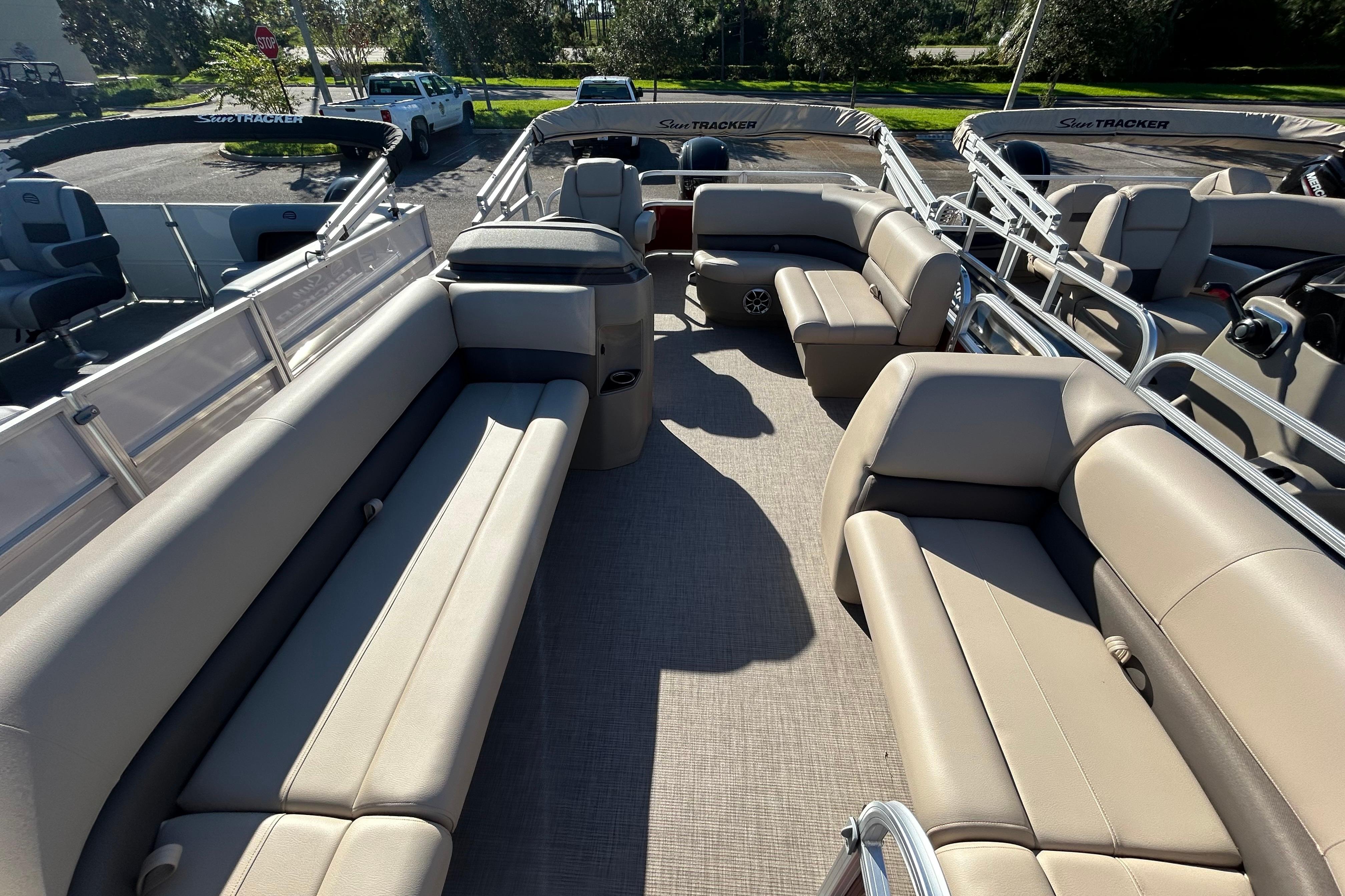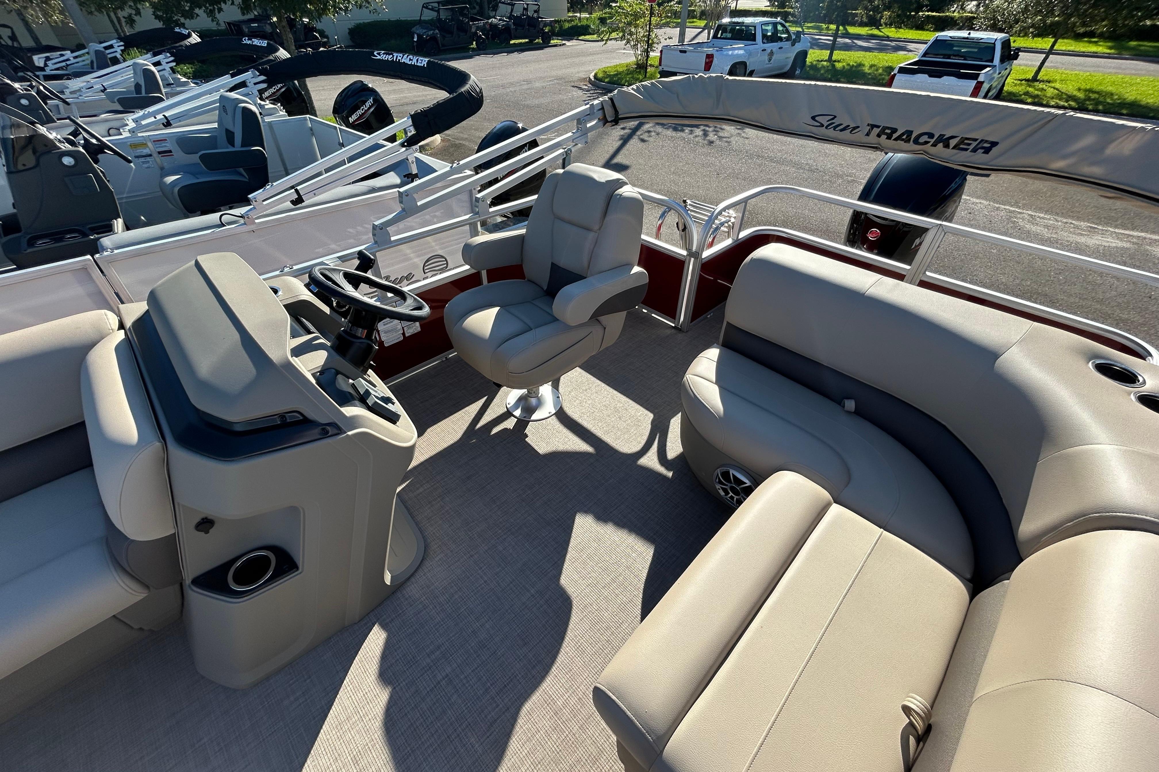 When the sun is high, raise the 9' bimini top for some shade. Create the ideal soundtrack for your adventure with the standard Wet Sounds® stereo and 2 upholstery speakers. The SUN TRACKER FLARE touch-screen gauge display and 12-button switch panel give you ultimate control over your boating experience.