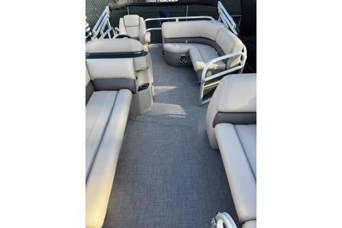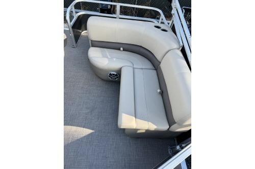 Upgrade your explorations with the 2025 PARTY BARGE® 18 DLX! Fit up to 9 passengers in this quality pontoon boat. They can relax on one of the 3 lounge couches while the pilot stays comfortable in the swiveling, telescoping captain's chair. Those lounges feature under-seat storage with plenty of space to hold all you need for today's aquatic adventure. The console also features a hidden storage space perfect for stowing away a cooler.