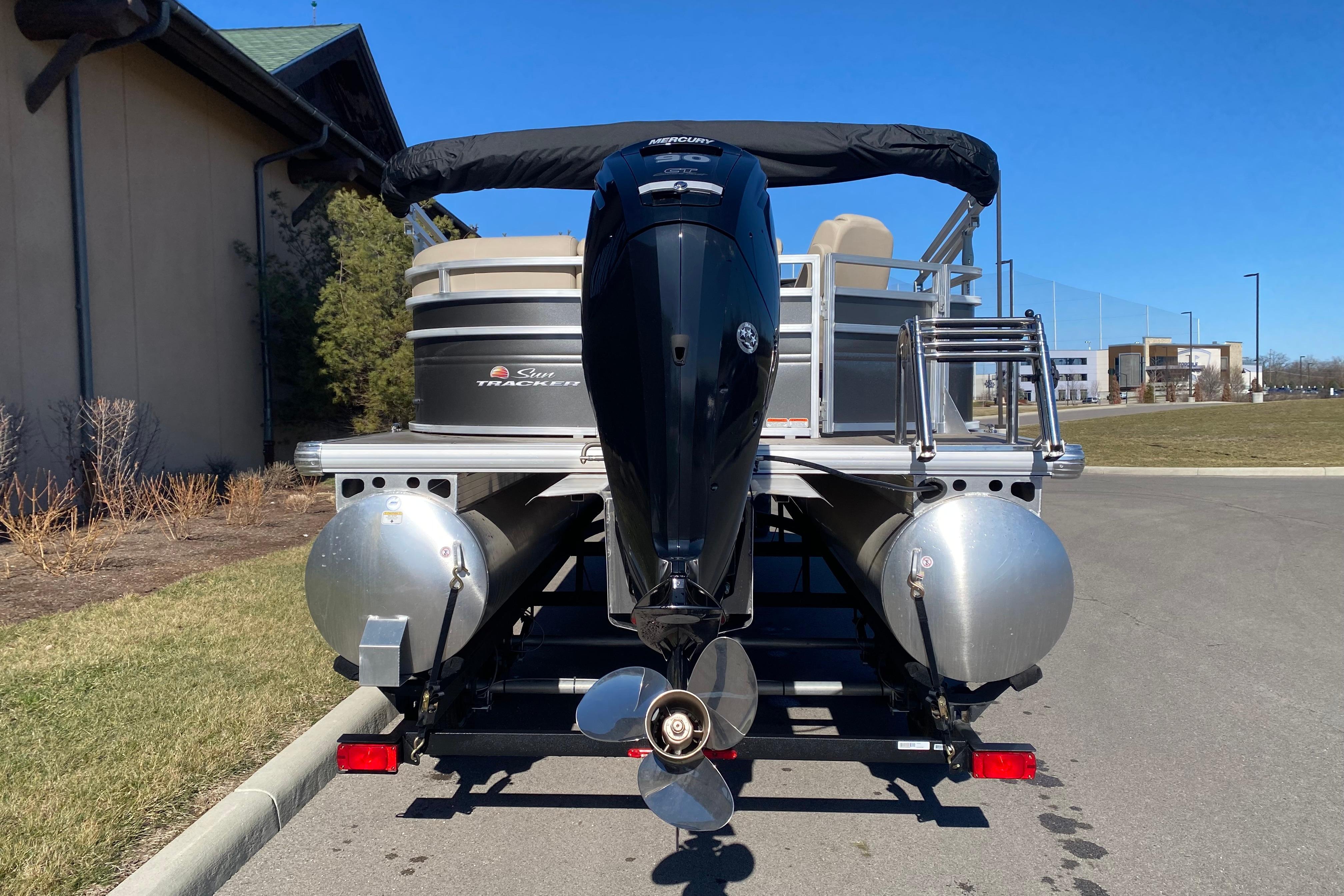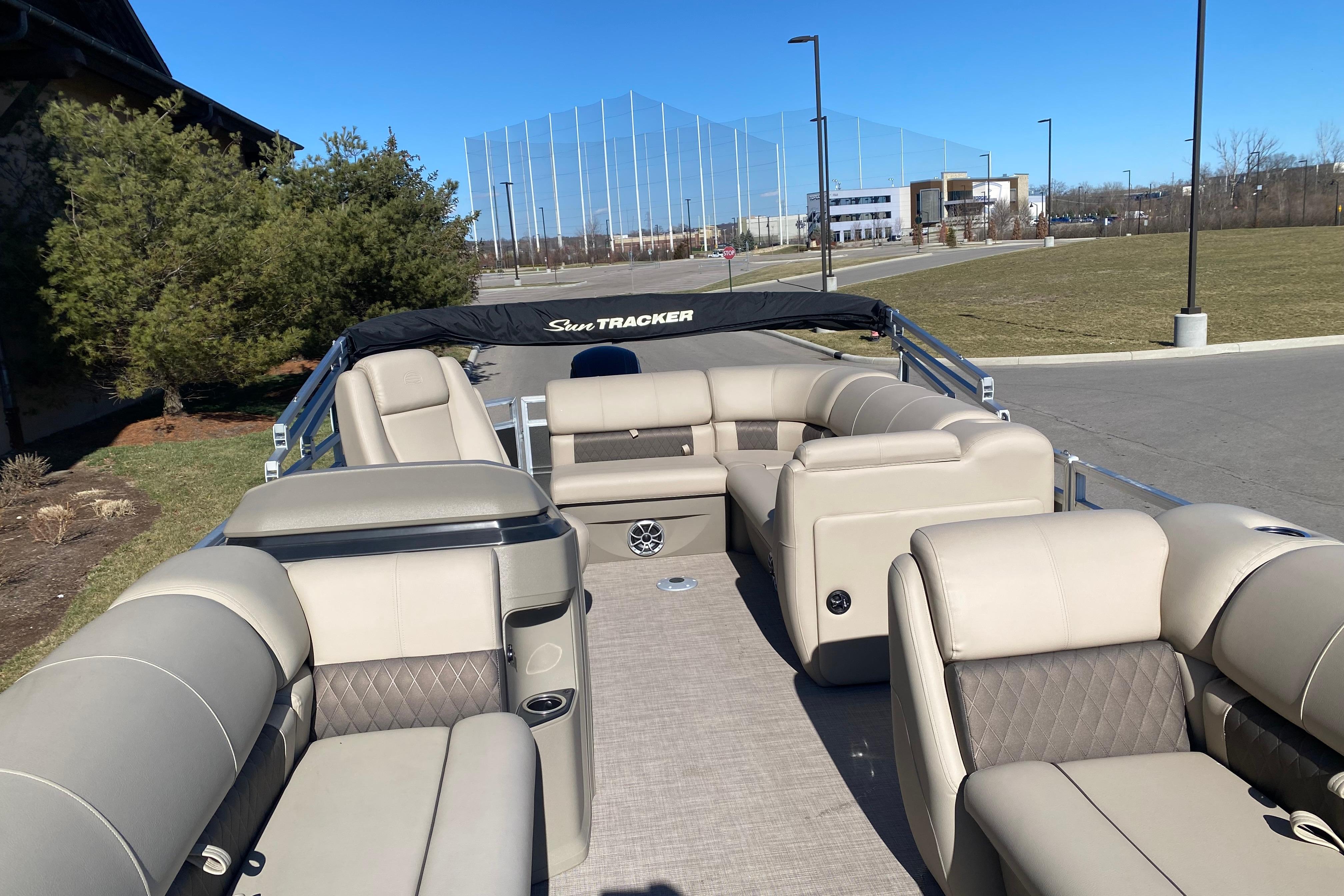 • 9' (2.74 m) SUN TRACKER® QuickLift™ Bimini top w/LED courtesy lights, storage pockets & protective boot (color-coordinated Black w/Charcoal fencing or Sand w/Copper Red fencing)