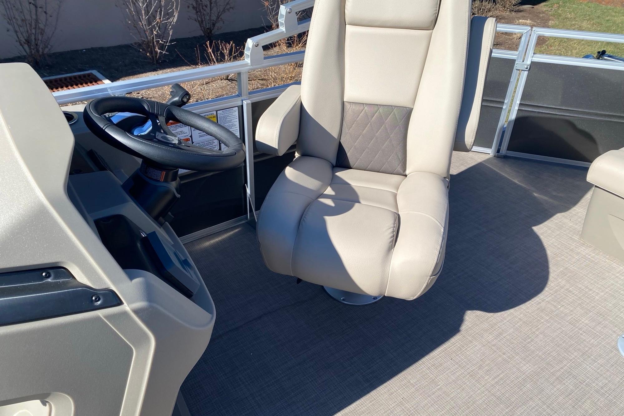 This PARTY BARGE® features the STOW MORE™ system, which puts storage spaces under the seats and behind the seat-back cushions of the 2 comfortable couches and L-shaped aft lounge. The couches and lounge feature 2 movable drink holders and a removable table with extra drink holders. The captain's chair reclines and boasts self-leveling arms for comfort.