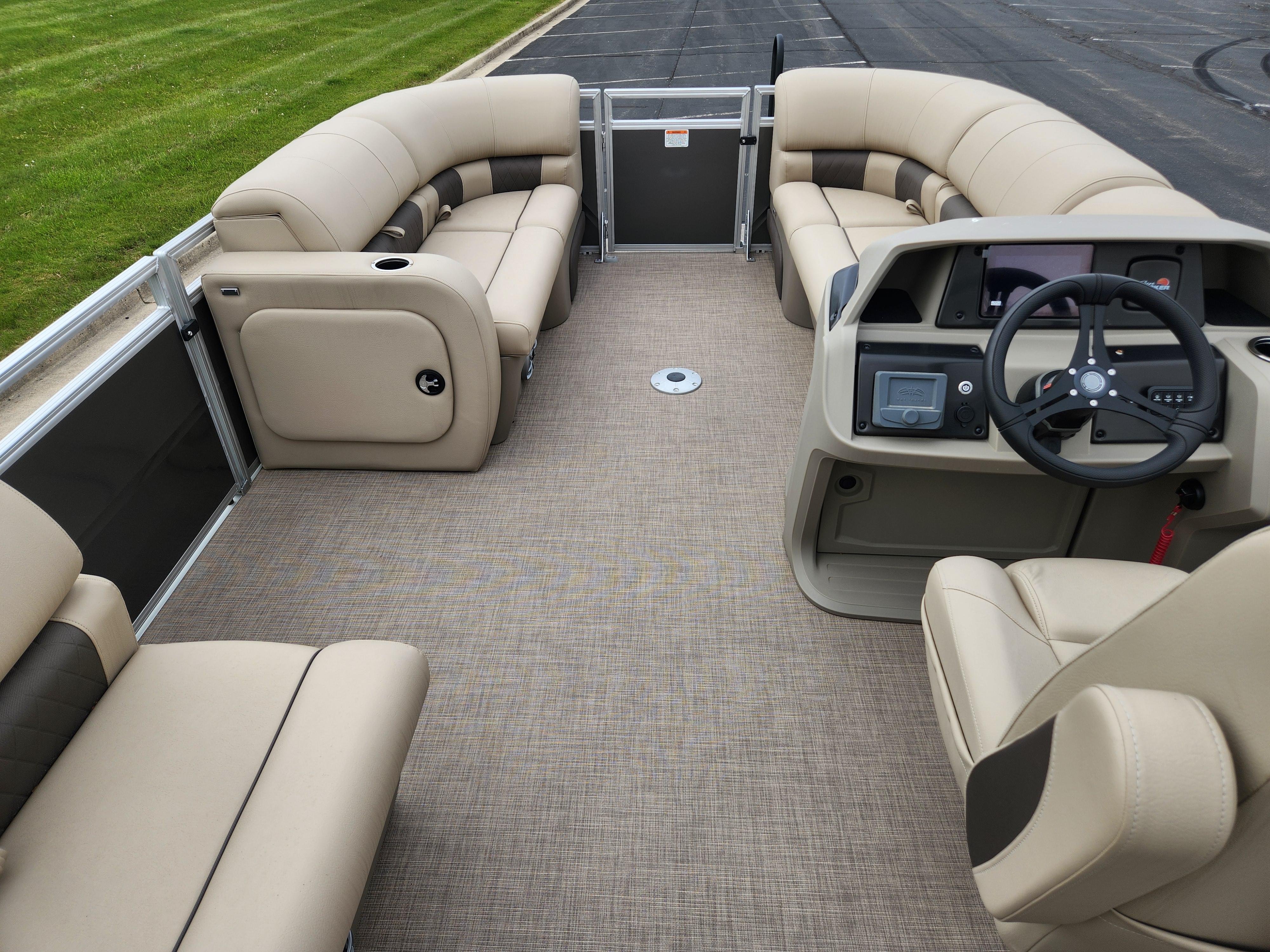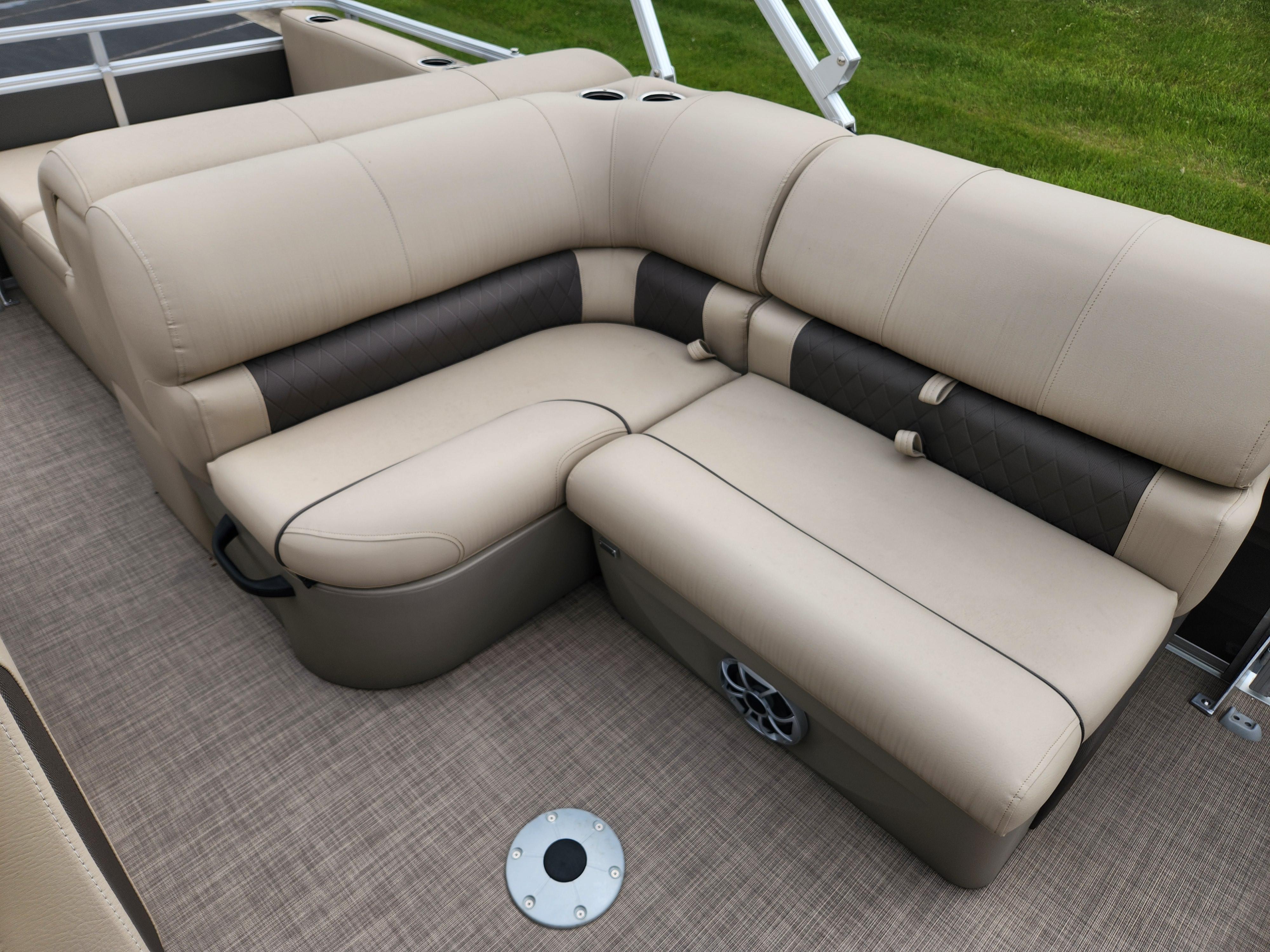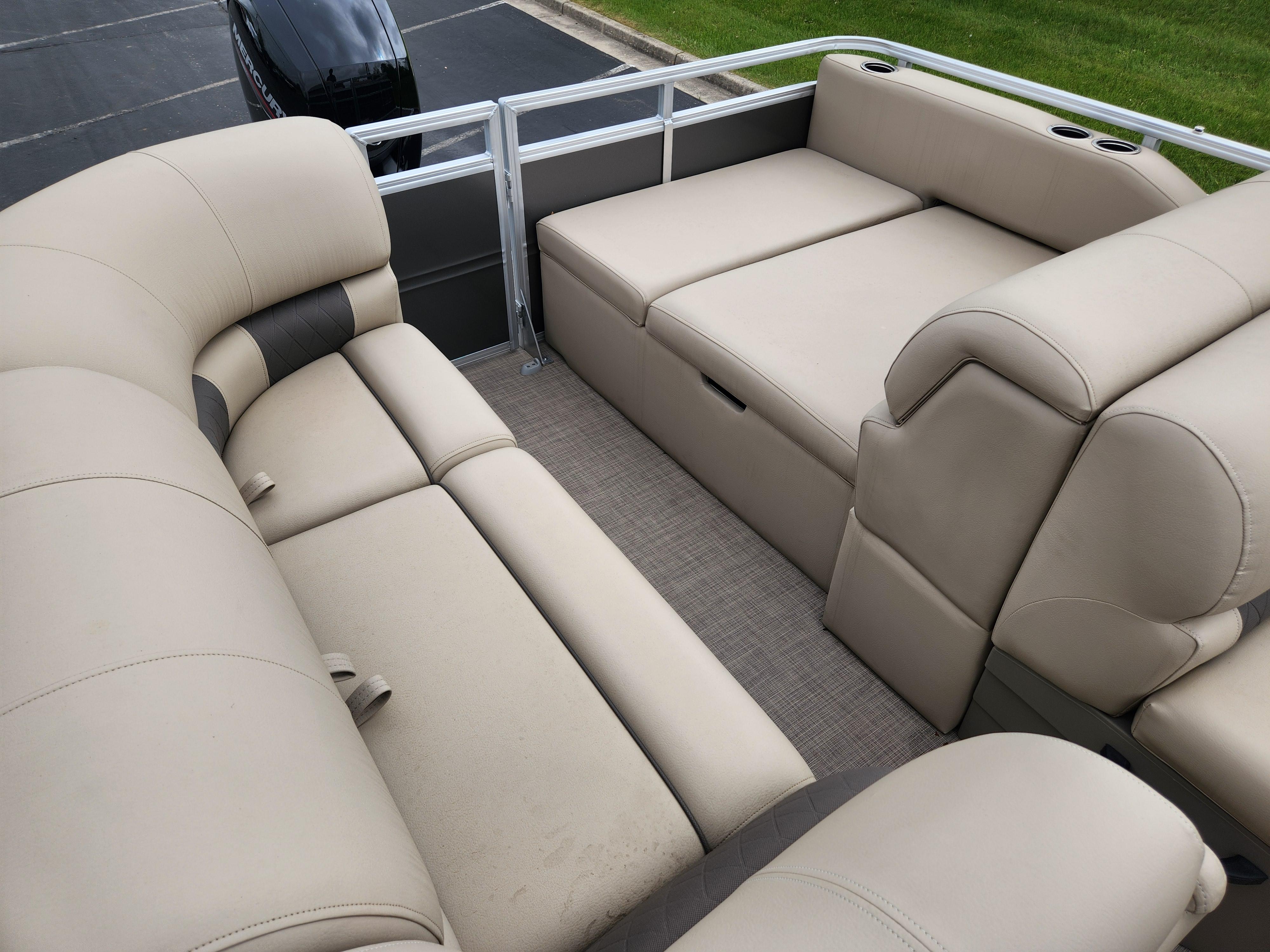 The PARTY BARGE® 22 RF DLX delivers all the exciting features of the base 22 DLX but ramps up the power and adds rear-facing – or "RF" – seating. Up to 11 passengers can enjoy the great space this SUN TRACKER® has to offer. Relax in the double-wide aft lounge area, next to the swiveling captain's chair in the mid-deck L-shaped couch, or up front on the 2 couches. Each lounge and couch has seat cushions that hide extra storage space. The seat backs lift up to reveal even more space for your party gear, supplies, and safety equipment. This model also features a pop-up changing room for privacy.