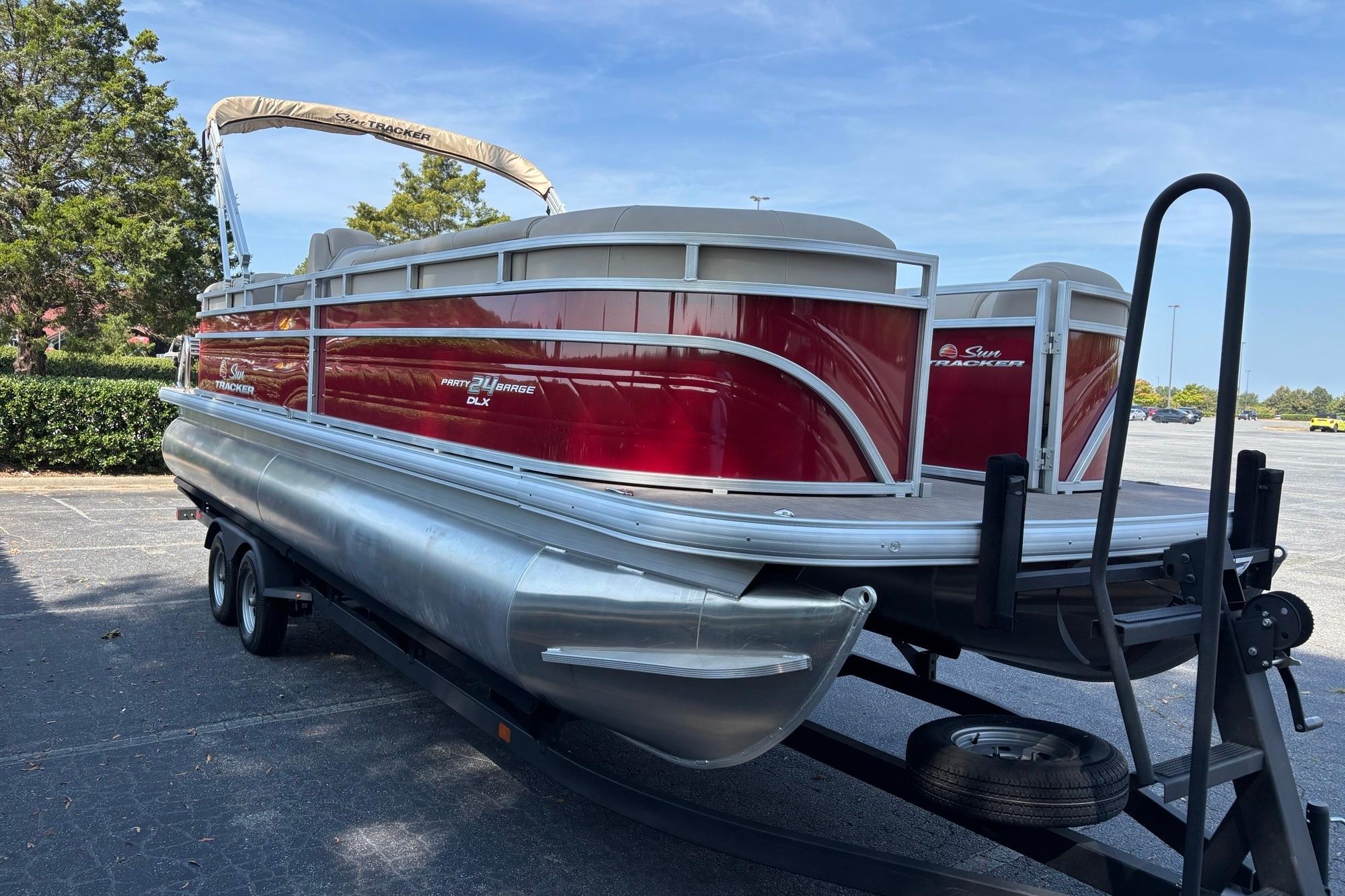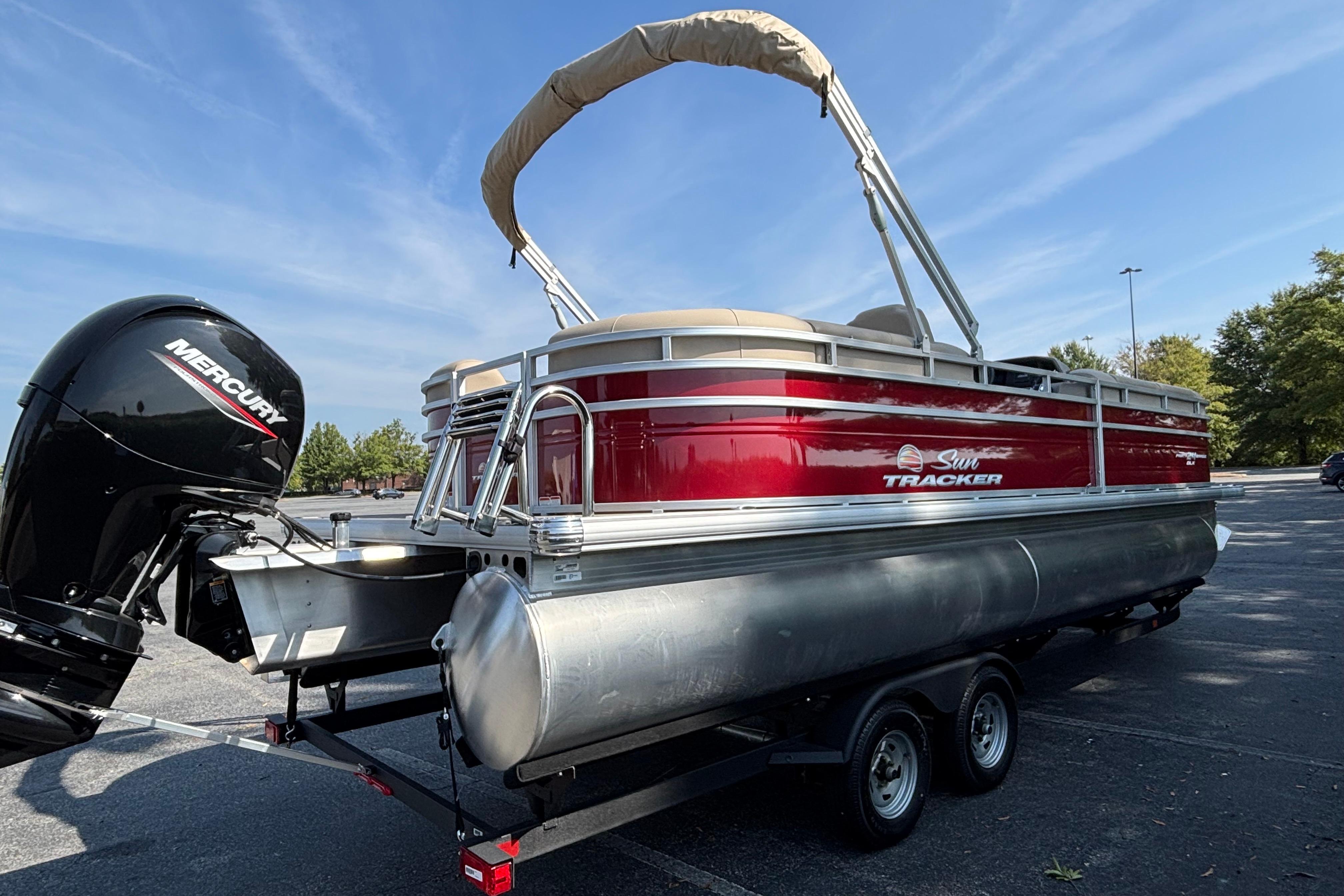 • 10' (3.05 m) SUN TRACKER® QuickLift™ Bimini top w/LED courtesy lights, storage pockets & protective boot (color-coordinated Black w/Charcoal fencing or Sand w/Copper Red fencing)