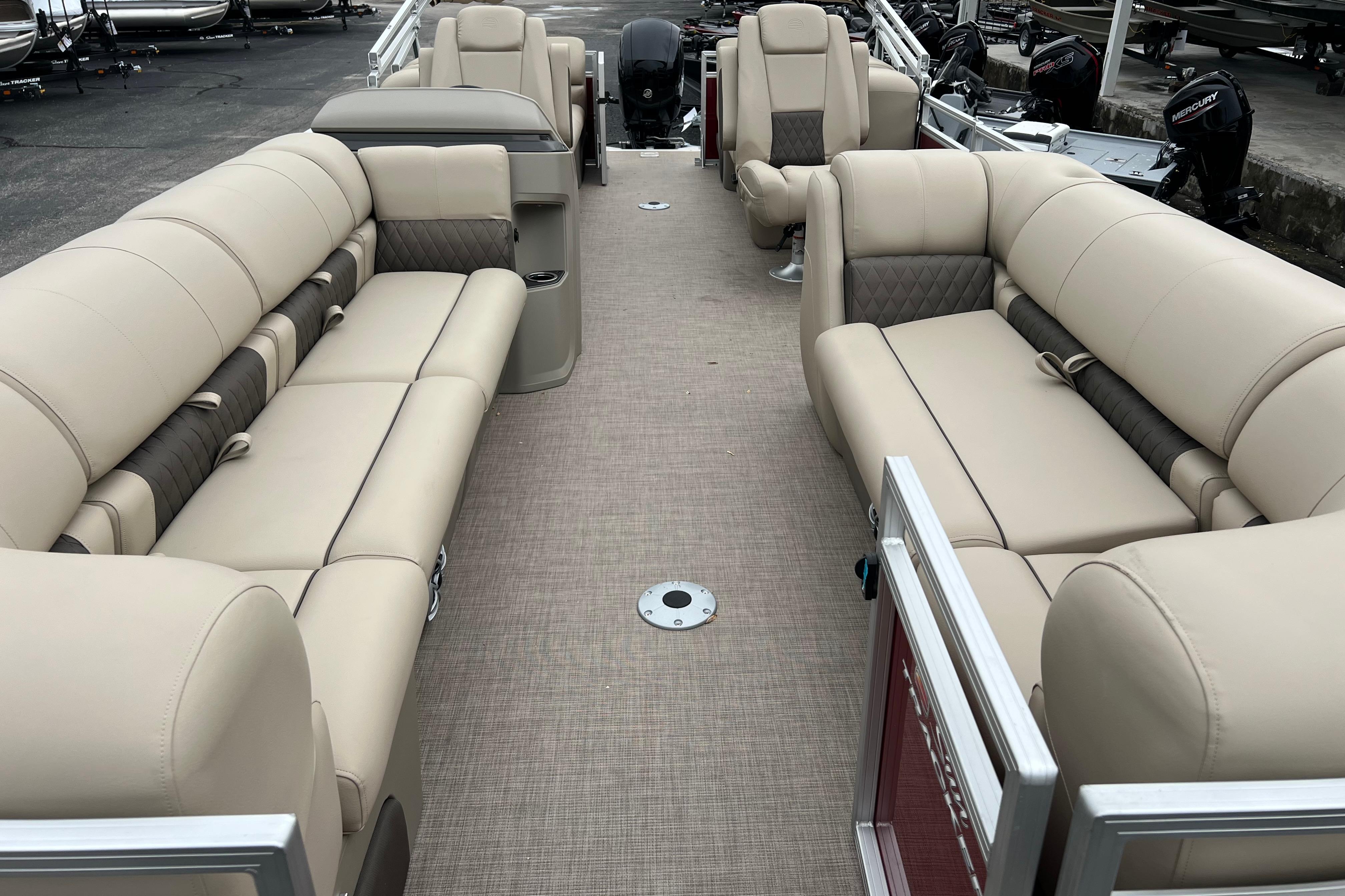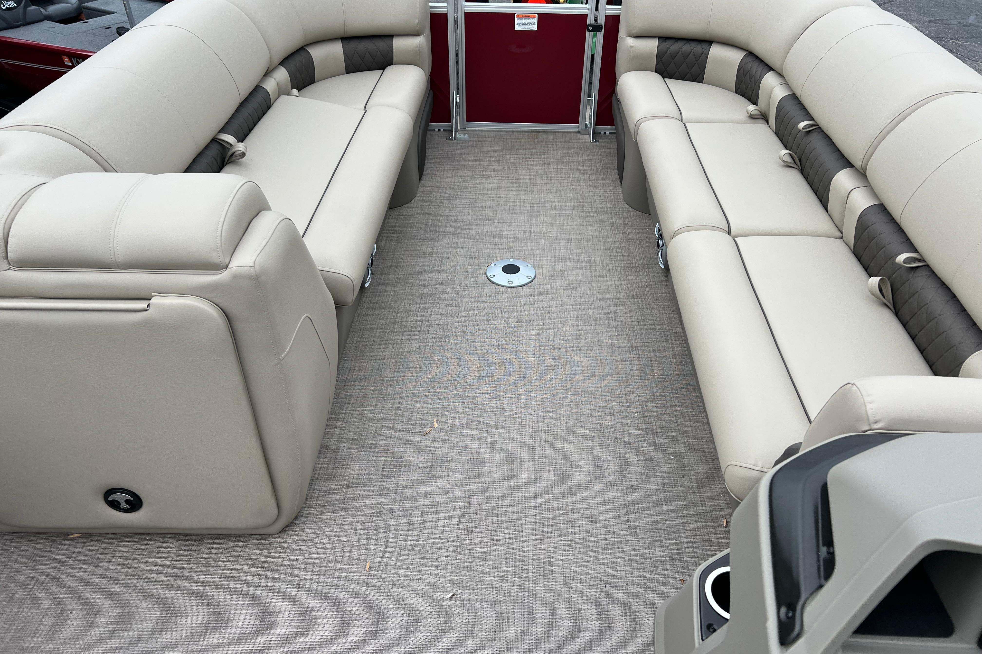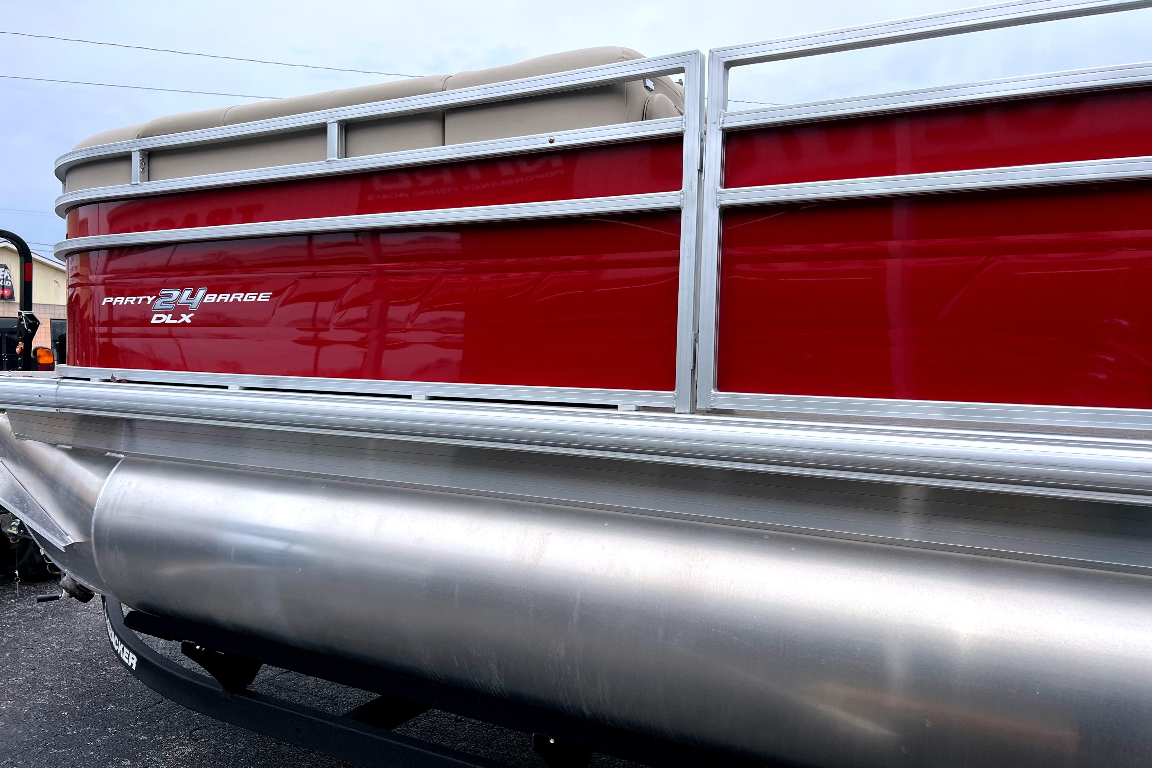 If you're going to go big, then go big! The 2025 PARTY BARGE® 24 DLX is the largest pontoon boat in the lineup, with room for up to 12 passengers. This PARTY BARGE® is lined with lounges in front of and behind the dual mid-deck captain's chairs. Those lounges feature the STOW MORE™ system, which places hidden storage spaces under the seats and behind the seat backs so you can keep all of your gear and supplies organized. The driver console also has an integrated storage space, as well as drink holders and a built-in footrest. The padded, easy-to-clean floor is easy on your feet and sports 2 anchor points for the moveable table and an optional ski-tow pylon. When the sun is beating down, deploy the 10' QuickLift® bimini top to get some shade. Create an unforgettable soundtrack for your floating party with the standard Wet Sounds® stereo with Bluetooth® and 4 upholstery speakers. Jump into the water from the full-width fore and aft decks past the gates and reboard easily with the telescoping aft ladder.