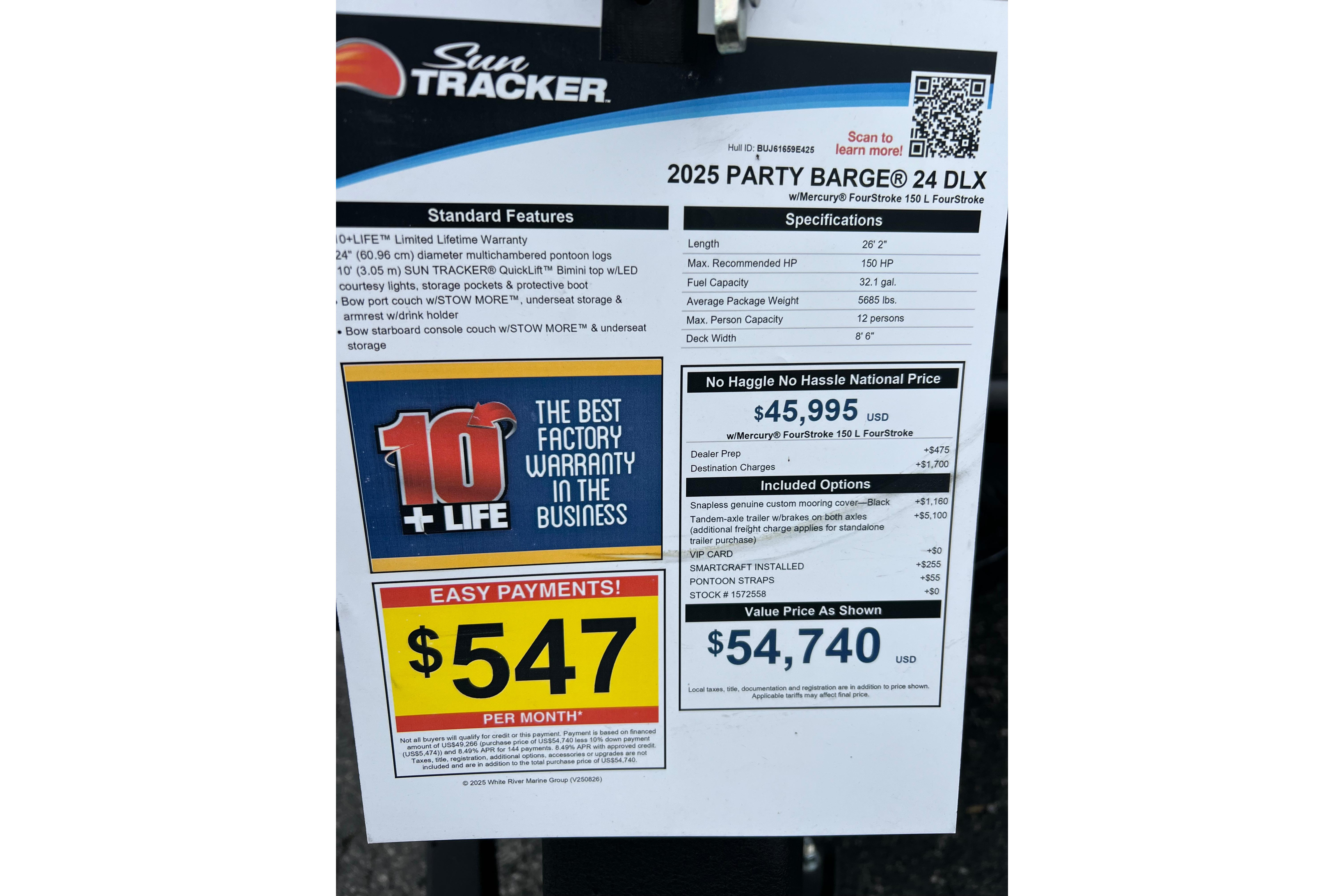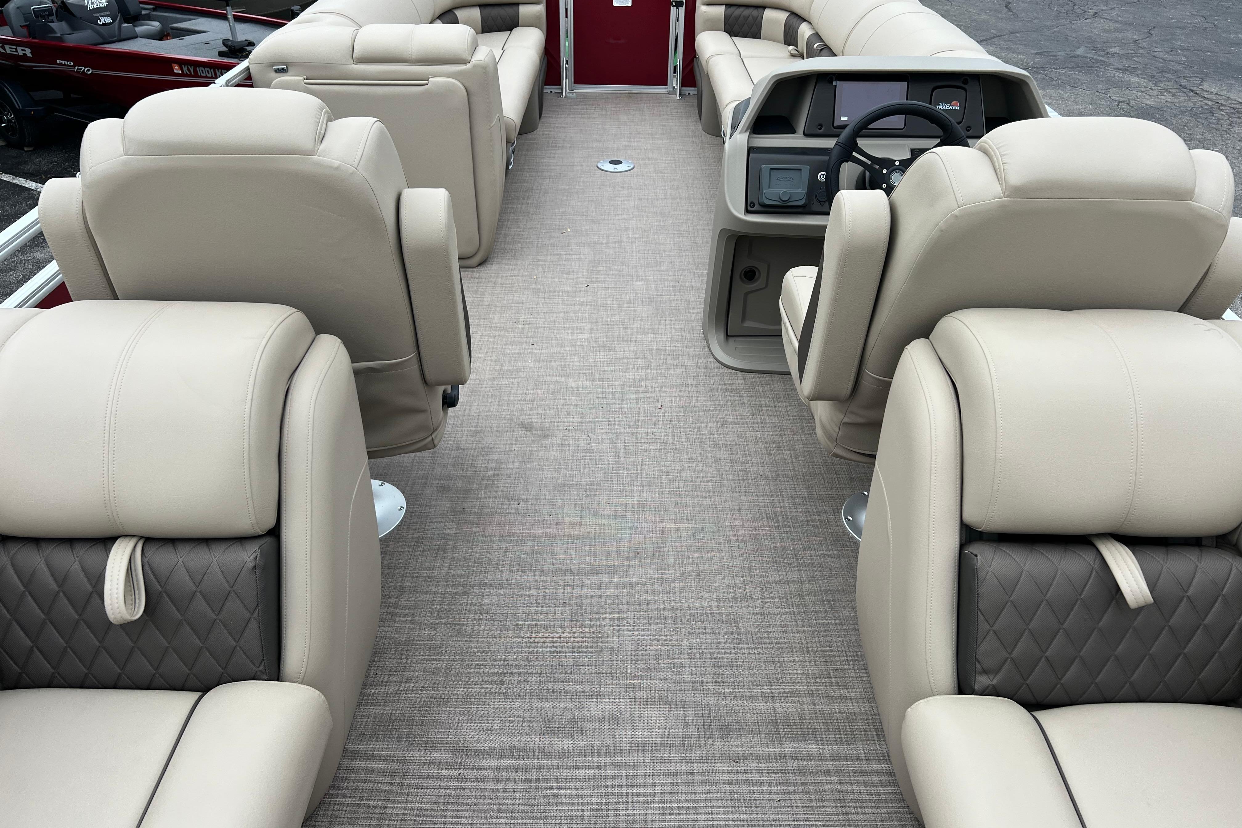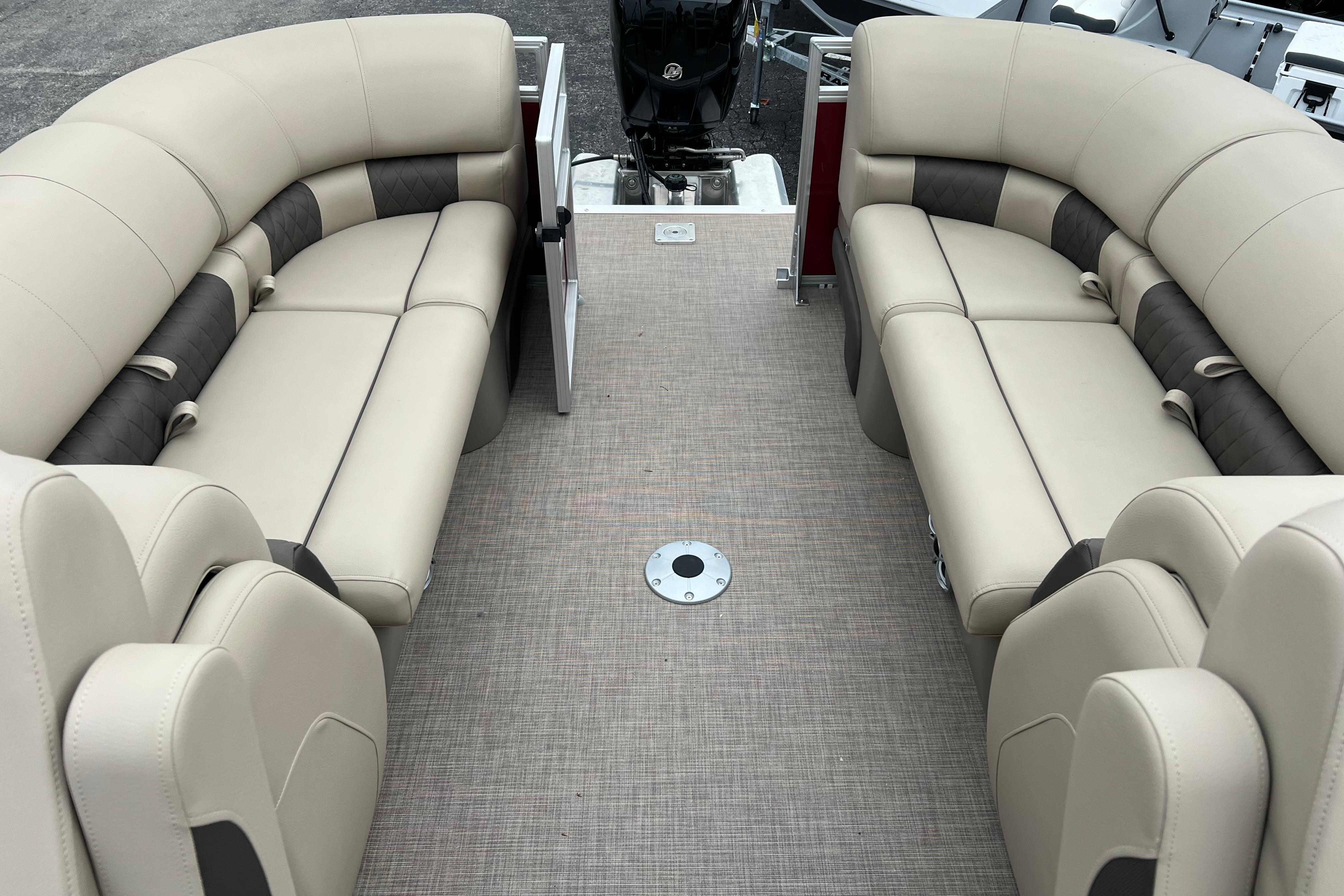If you're going to go big, then go big! The 2025 PARTY BARGE® 24 DLX is the largest pontoon boat in the lineup, with room for up to 12 passengers. This PARTY BARGE® is lined with lounges in front of and behind the dual mid-deck captain's chairs. Those lounges feature the STOW MORE™ system, which places hidden storage spaces under the seats and behind the seat backs so you can keep all of your gear and supplies organized. The driver console also has an integrated storage space, as well as drink holders and a built-in footrest. The padded, easy-to-clean floor is easy on your feet and sports 2 anchor points for the moveable table and an optional ski-tow pylon. When the sun is beating down, deploy the 10' QuickLift® bimini top to get some shade. Create an unforgettable soundtrack for your floating party with the standard Wet Sounds® stereo with Bluetooth® and 4 upholstery speakers. Jump into the water from the full-width fore and aft decks past the gates and reboard easily with the telescoping aft ladder.