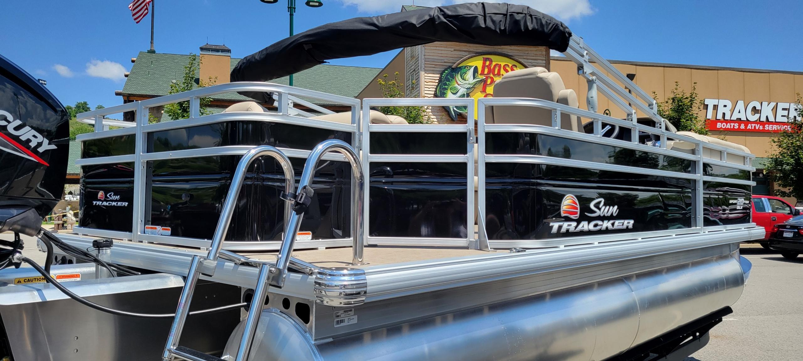 • 9' (2.74 m) SUN TRACKER® QuickLift™ Bimini top w/LED courtesy lights, storage pockets & protective boot (color-coordinated Black w/Black fencing or Sand w/Caribou fencing)