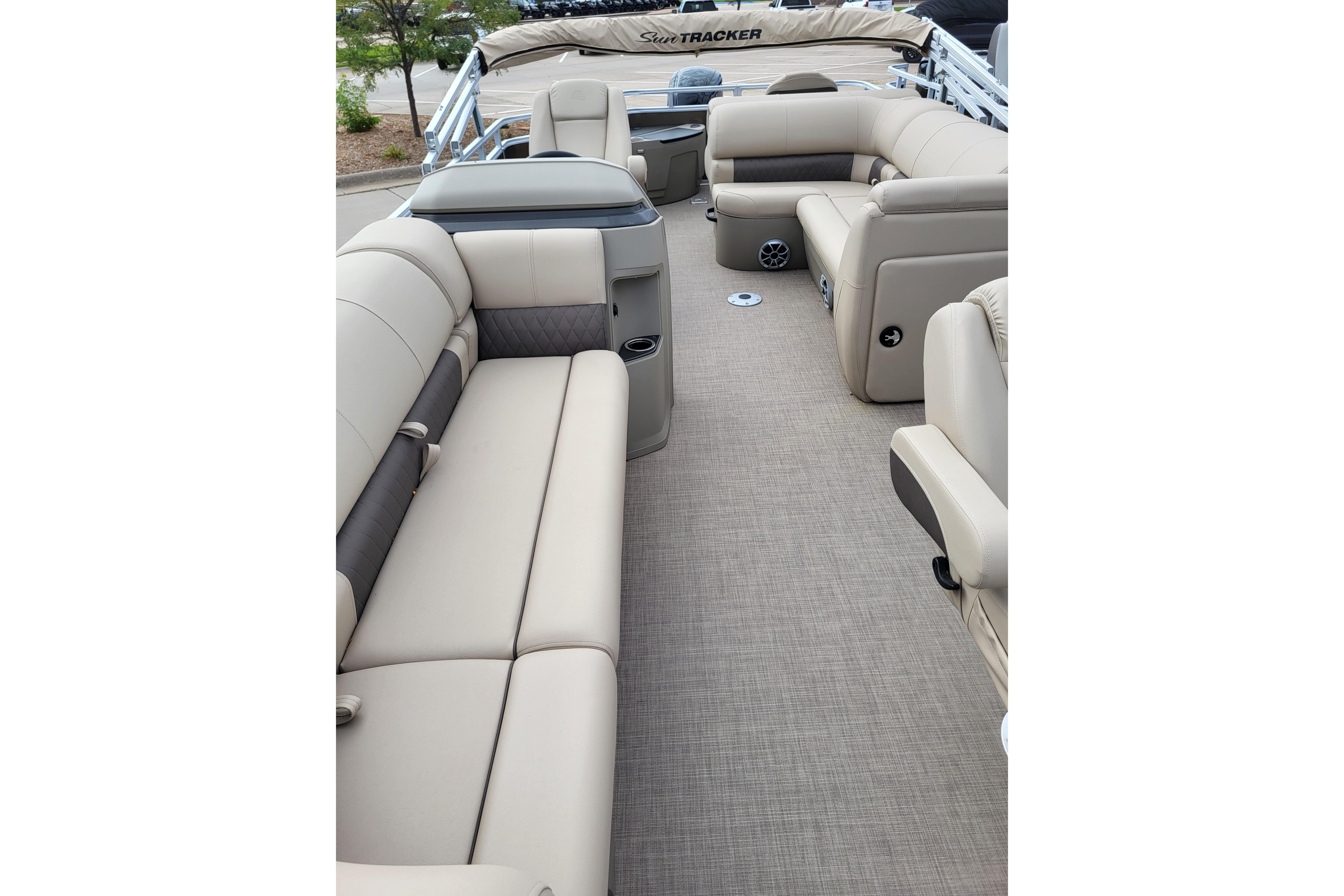 Get the best of 2 worlds with the 2025 SPORTFISH™ 20 DLX. This pontoon boat offers a space built for both serious fishing trips and days of fun on the water for up to 10 friends and family. Spend the day casting lines from the fore fishing captain's chair or the comfortable aft folding chair. These fishing stations feature an aft aerated livewell, drink holders, and rod holders. Navigate to the next fishing spot in the helm's captain's chair and the ergonomic console with a SUN TRACKER FLARE touchscreen, built-in storage space, and soft-touch steering wheel.