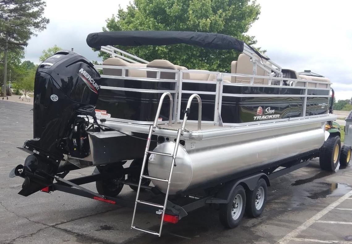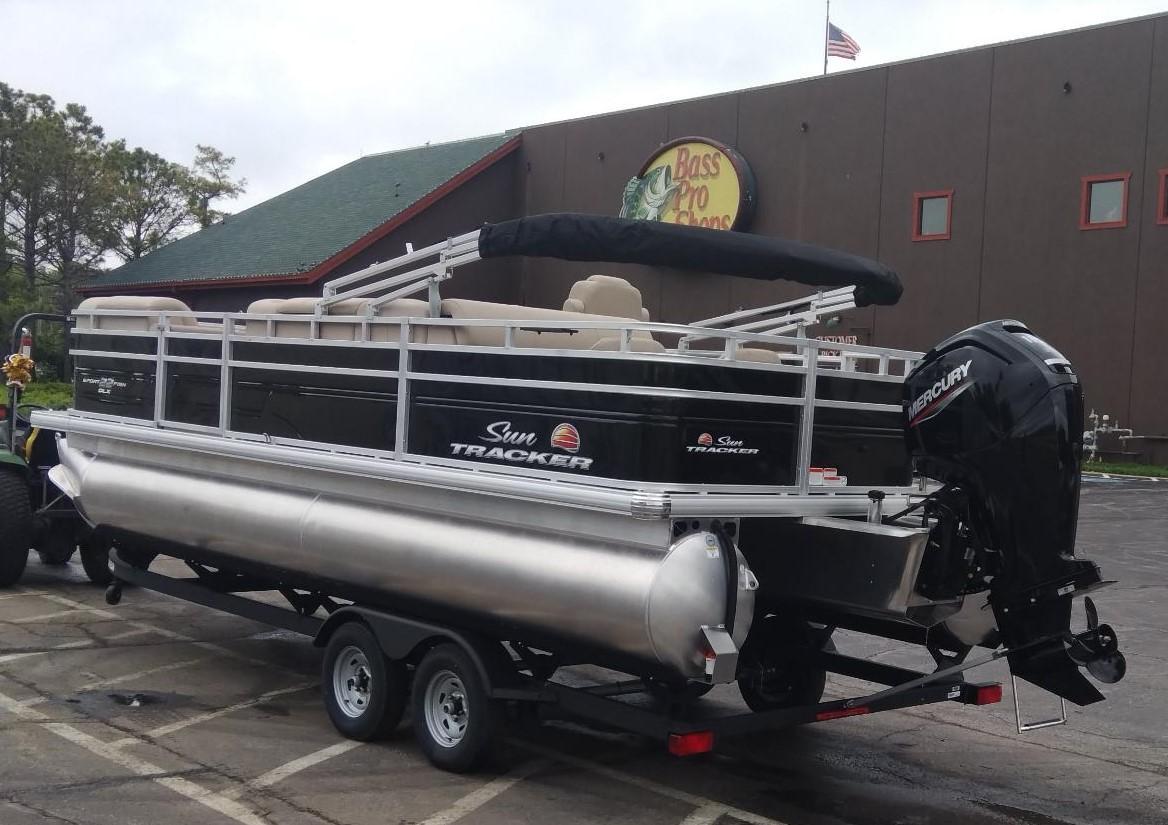 • 10' (3.05 m) SUN TRACKER® QuickLift™ Bimini top w/LED courtesy lights, storage pockets & protective boot (color-coordinated Black w/Black fencing or Sand w/Caribou fencing)