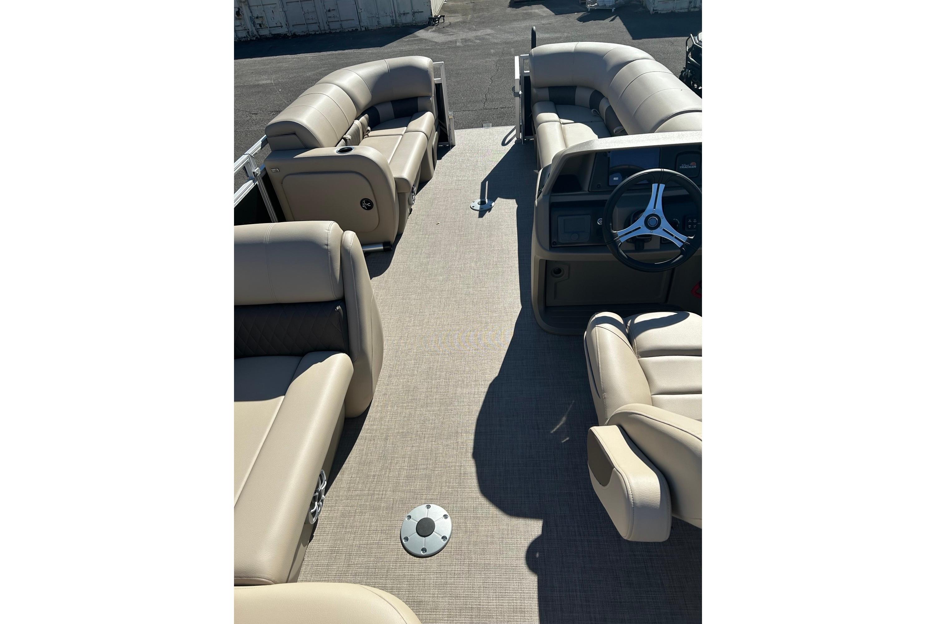 • 10' (3.05 m) SUN TRACKER® QuickLift™ Bimini top w/LED courtesy lights, storage pockets & protective boot (color-coordinated Black w/Black fencing or Sand w/Caribou fencing)