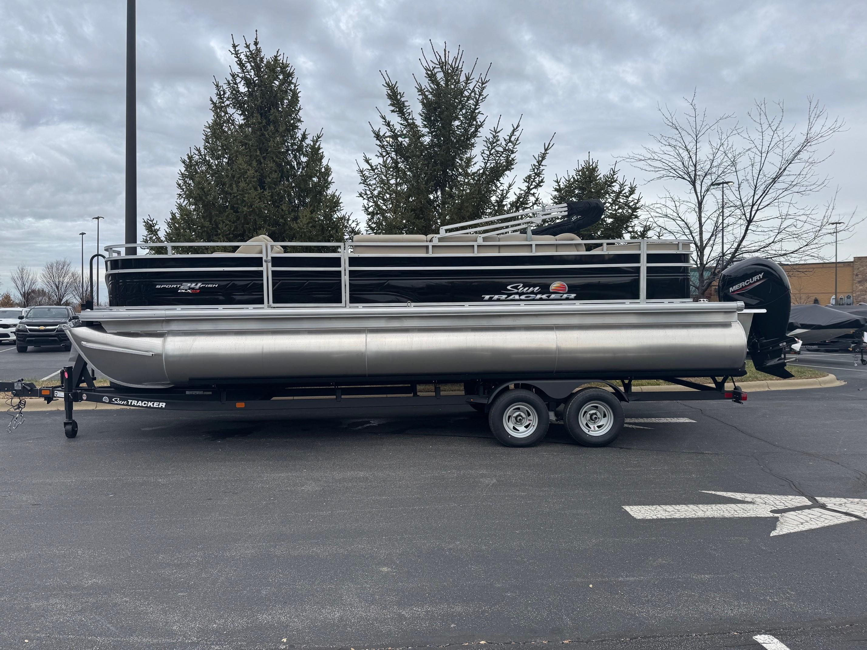 You just can't do much better than the 2025 SPORTFISH™ 24 XP3 if you're looking for the best floating fishing and relaxing station! This SUN TRACKER® pontoon boat's 24' deck stays stable thanks to 3 pontoon logs with lifting strakes. Be ready to wet a line at any moment with the lockable rod box. From the bow casting deck’s dual removable and folding fishing chairs, anglers can take advantage of rail-mounted rod holders, an aerated livewell, the tackle storage compartment, and more.