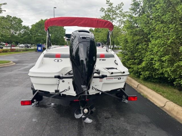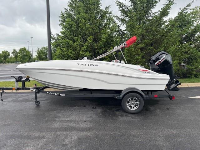 The 2025 TAHOE® T16 comes standard with a 60hp Mercury® ELPT FourStroke outboard motor and has a recommended maximum 75hp rating. This model is packaged with a trailer.