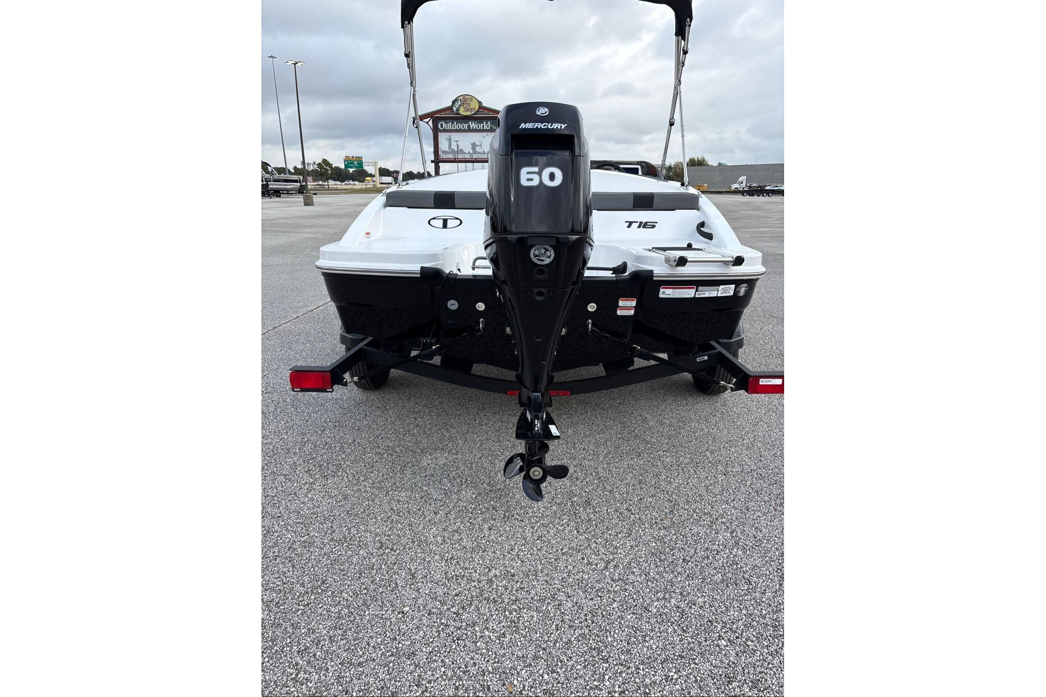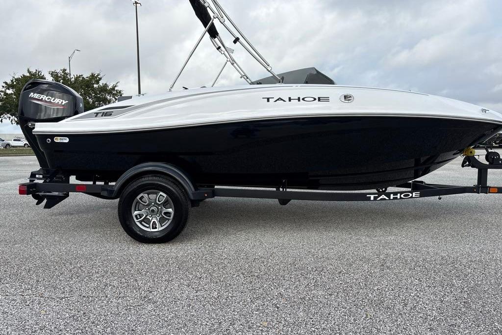 The 2025 TAHOE® T16 comes standard with a 60hp Mercury® ELPT FourStroke outboard motor and has a recommended maximum 75hp rating. This model is packaged with a trailer.