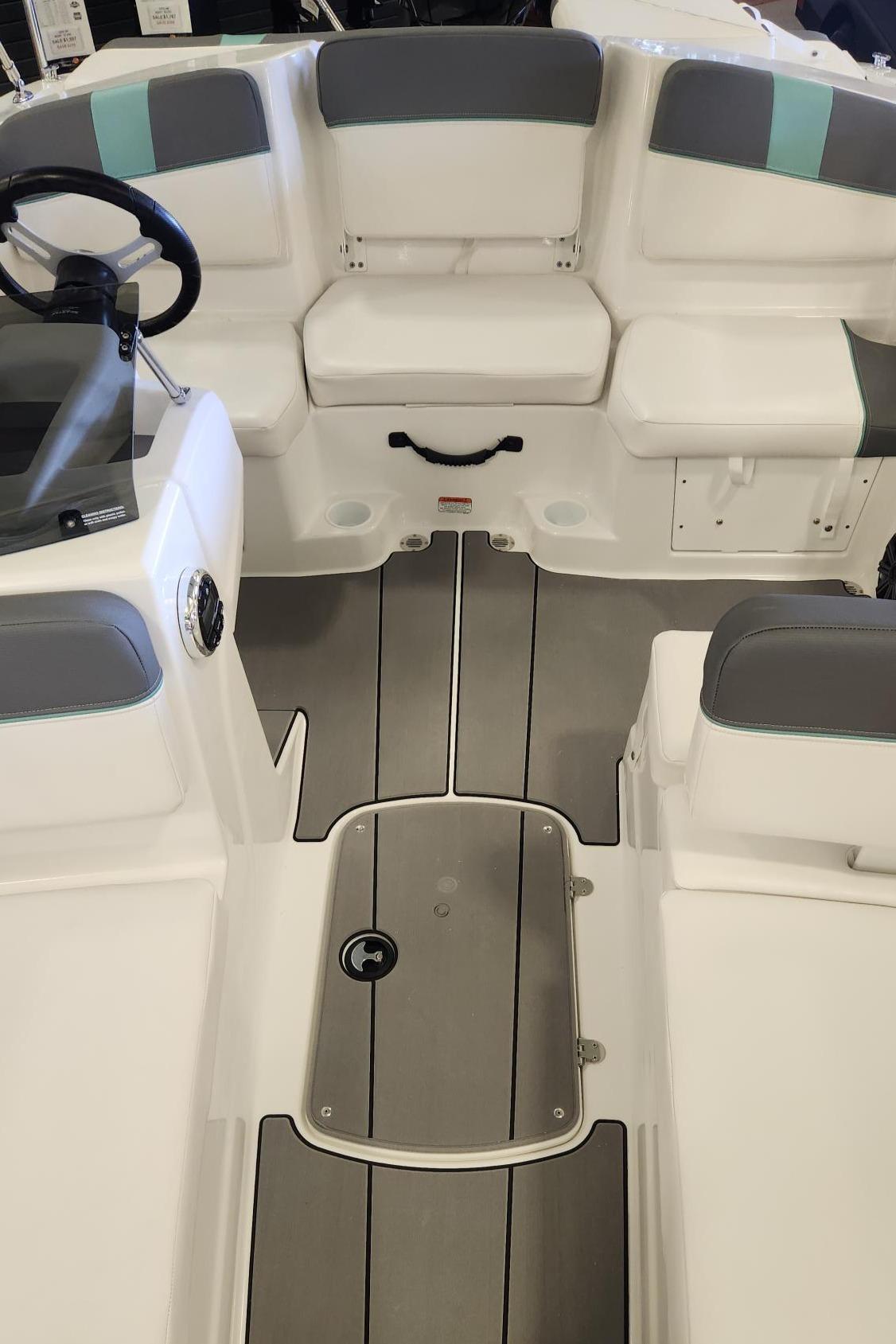 Relax on the water in this boat's midship bench seating and twin forward lounges with under-seat storage. The bow seats have reversible backrests that turn them into spotter seats. Lay out on the aft sun pad when you find your cove. The 4-step telescoping aft boarding ladder makes it easy to get back on the swim platform after diving into the water. Flip-up seat cushions and flip-down seat backs let passengers board the boat without stepping on upholstery. Claim 1 of the 9 drink holders, find your song on the 2-speaker Kicker® stereo, and search for excitement on the water!