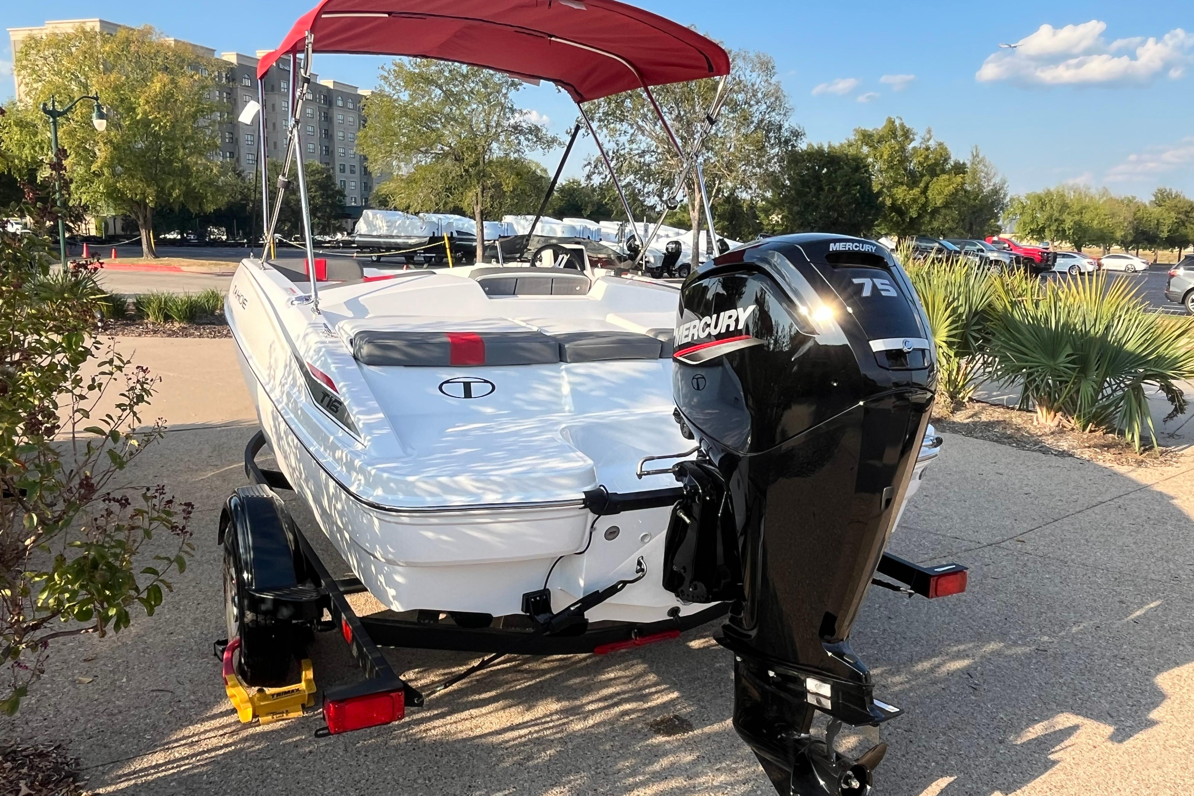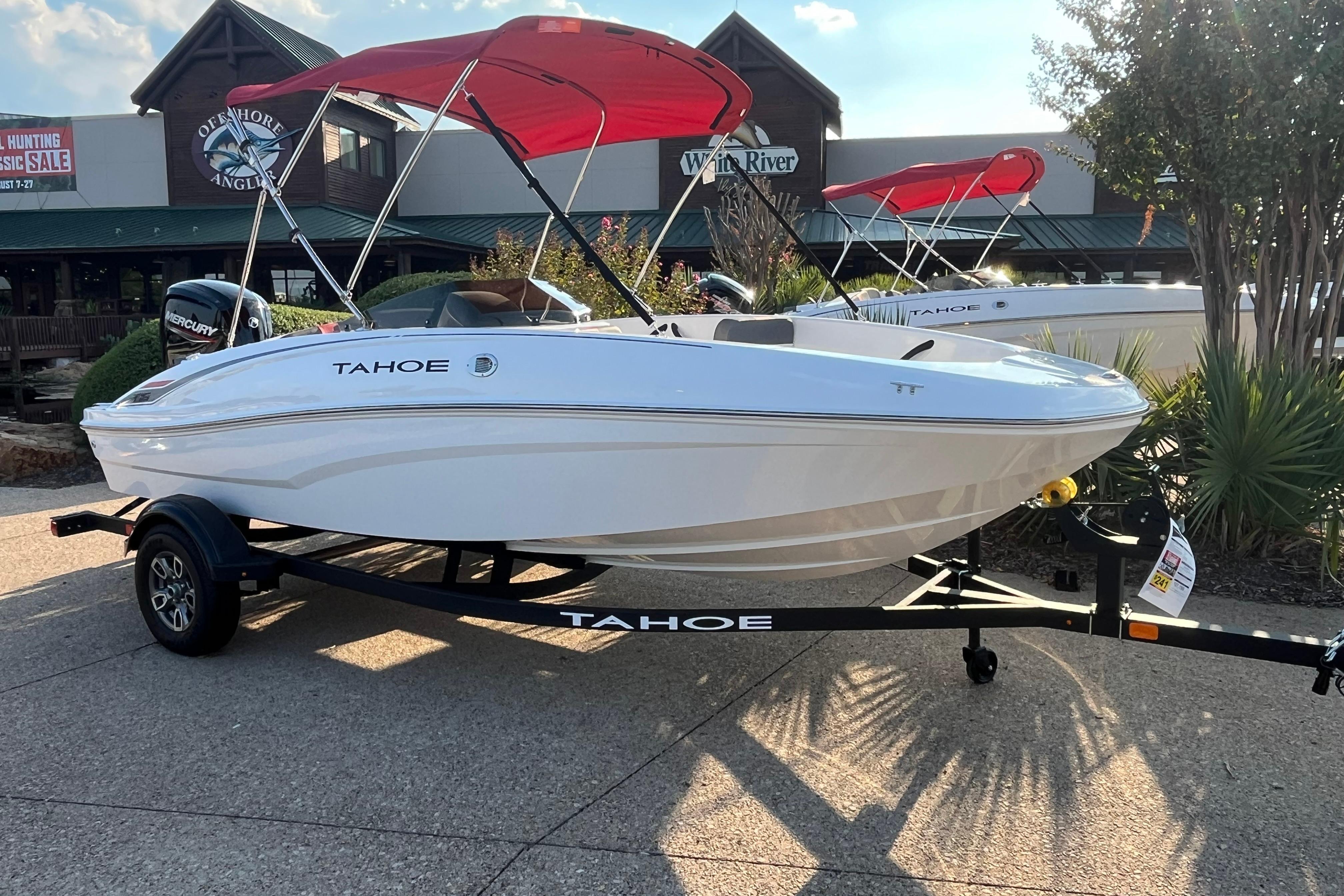 The 2025 TAHOE® T16 comes standard with a 60hp Mercury® ELPT FourStroke outboard motor and has a recommended maximum 75hp rating. This model is packaged with a trailer.