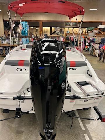 The 2025 TAHOE® T16 comes standard with a 60hp Mercury® ELPT FourStroke outboard motor and has a recommended maximum 75hp rating. This model is packaged with a trailer.