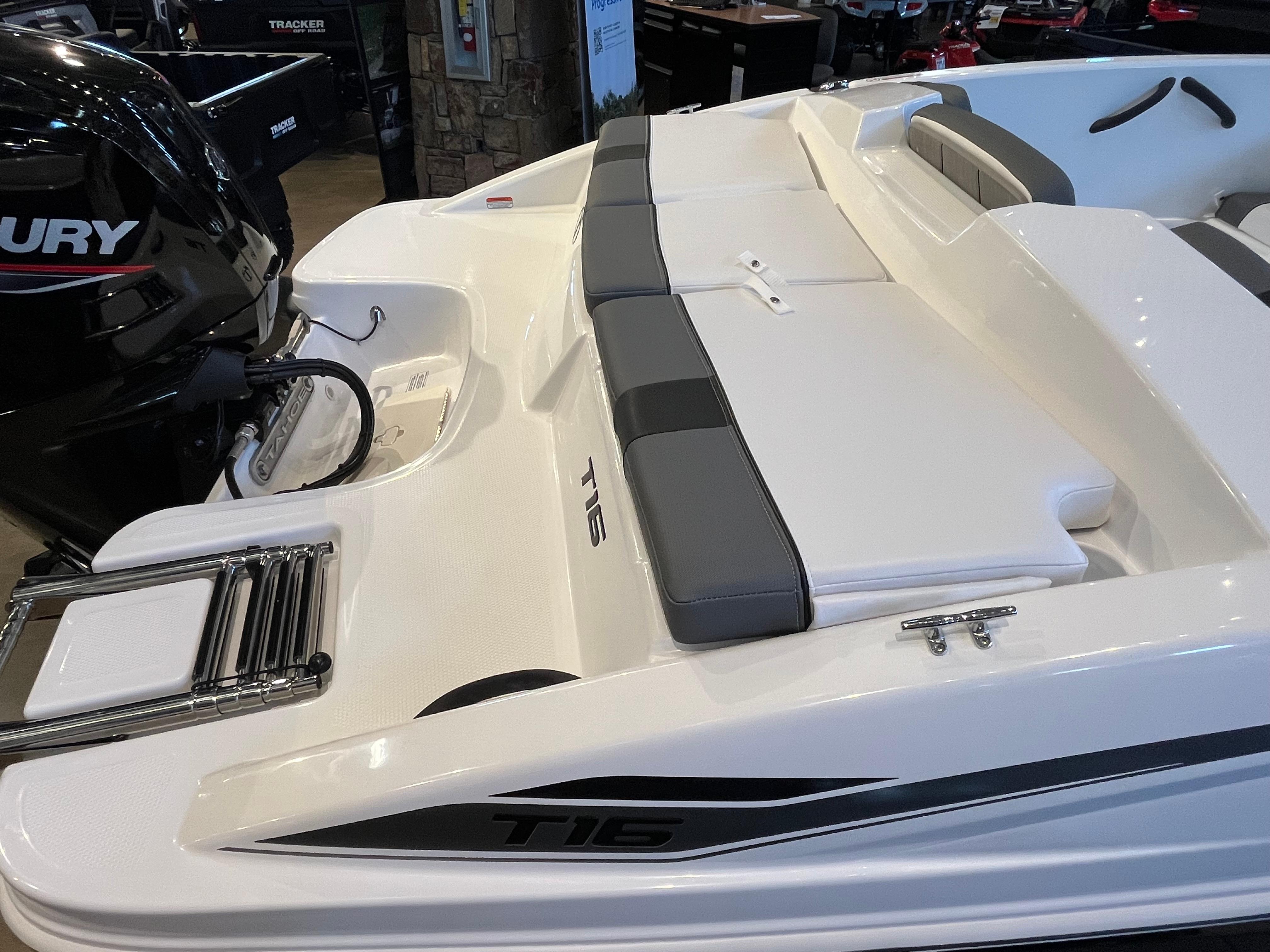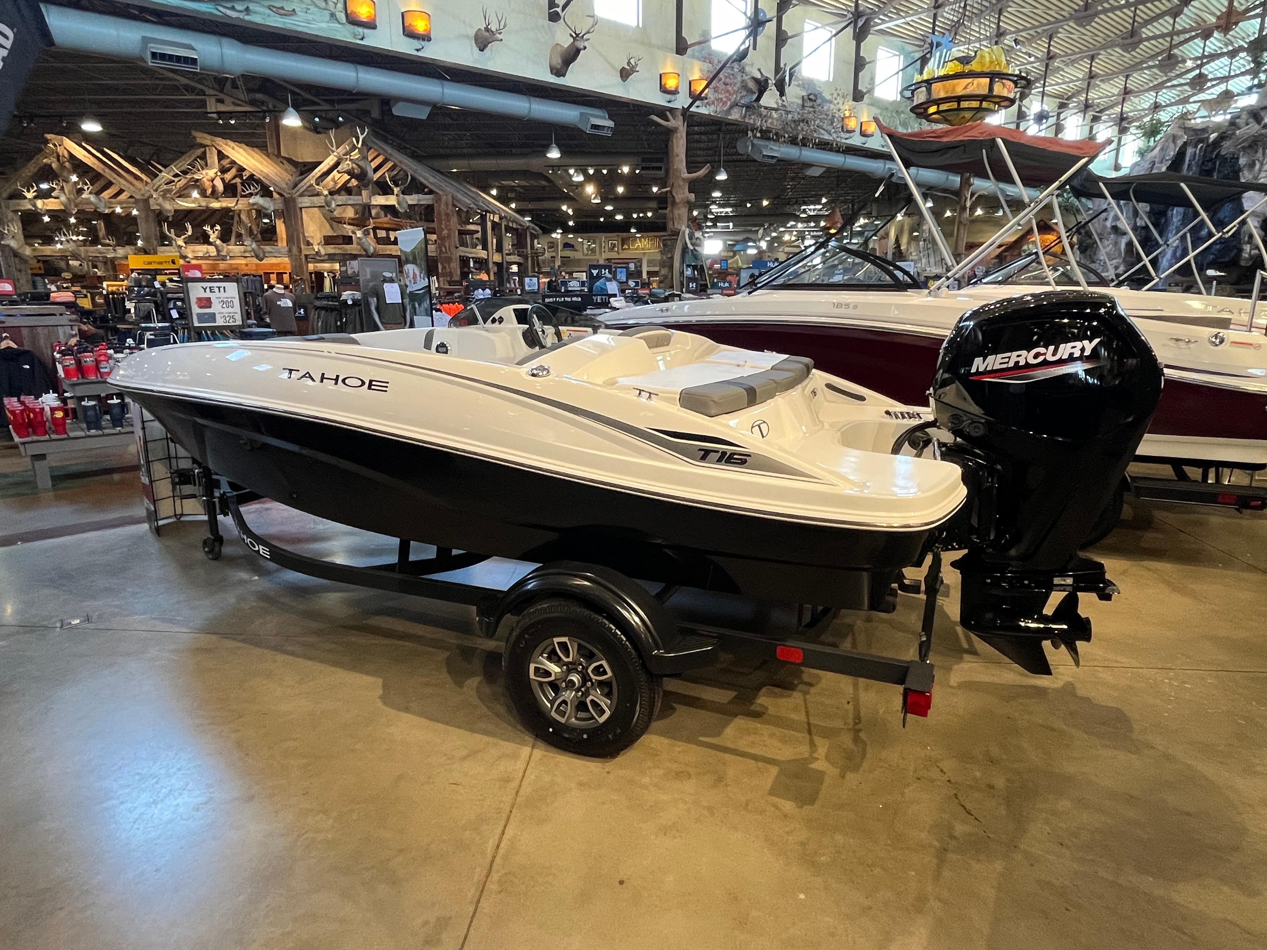 The 2025 TAHOE® T16 comes standard with a 60hp Mercury® ELPT FourStroke outboard motor and has a recommended maximum 75hp rating. This model is packaged with a trailer.