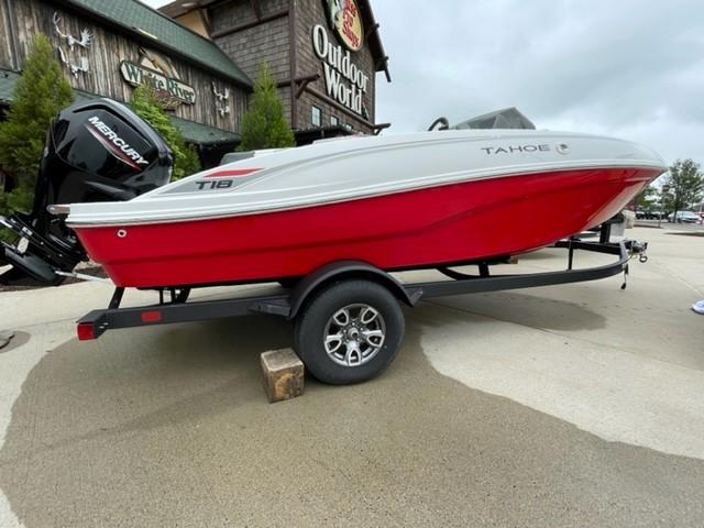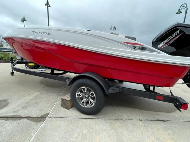 The 2025 TAHOE® T18 comes standard with a 90hp Mercury® ELPT FourStroke outboard motor and has a recommended maximum 115hp rating. This model is packaged with a trailer.
