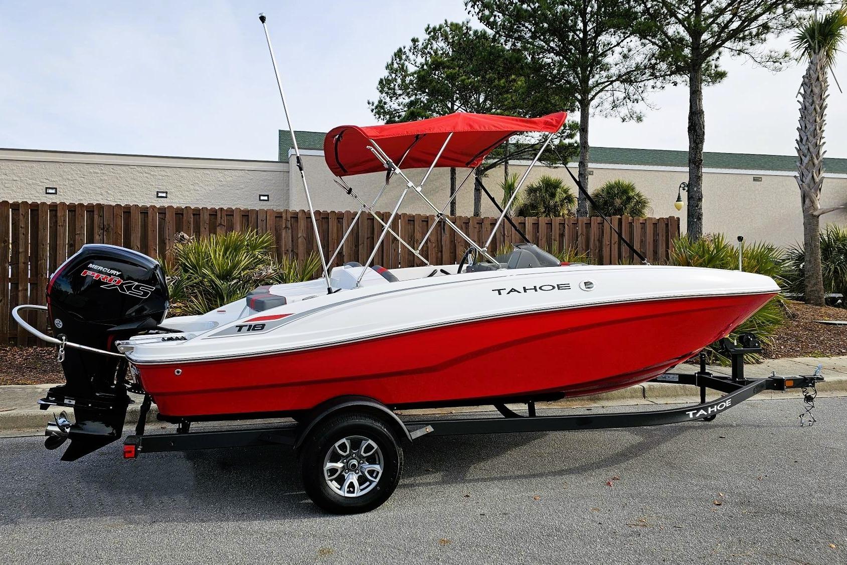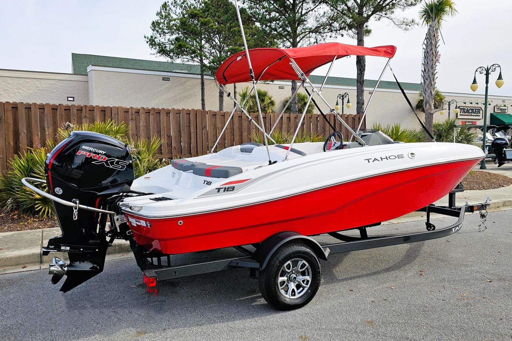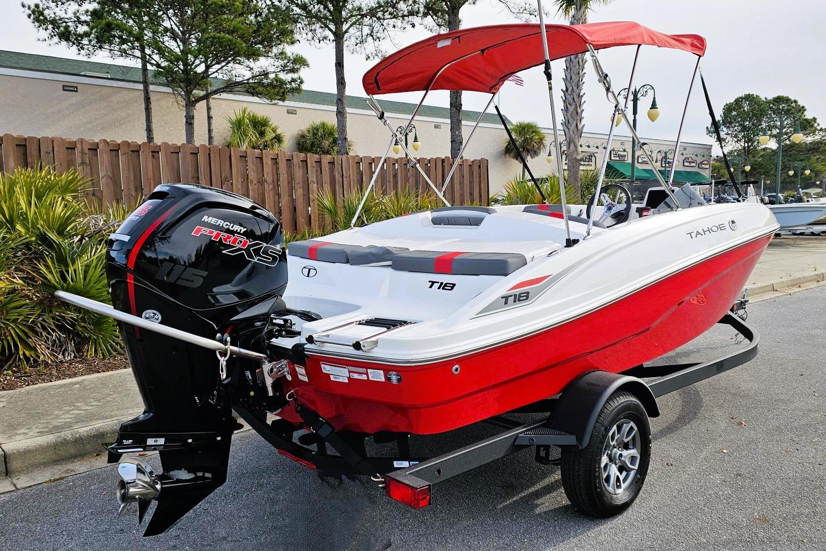 The 2025 TAHOE® T18 comes standard with a 90hp Mercury® ELPT FourStroke outboard motor and has a recommended maximum 115hp rating. This model is packaged with a trailer.
