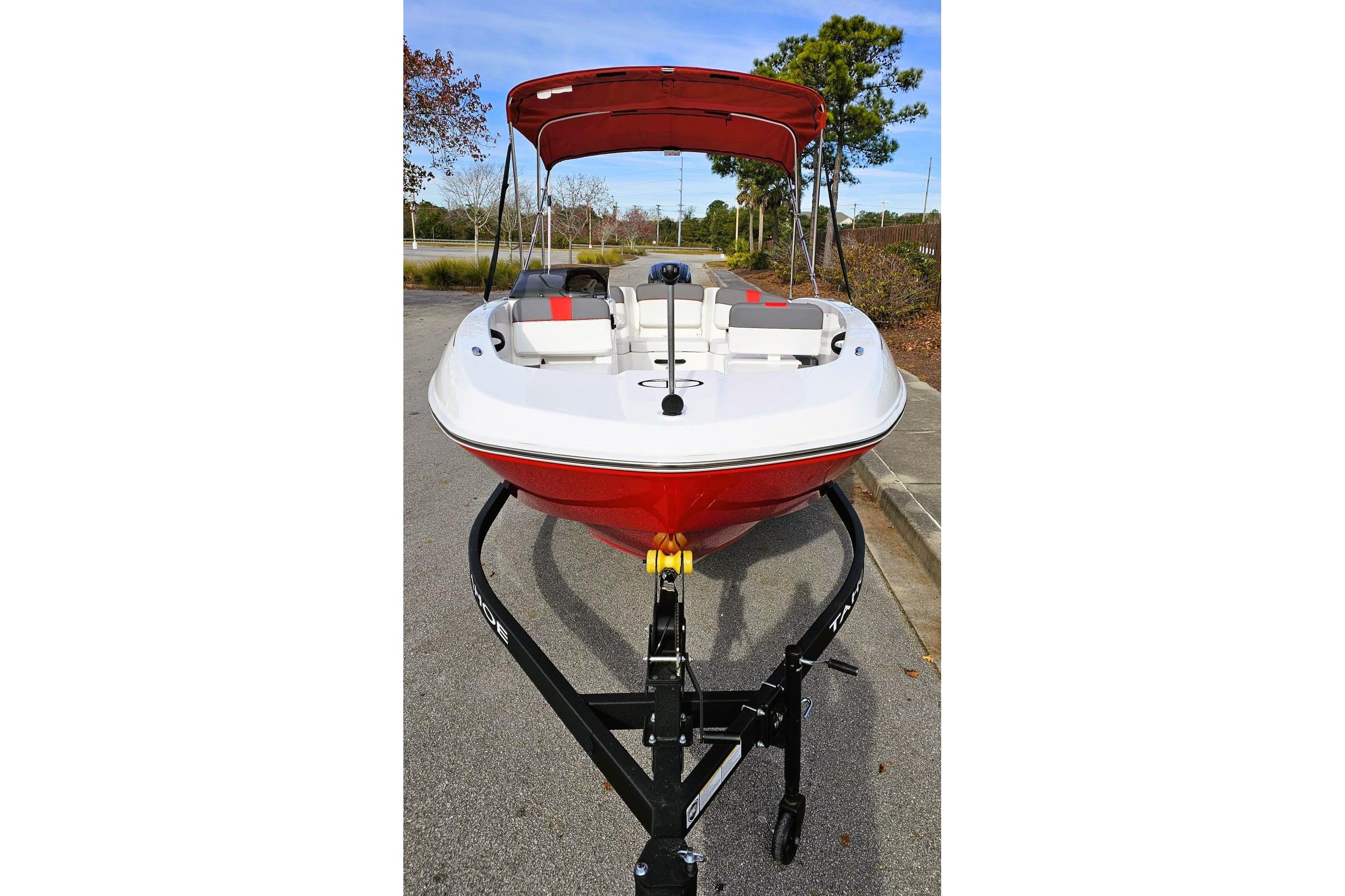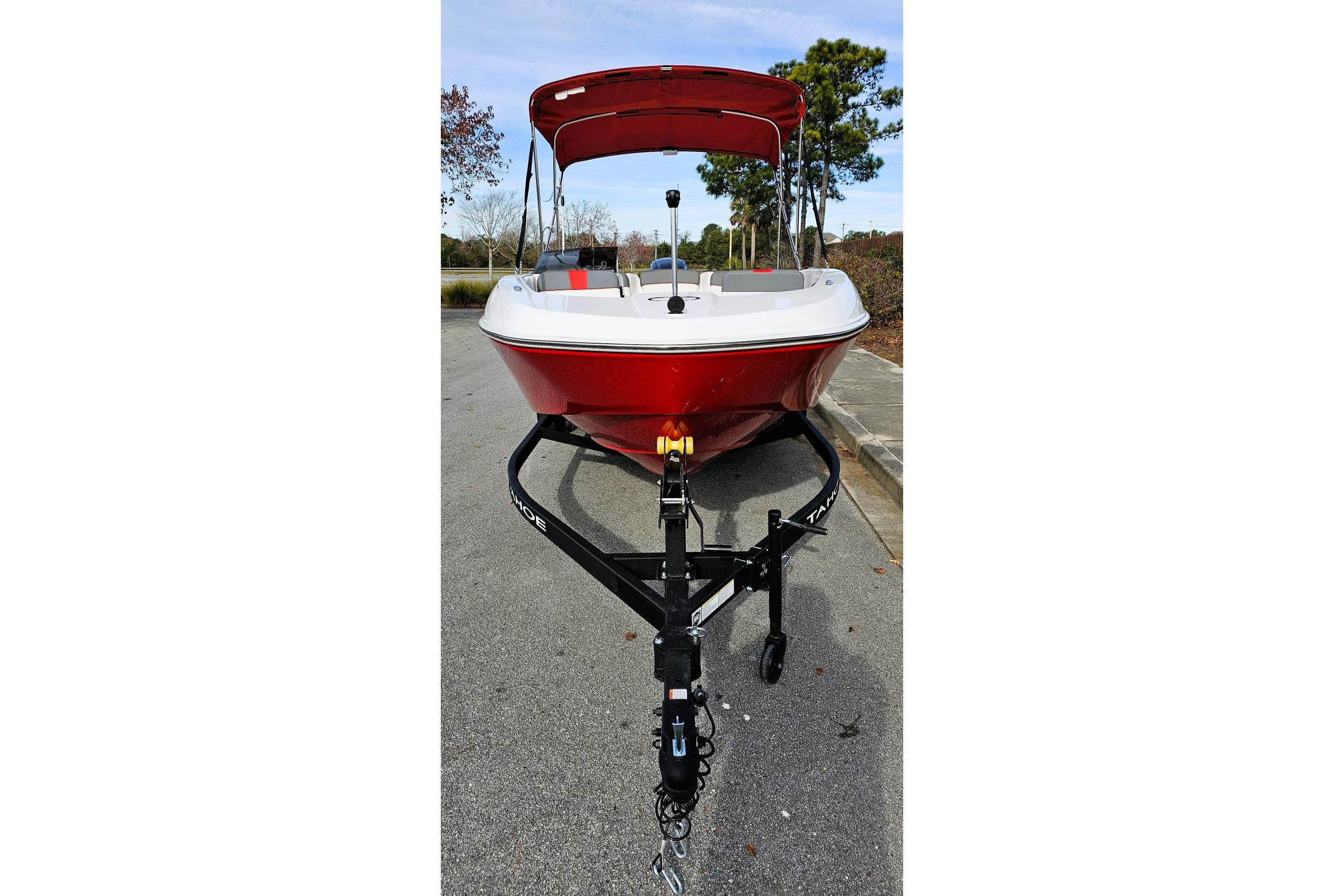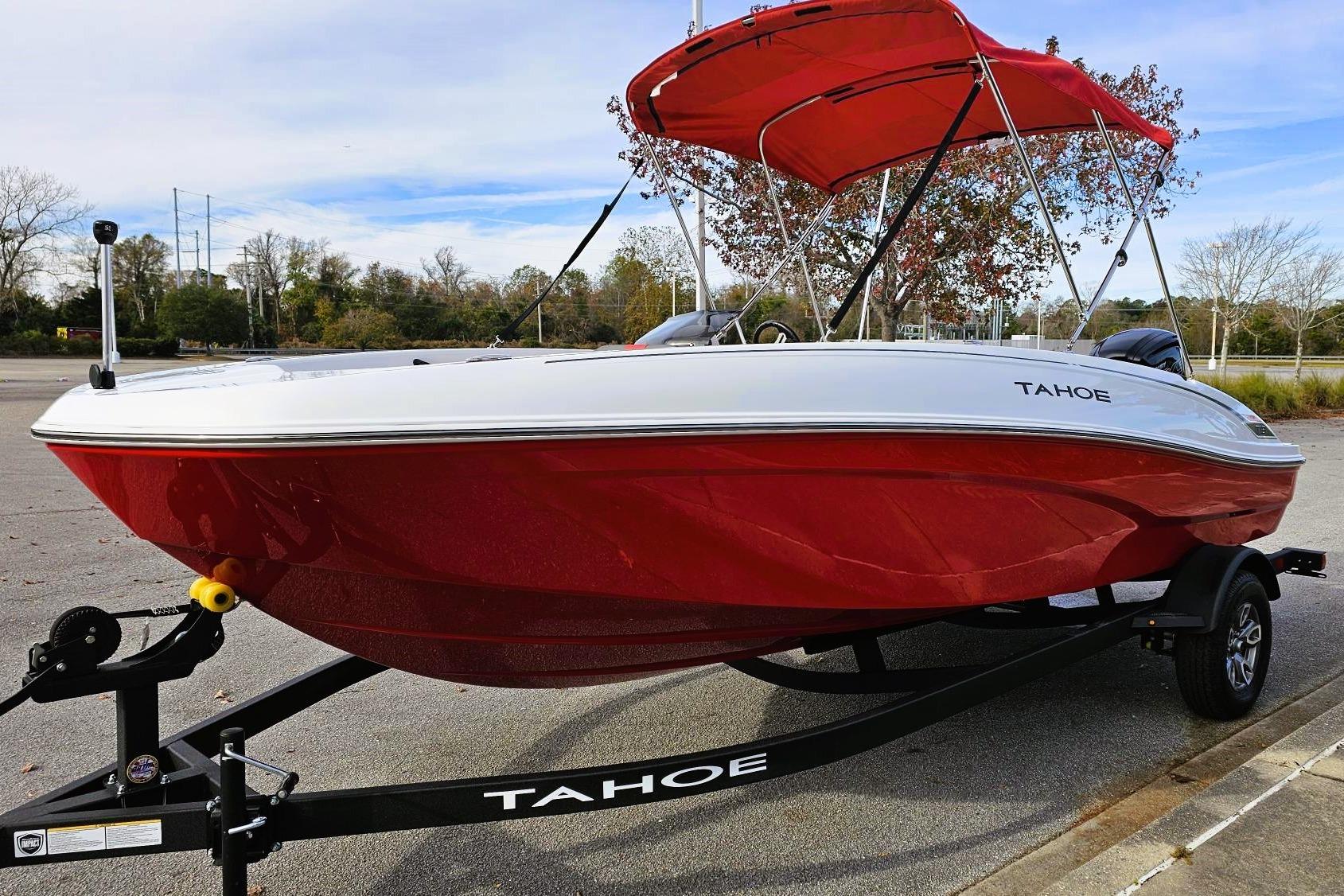 The 2025 TAHOE® T18 comes standard with a 90hp Mercury® ELPT FourStroke outboard motor and has a recommended maximum 115hp rating. This model is packaged with a trailer.