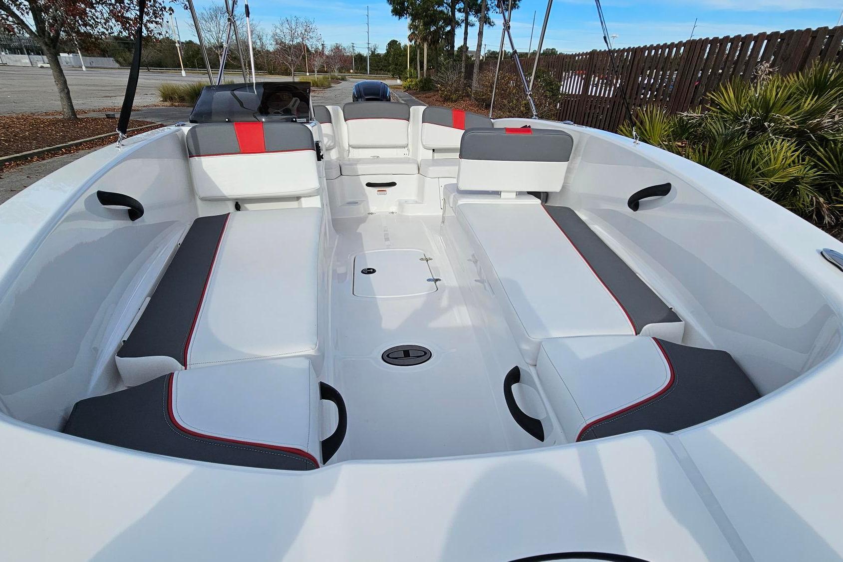 The aft swim platform with a 4-step telescoping boarding ladder makes it easy to jump in and out of the water. Find your favorite seat in the 3-across midship bench, dual forward lounges, or aft sun pad. The port bow backrest can be reversed for forward or aft seating and its cushion can even be flipped up so passengers don't step on the upholstery as they board. Add the optional bimini top to create the perfect lake-day boat your friends and family will love!