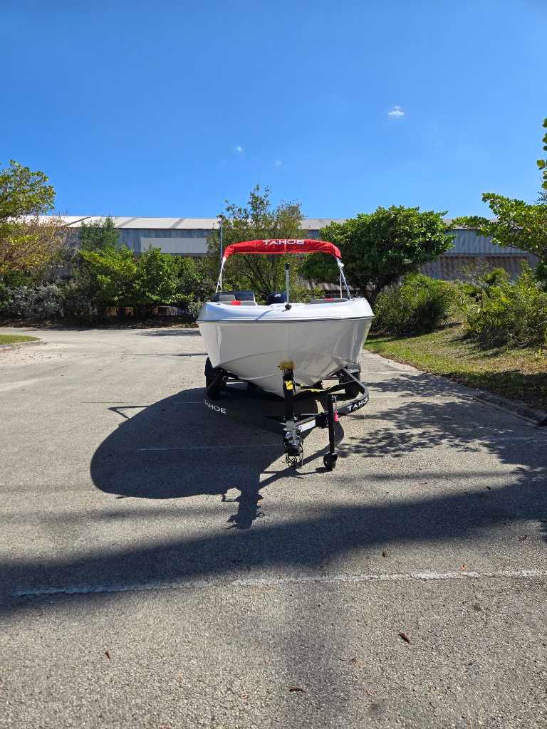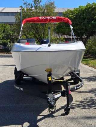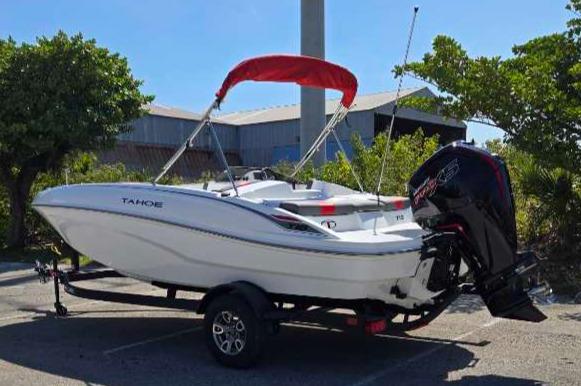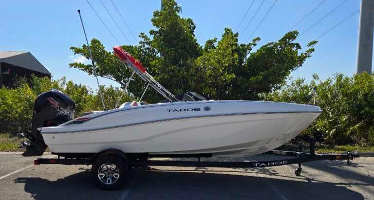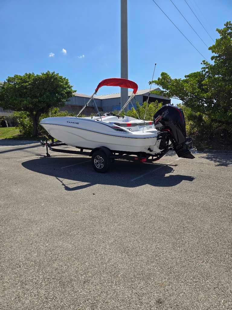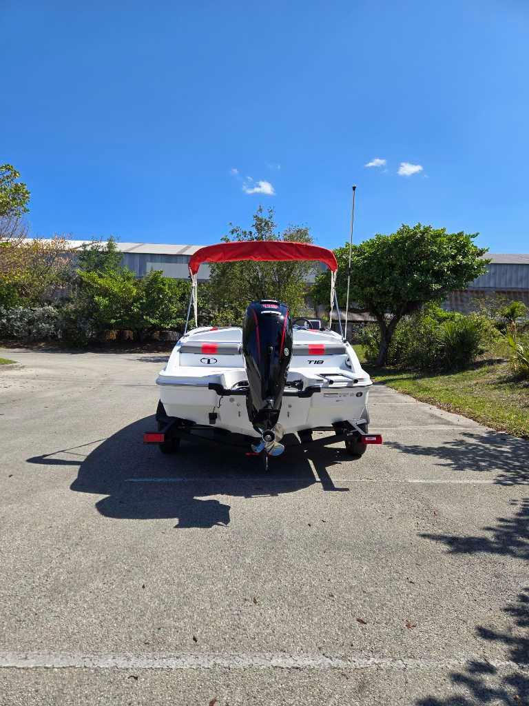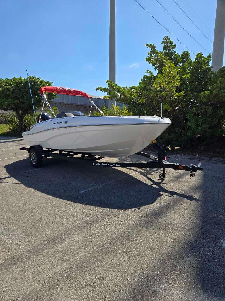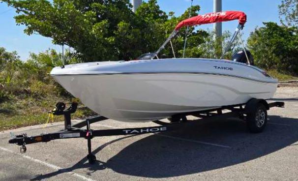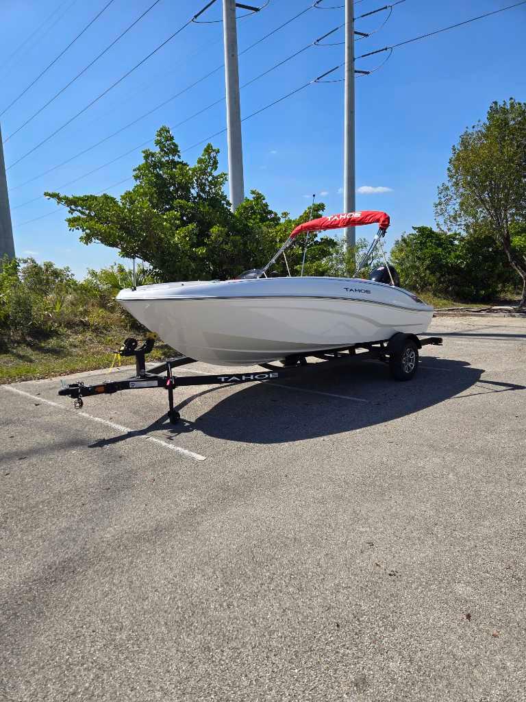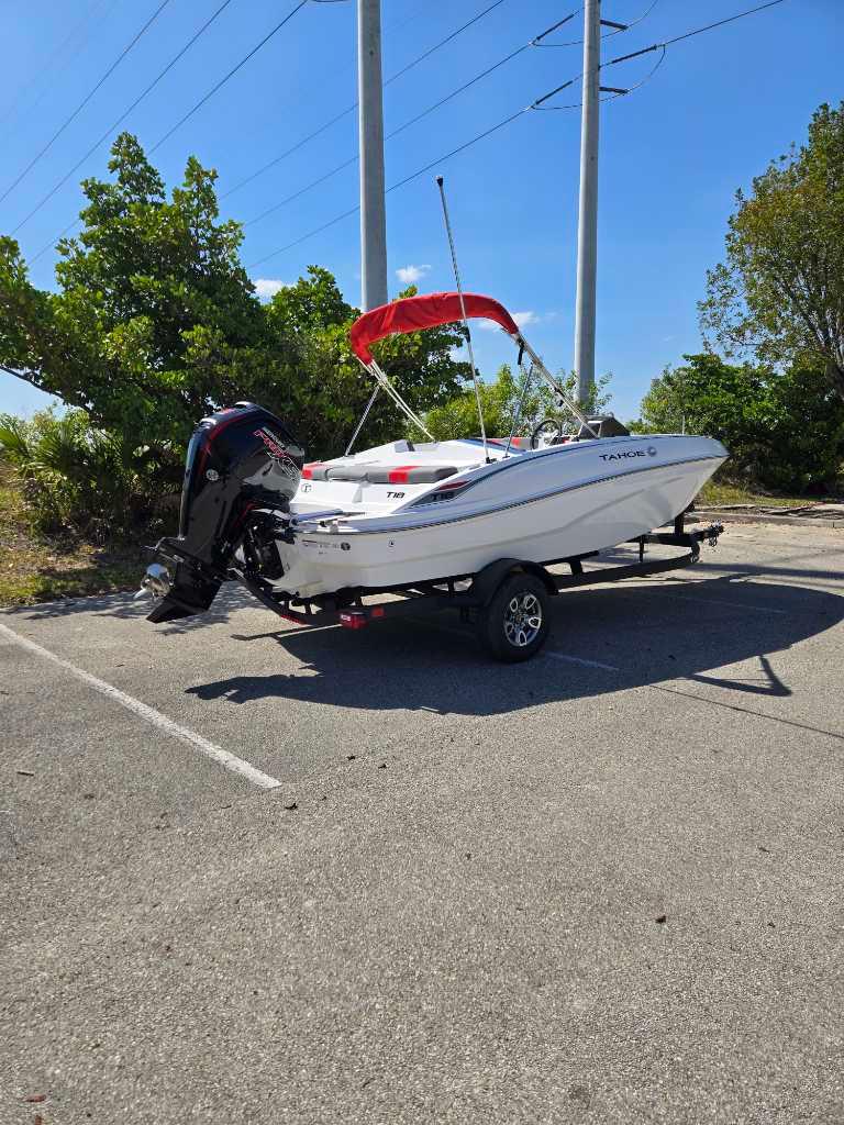The 2025 TAHOE® T18 comes standard with a 90hp Mercury® ELPT FourStroke outboard motor and has a recommended maximum 115hp rating. This model is packaged with a trailer.