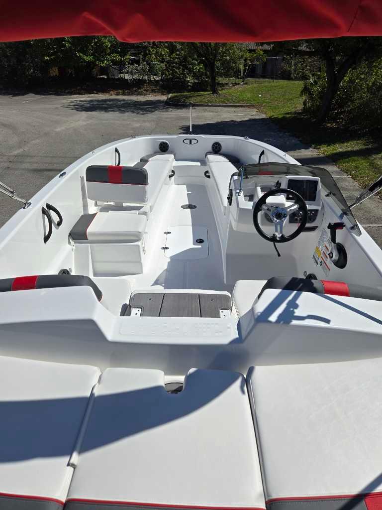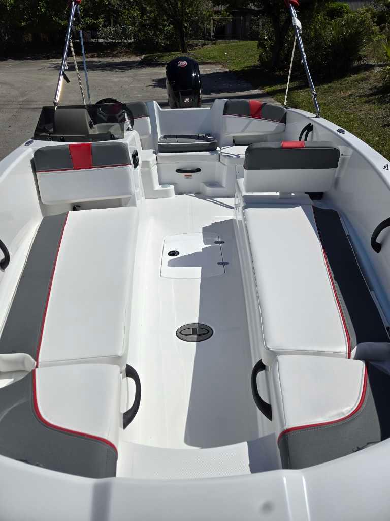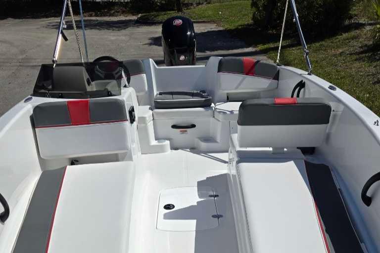 The aft swim platform with a 4-step telescoping boarding ladder makes it easy to jump in and out of the water. Find your favorite seat in the 3-across midship bench, dual forward lounges, or aft sun pad. The port bow backrest can be reversed for forward or aft seating and its cushion can even be flipped up so passengers don't step on the upholstery as they board. Add the optional bimini top to create the perfect lake-day boat your friends and family will love!
