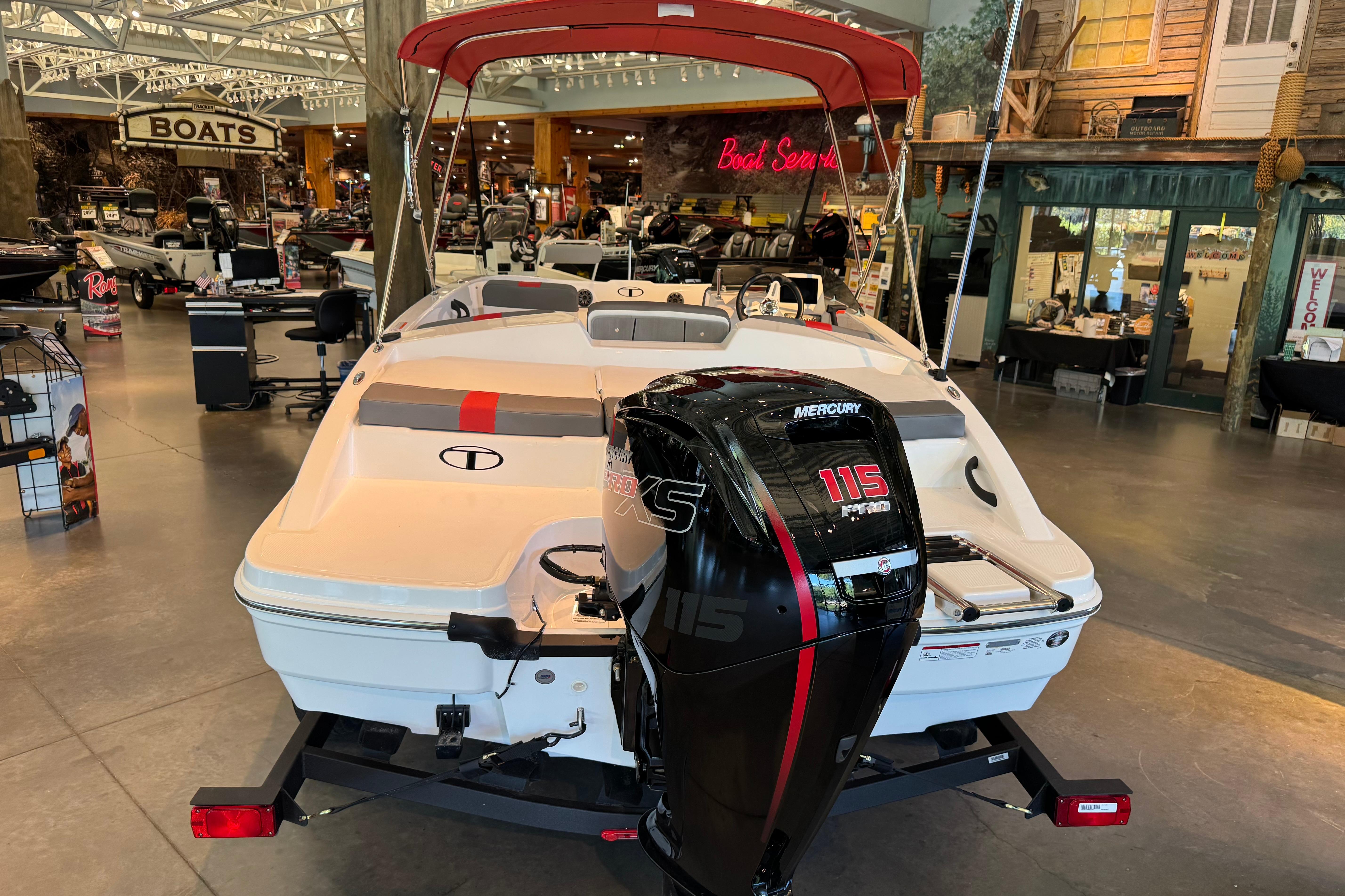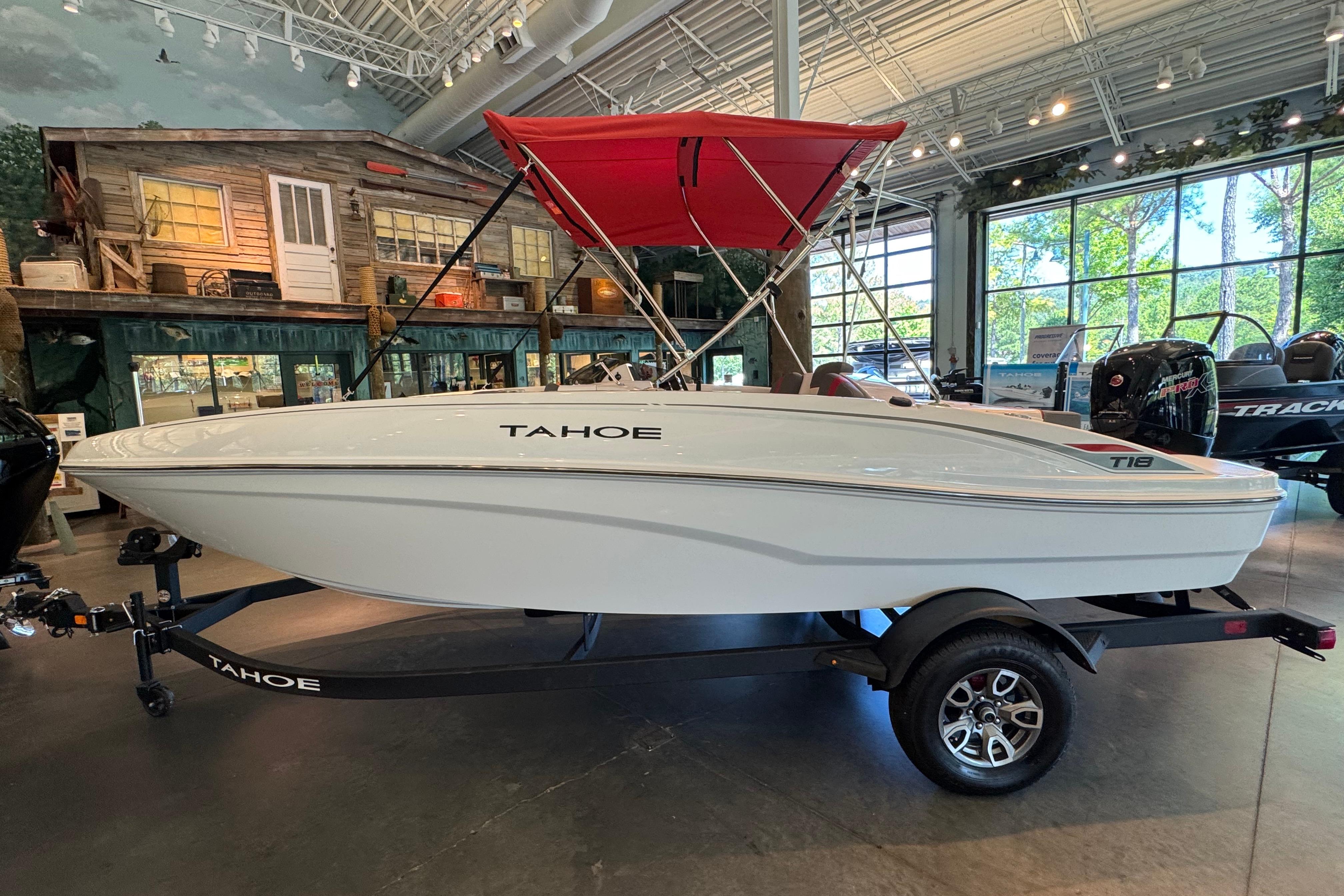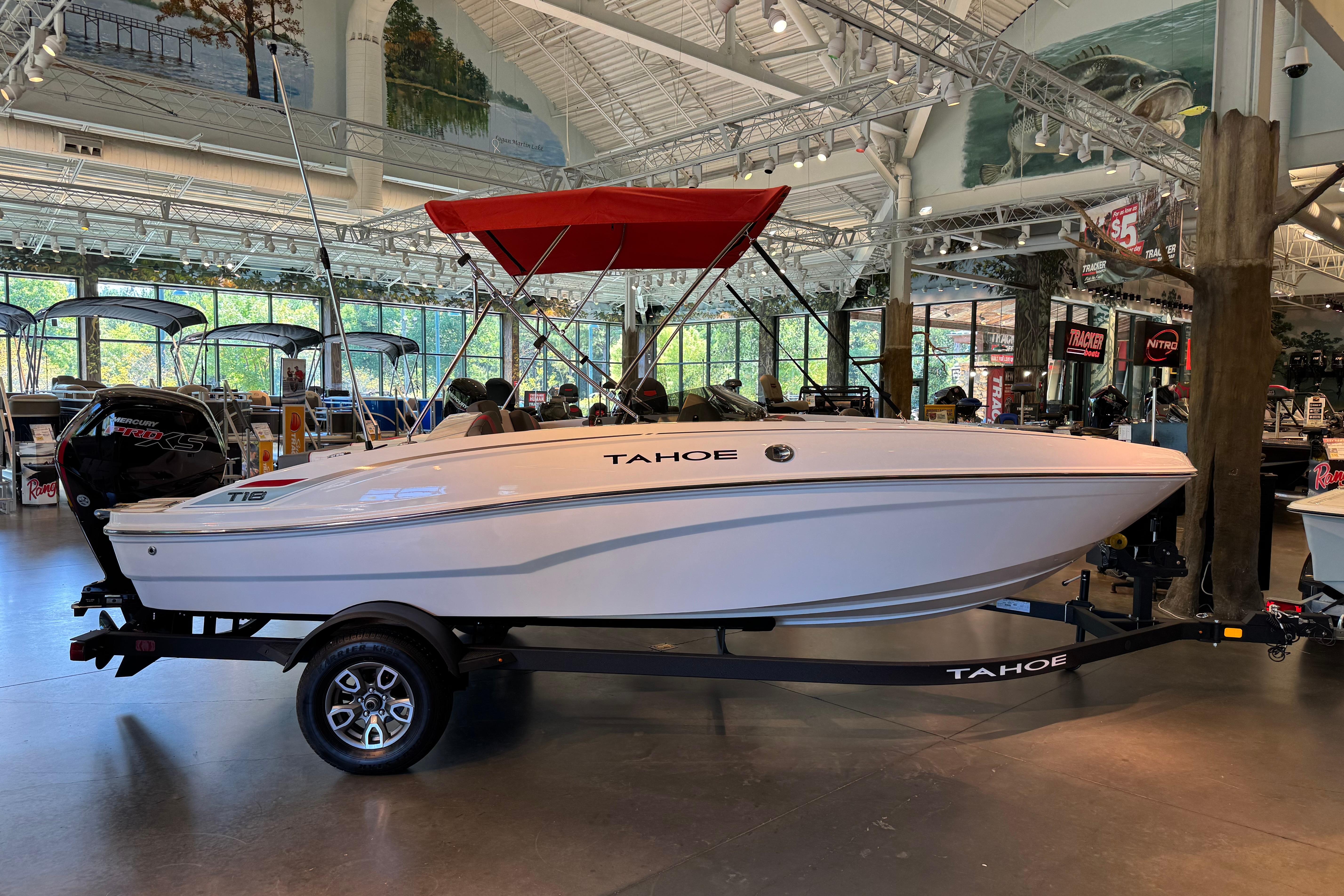 The 2025 TAHOE® T18 comes standard with a 90hp Mercury® ELPT FourStroke outboard motor and has a recommended maximum 115hp rating. This model is packaged with a trailer.