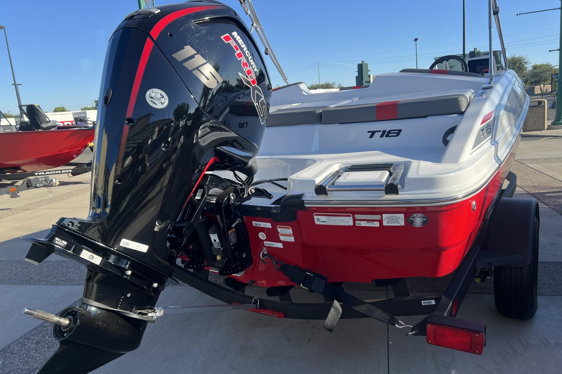 The 2025 TAHOE® T18 comes standard with a 90hp Mercury® ELPT FourStroke outboard motor and has a recommended maximum 115hp rating. This model is packaged with a trailer.