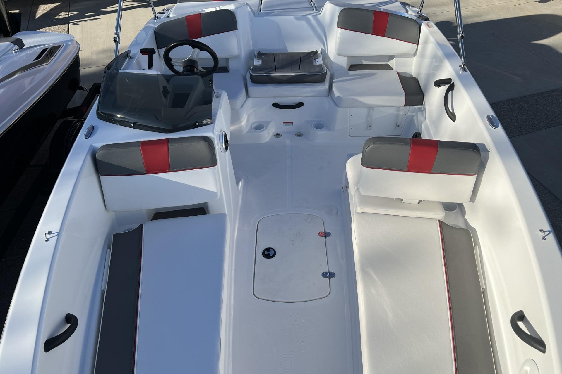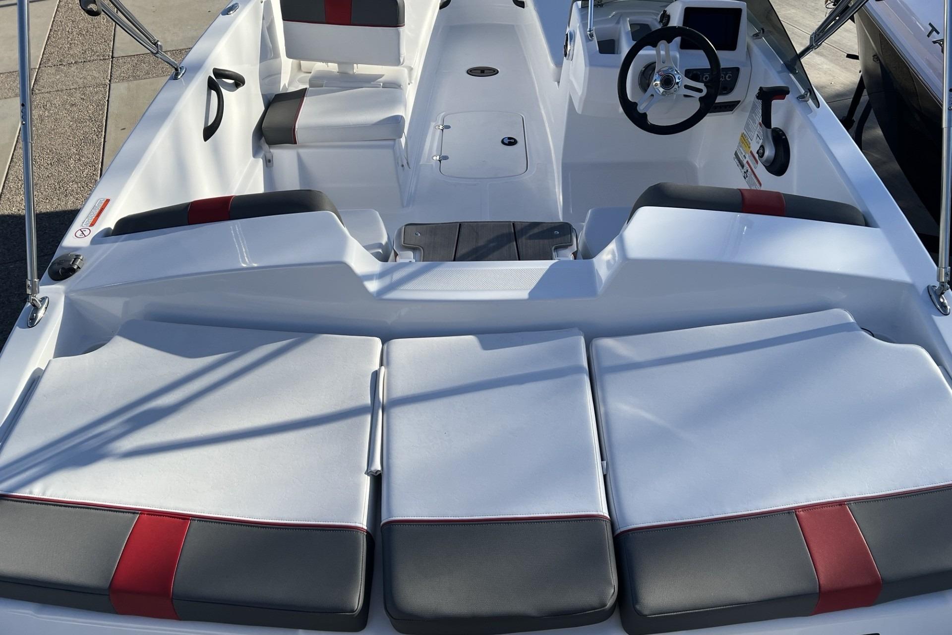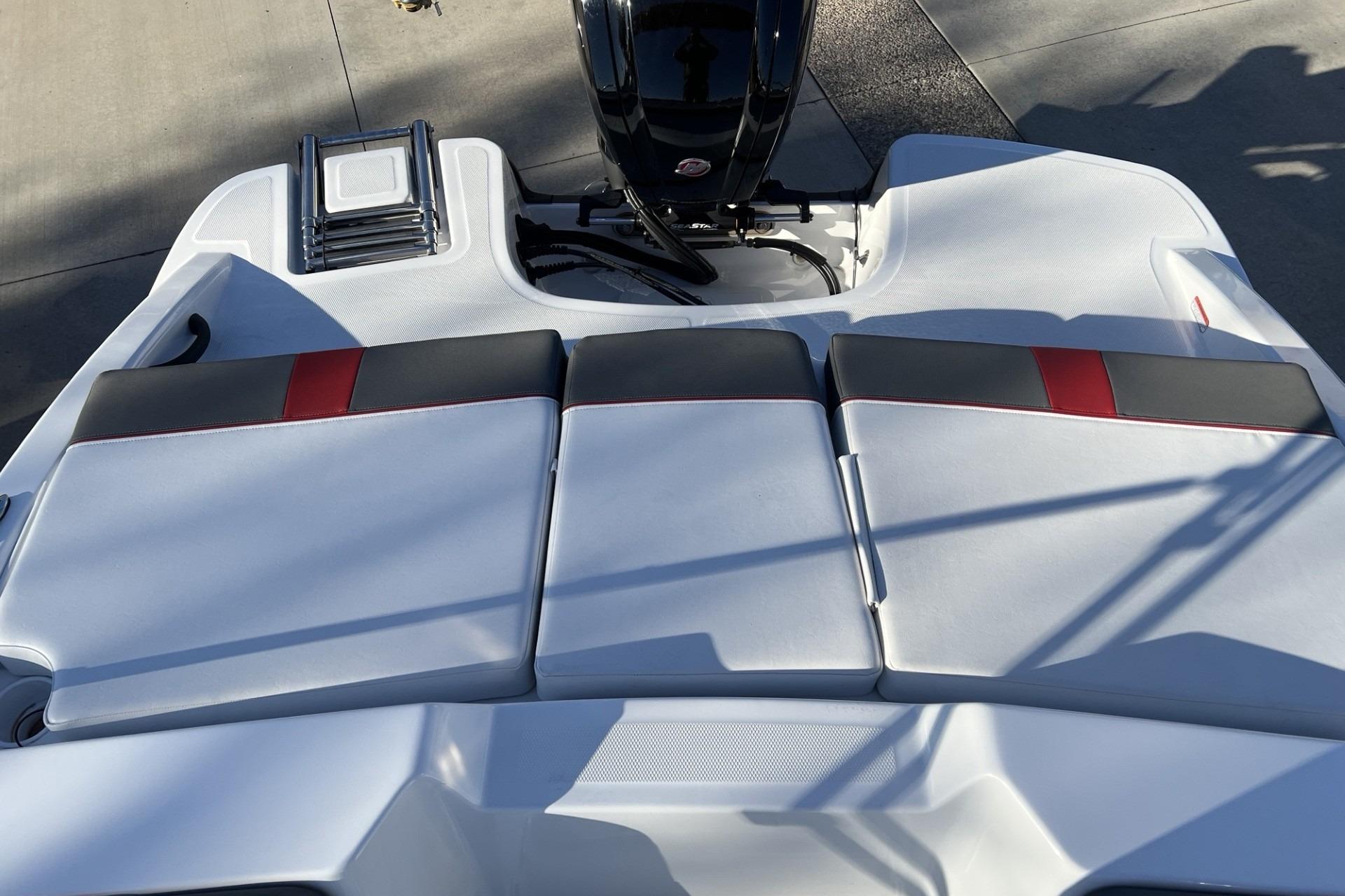The aft swim platform with a 4-step telescoping boarding ladder makes it easy to jump in and out of the water. Find your favorite seat in the 3-across midship bench, dual forward lounges, or aft sun pad. The port bow backrest can be reversed for forward or aft seating and its cushion can even be flipped up so passengers don't step on the upholstery as they board. Add the optional bimini top to create the perfect lake-day boat your friends and family will love!