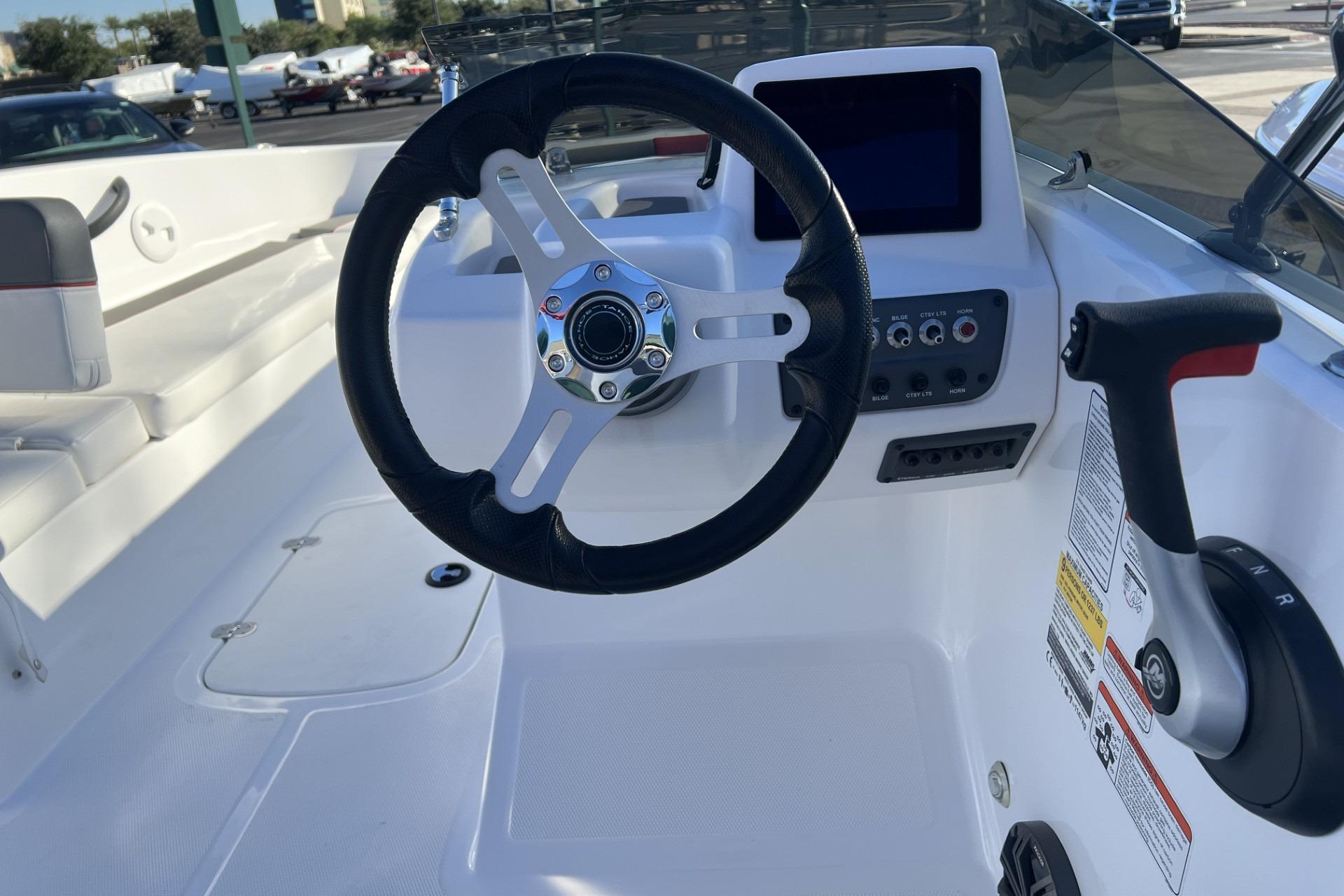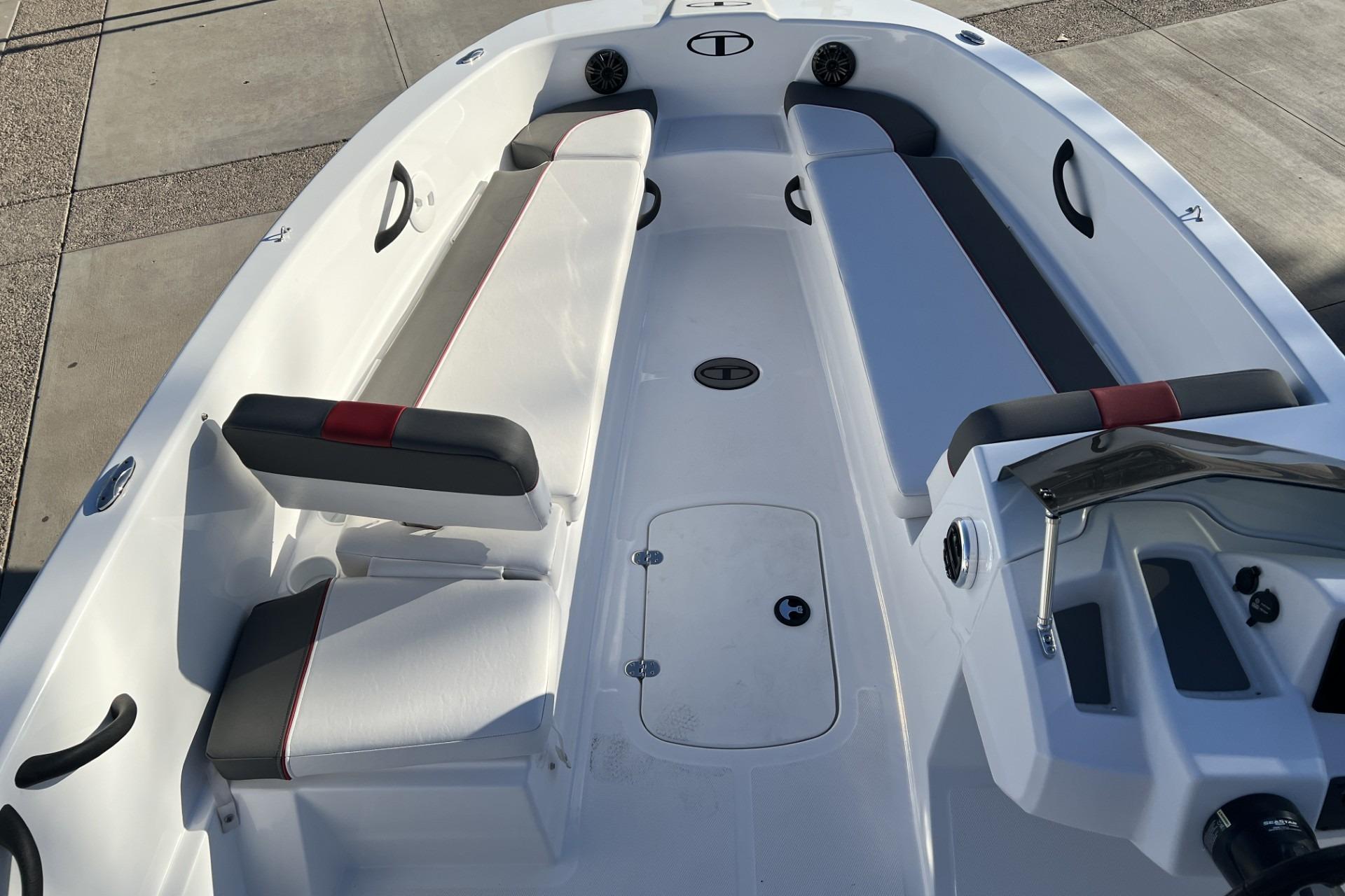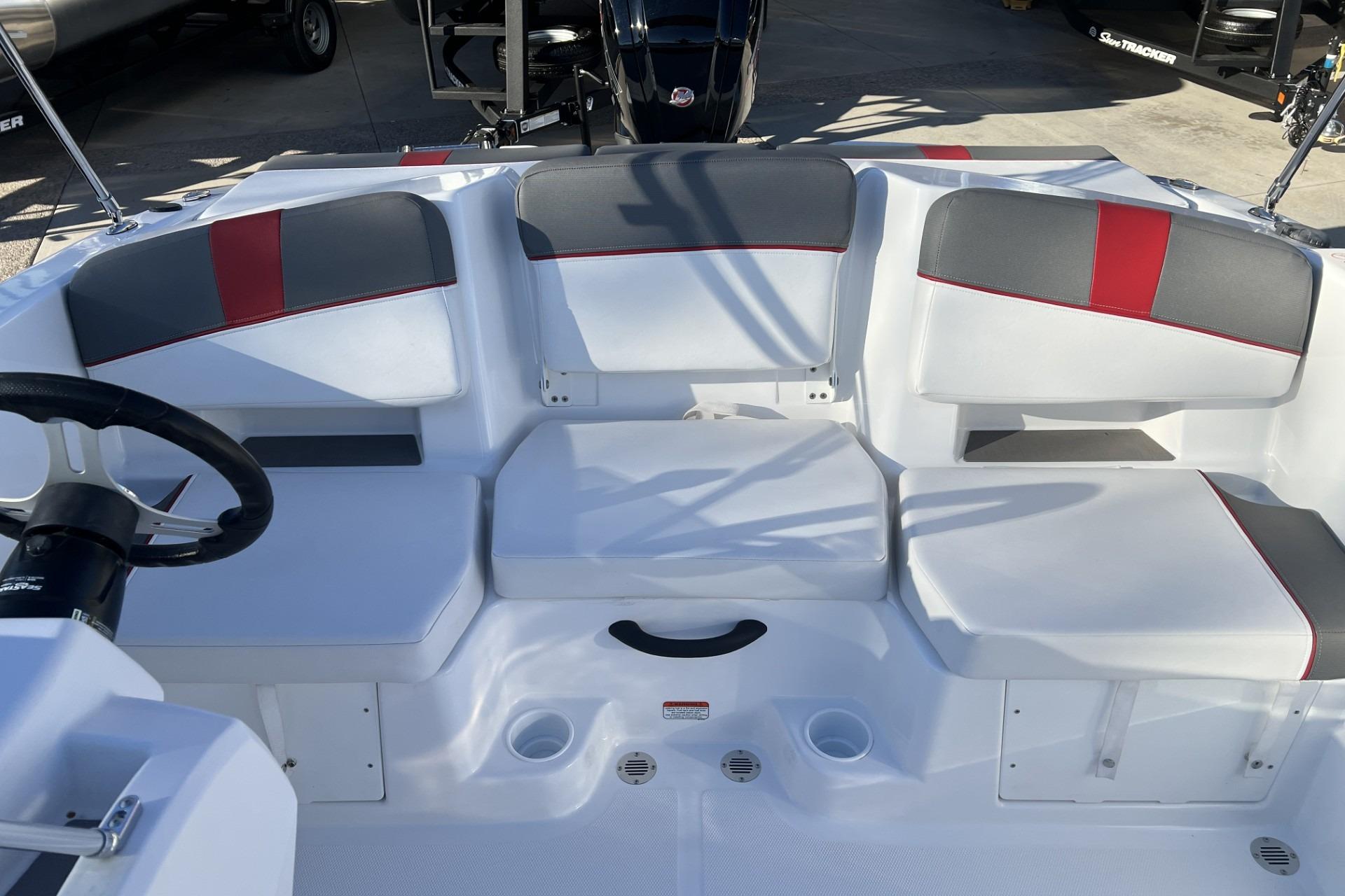 The aft swim platform with a 4-step telescoping boarding ladder makes it easy to jump in and out of the water. Find your favorite seat in the 3-across midship bench, dual forward lounges, or aft sun pad. The port bow backrest can be reversed for forward or aft seating and its cushion can even be flipped up so passengers don't step on the upholstery as they board. Add the optional bimini top to create the perfect lake-day boat your friends and family will love!