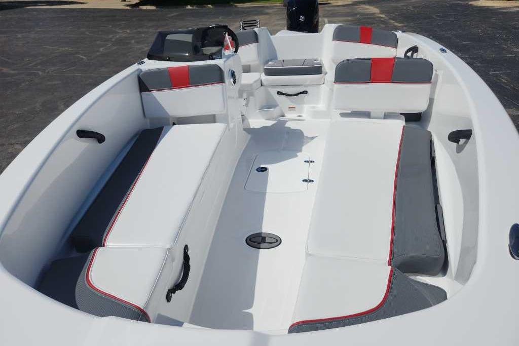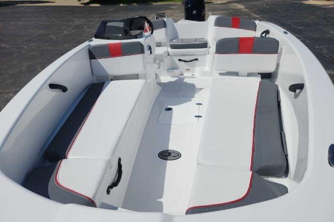 The aft swim platform with a 4-step telescoping boarding ladder makes it easy to jump in and out of the water. Find your favorite seat in the 3-across midship bench, dual forward lounges, or aft sun pad. The port bow backrest can be reversed for forward or aft seating and its cushion can even be flipped up so passengers don't step on the upholstery as they board. Add the optional bimini top to create the perfect lake-day boat your friends and family will love!