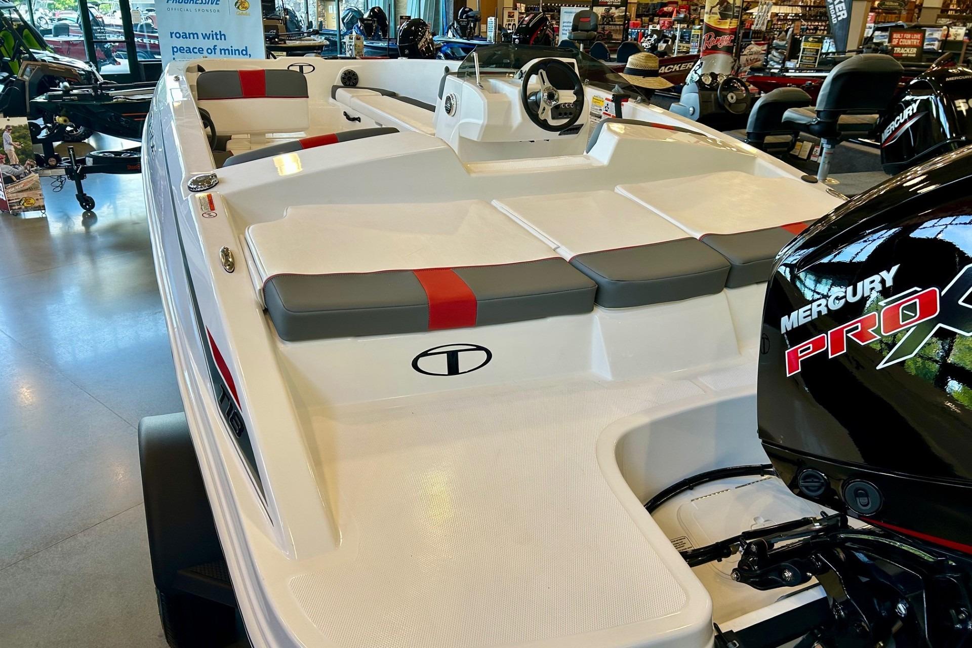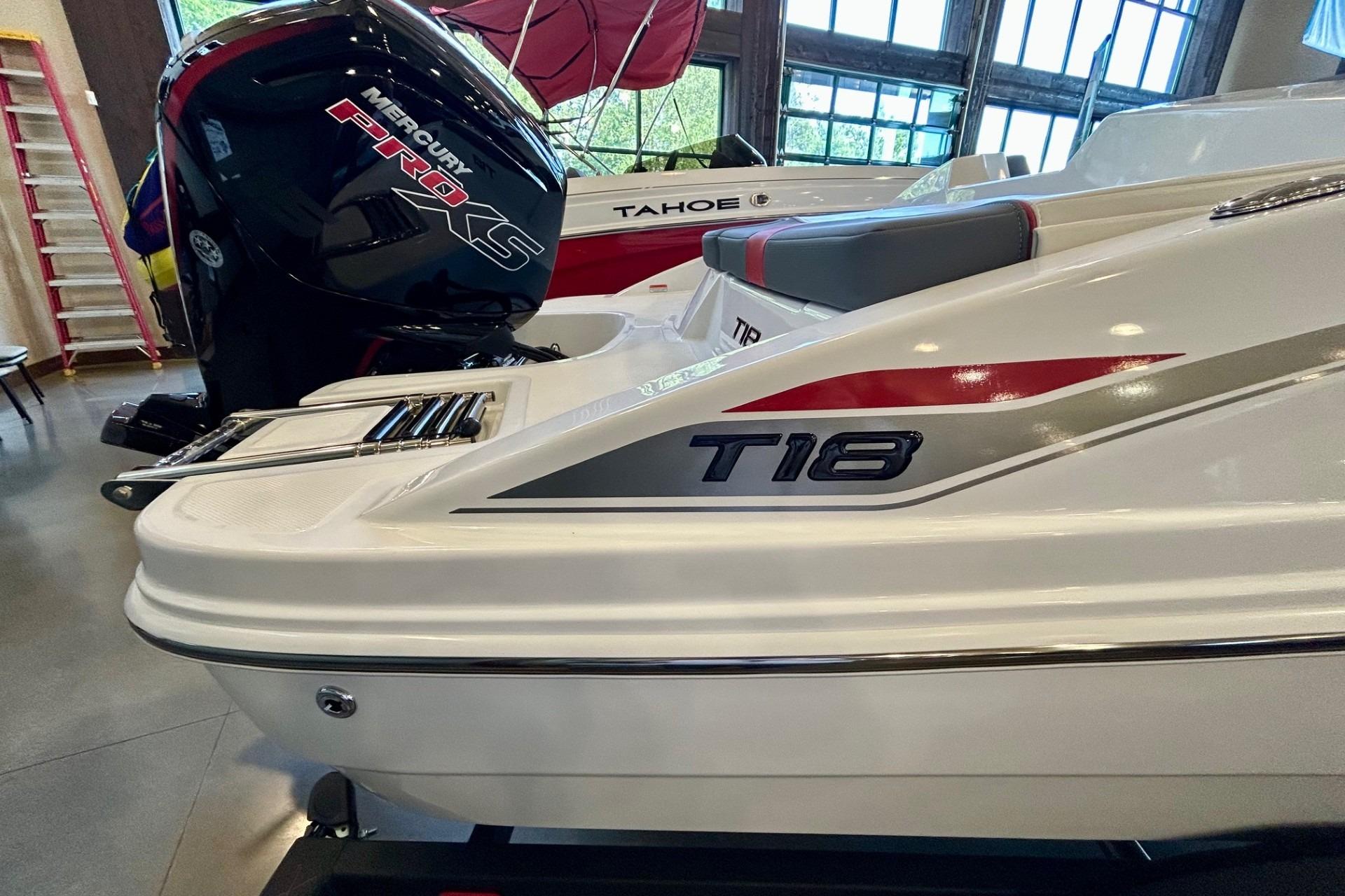The 2025 TAHOE® T18 comes standard with a 90hp Mercury® ELPT FourStroke outboard motor and has a recommended maximum 115hp rating. This model is packaged with a trailer.