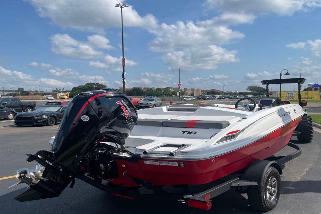 The 2025 TAHOE® T18 comes standard with a 90hp Mercury® ELPT FourStroke outboard motor and has a recommended maximum 115hp rating. This model is packaged with a trailer.