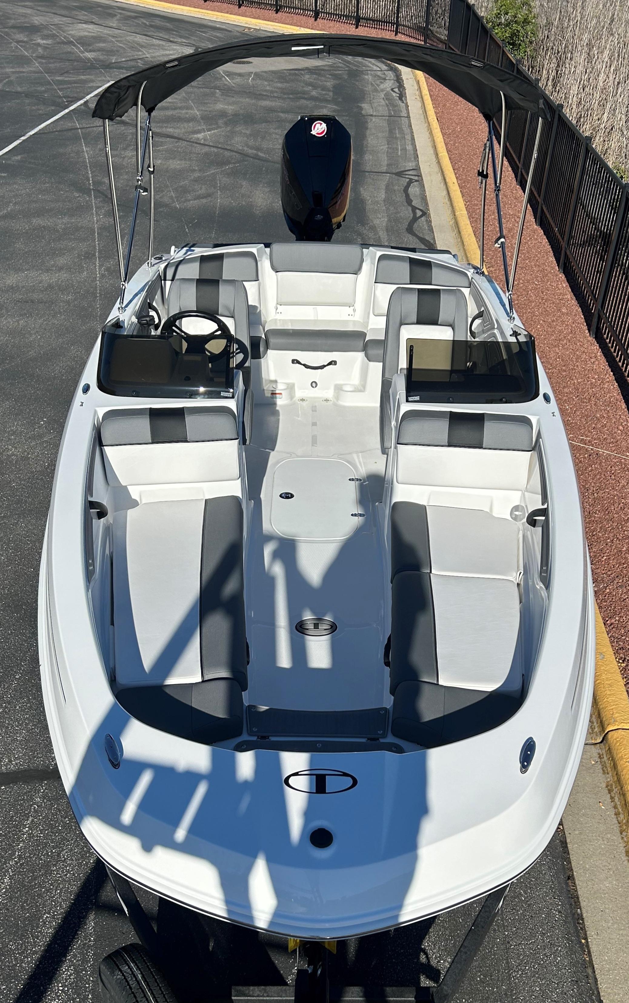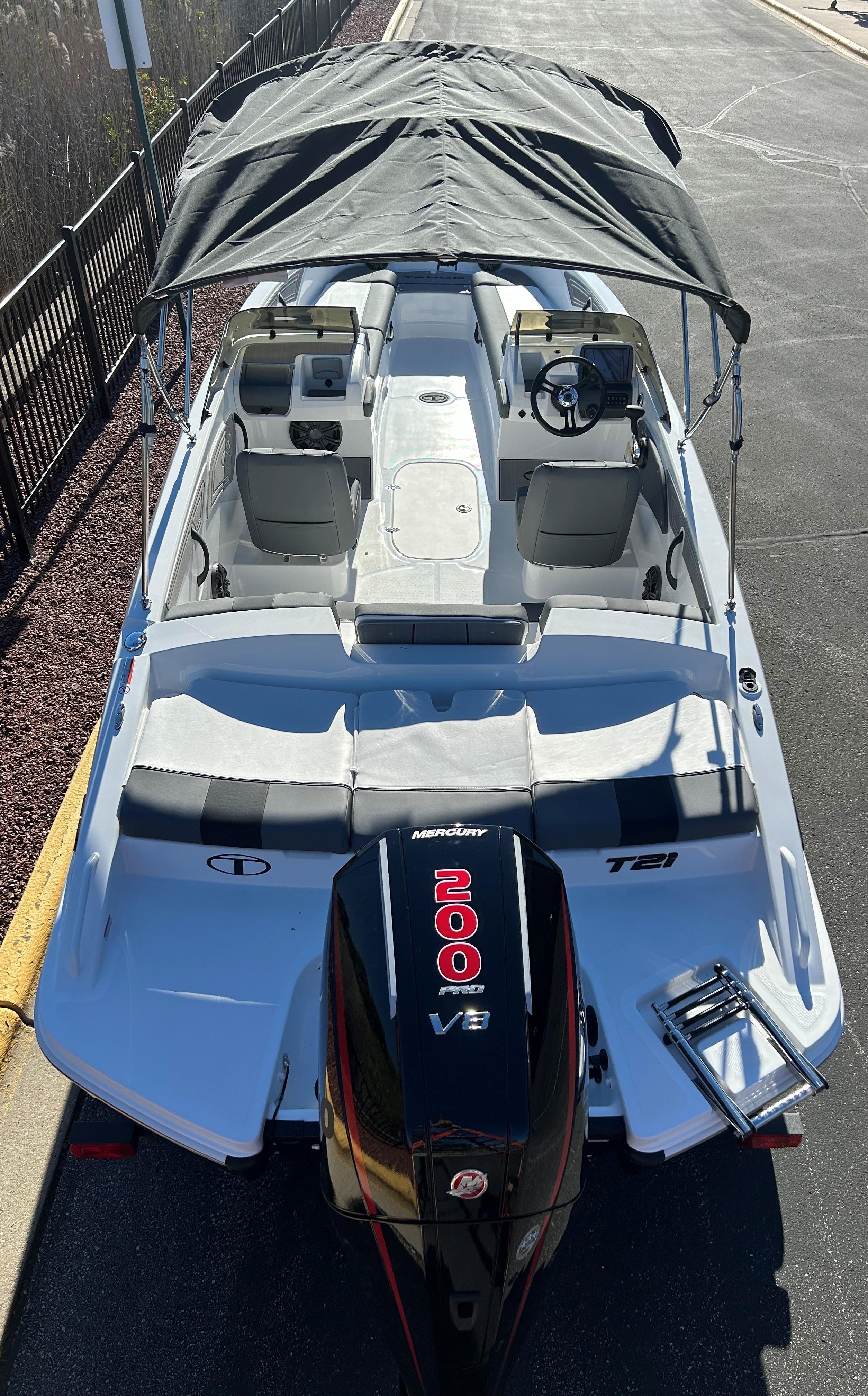 The 2025 TAHOE® T21 comes standard with a 150hp Mercury® XL Pro XS® FourStroke outboard motor and has a recommended maximum 200hp rating. This model is packaged with a trailer.
