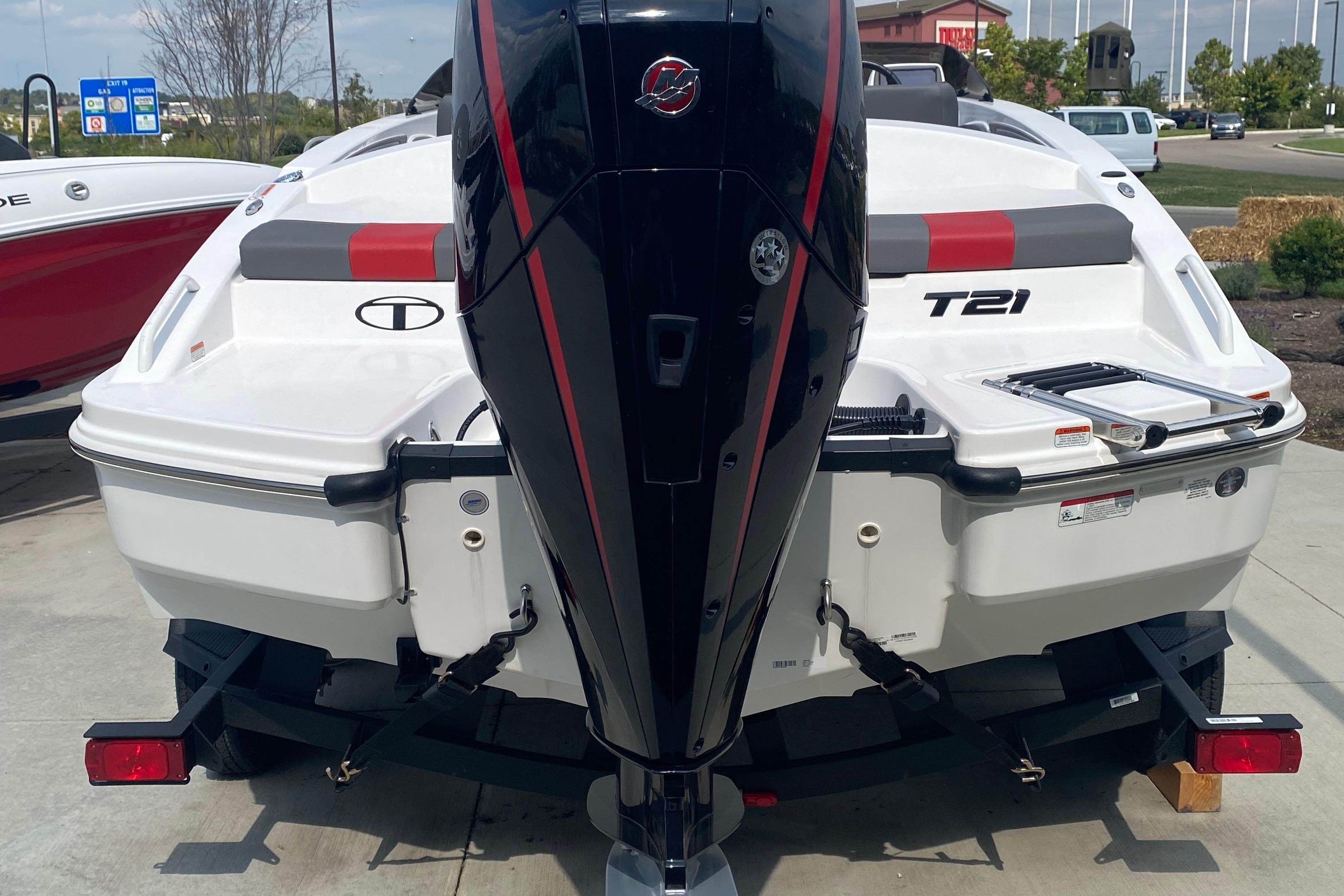 The 2025 TAHOE® T21 comes standard with a 150hp Mercury® XL Pro XS® FourStroke outboard motor and has a recommended maximum 200hp rating. This model is packaged with a trailer.