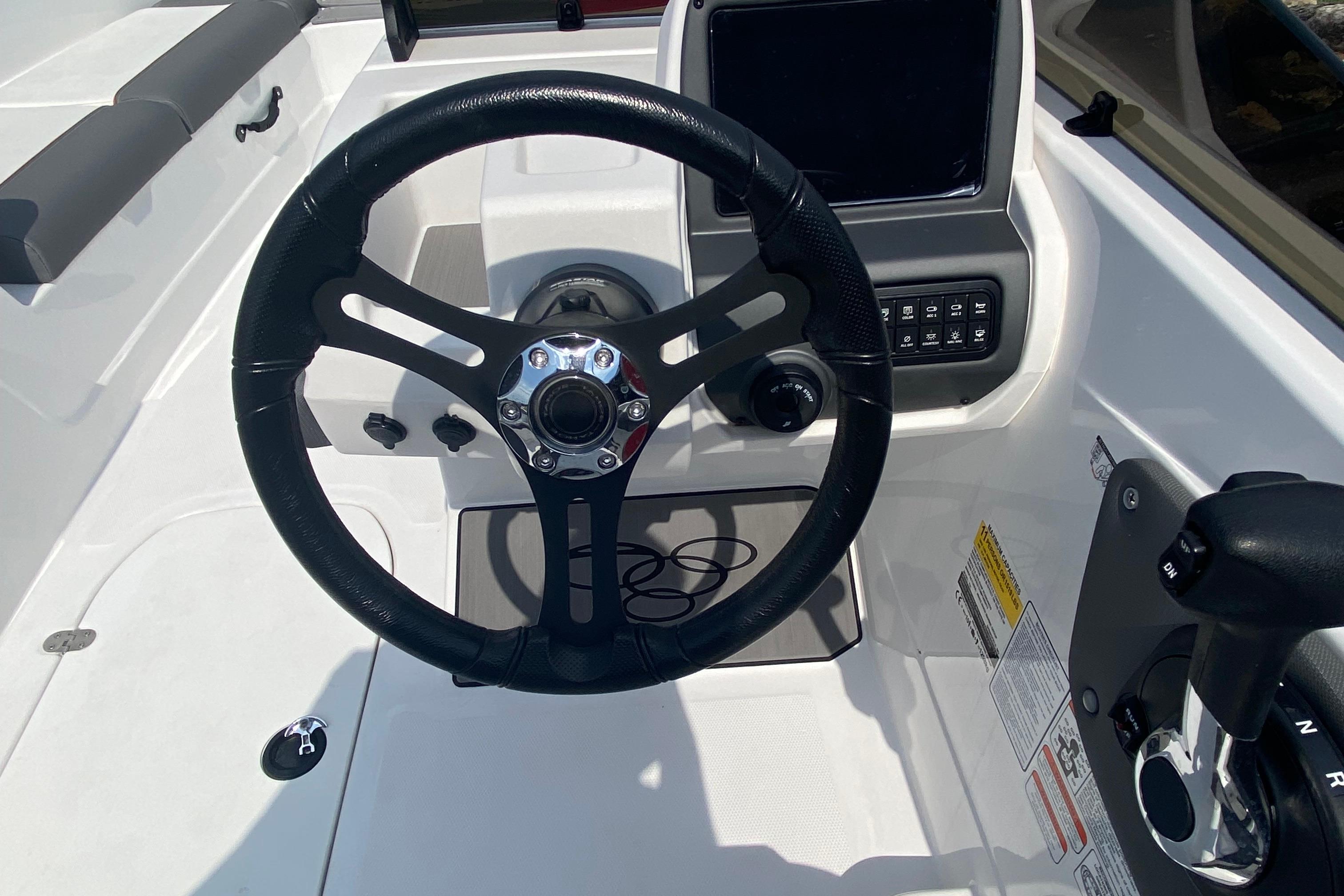 Take your places in the luxurious dual forward lounges, dual midship bucket seats, and the aft 3-across bench. You’ll find space for your gear and supplies under the seats and sun-pad cushions, consoles, and the in-floor storage compartment. When you’ve found a cove you want to explore, the anchor locker, dual aft swim platforms, and telescoping ladder make diving into the waters and getting back into the boat easy.