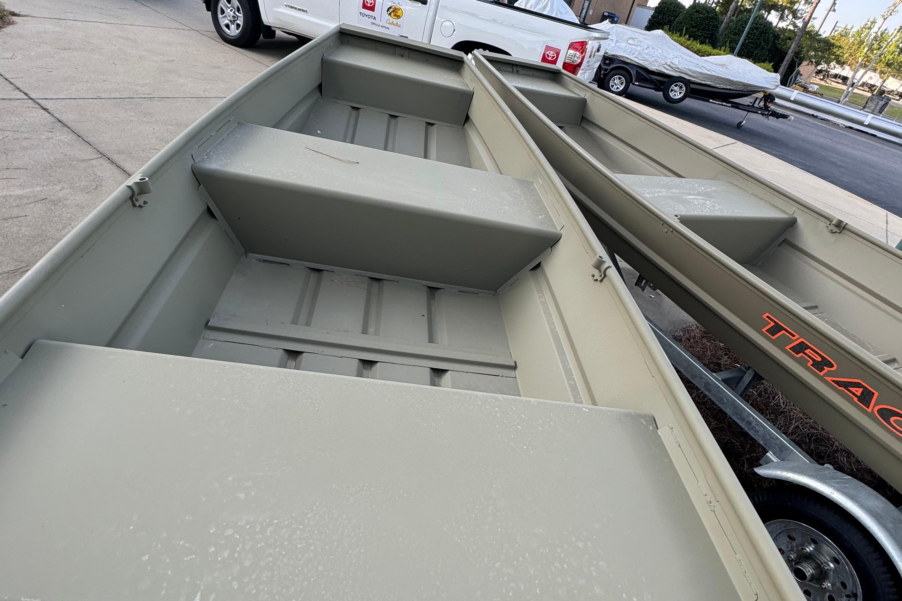 Step aboard the TRACKER GRIZZLY 12 jon boat, with the standout feature of the TRACKER GRIZZLY 12 jon boat lies in its all-welded hull design, setting it apart with unmatched durability and structural integrity. Unlike boats with riveted hulls that may develop leaks or weak points over time, the all-welded construction of the GRIZZLY 12 forms a solid and seamless foundation. This sturdy design not only prolongs the boat's lifespan but also enhances its performance on the water, ensuring a smooth and stable ride across diverse conditions.