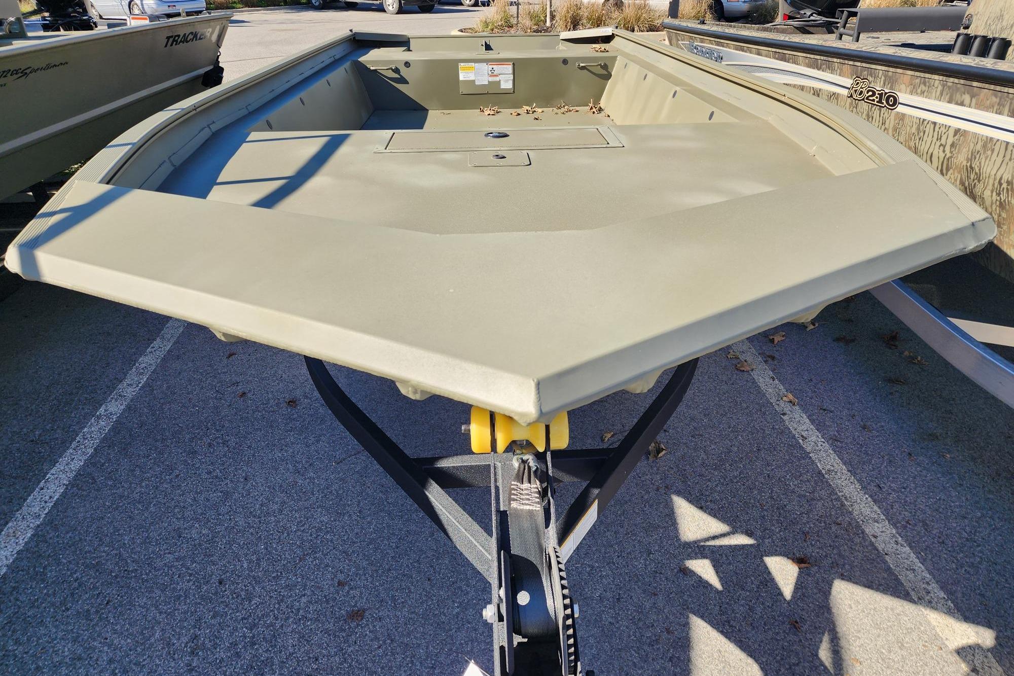 The all-welded TRACKER GRIZZLY 1648 Jon boat is a rugged and adaptable aluminum vessel that can seamlessly transition between fishing, hunting, or working duties with ease. Its unitized stringer, transom, and hull construction ensure a solid and durable build, providing a stable and dry ride is various water conditions. Equipped with a robust .190 aluminum cockpit floor and a spacious front deck featurig a lockable storage compartmet, the 1648 offers ample storage and versatility for all your outdoor activities. The 7° deadrise Mod V hill delivers a smooth and dry ride, enhancing your comfort and control on the water. Finished with a distrinctive Forest Green powder coat and SURE TREAD teture on the floor, this jon boat combines style with practicality. As with all TRACKER boats, the GIRZZLY 1648 is backed by the reliable TRACKER PROMISE, ensuring the best factory warranty available for aluminum boats. Experience the unmatched performance, versatility, and durability of the Tracker Grizzly 1648 jon boat, designed to tackle any challenge and provide you with endless outdoor adventures with confidence and peace of mind.