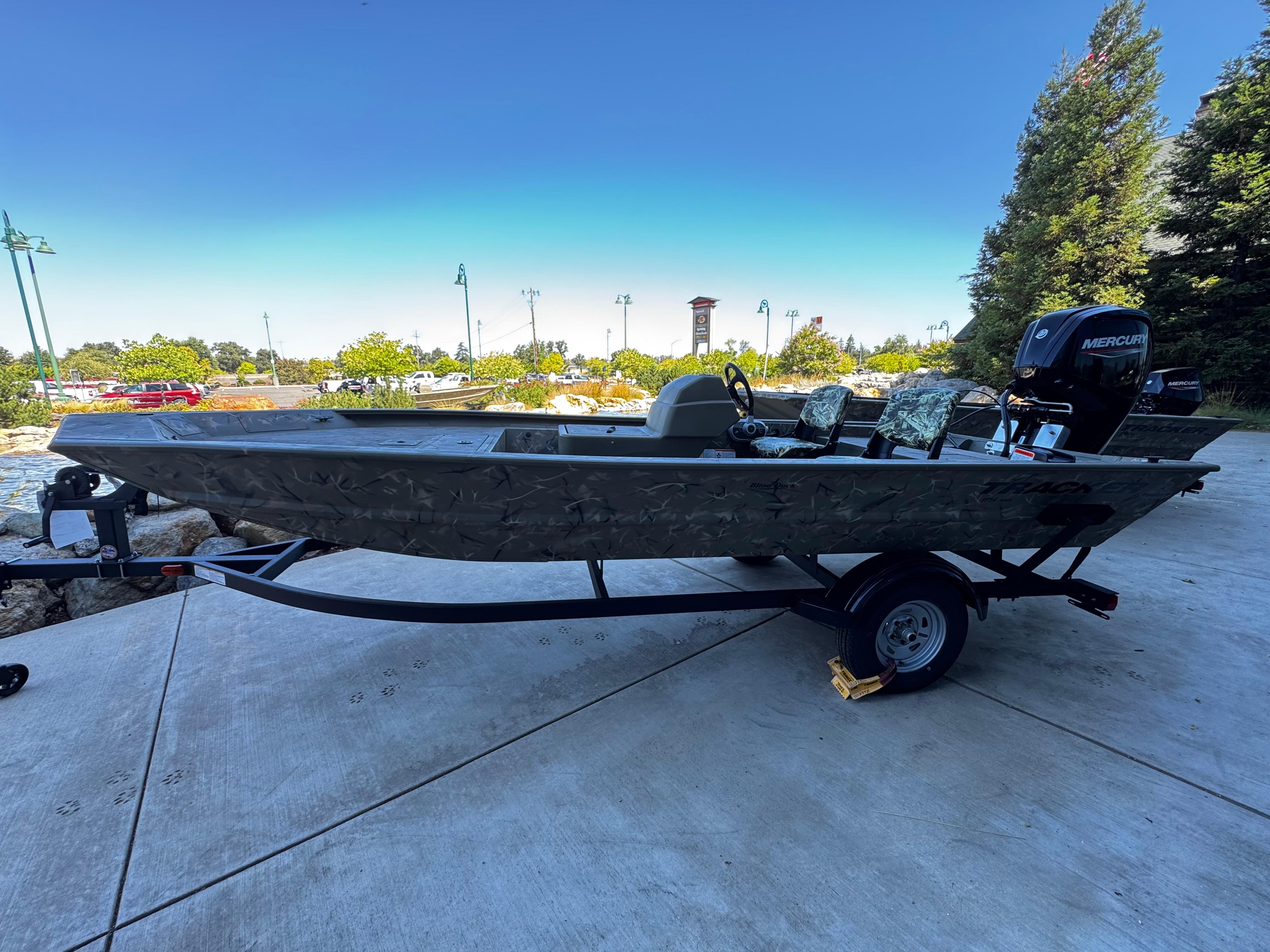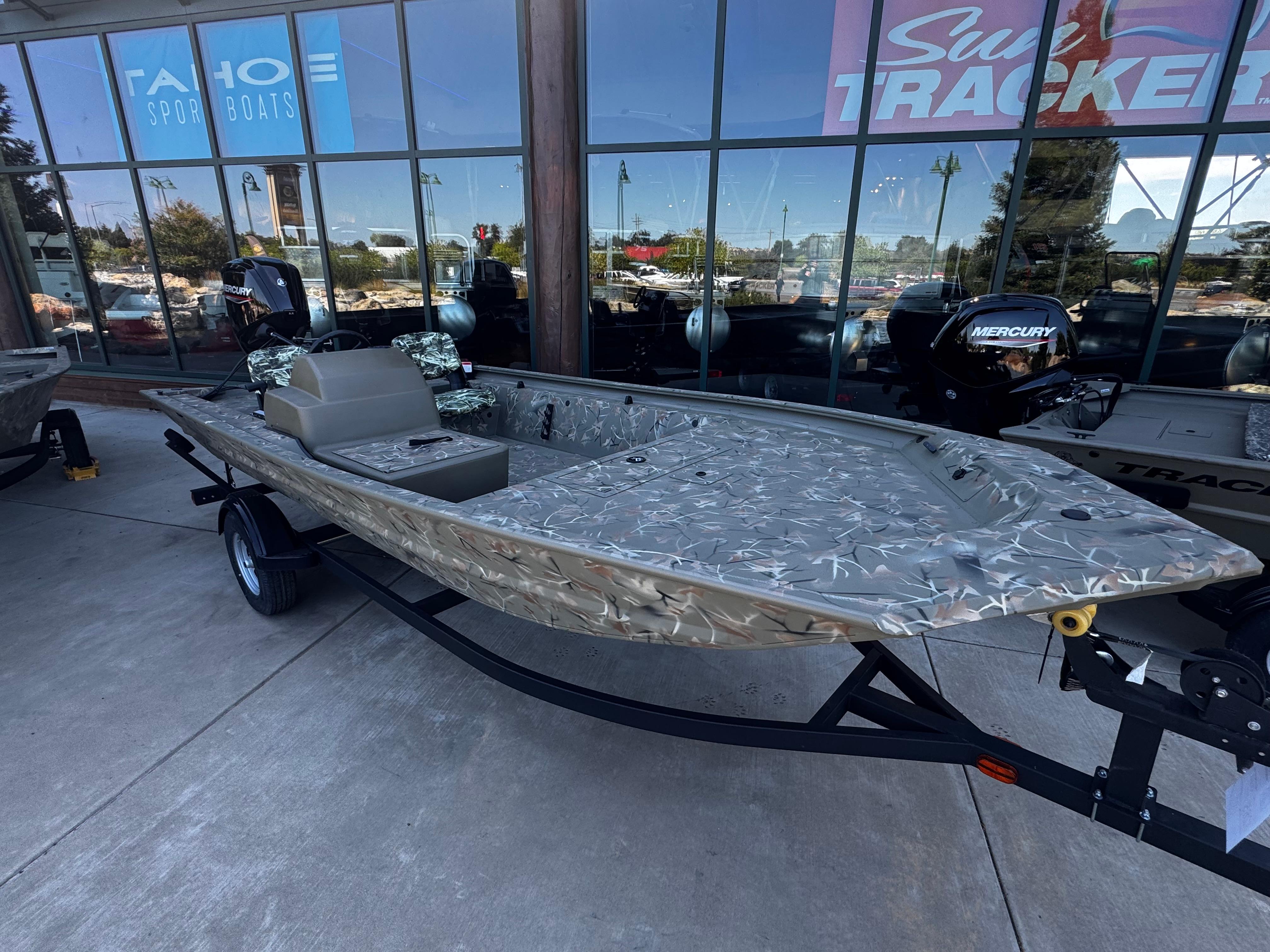 Pricing includes a Mercury 65HP jet motor mounted on a static jack plate, includes battery and is in woodland camo color