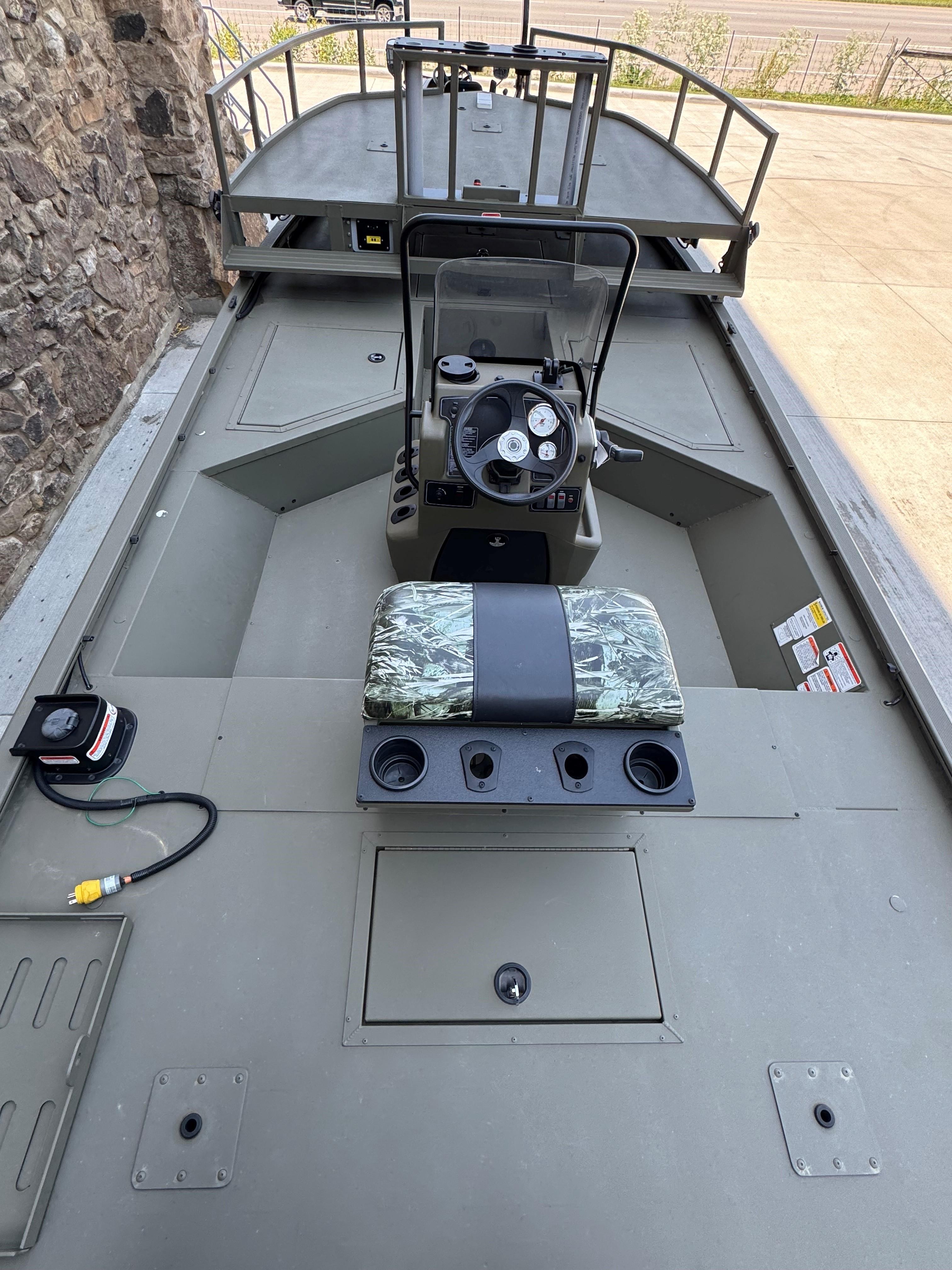 • Removable & elevated bow shooting deck w/trim switch, railing, rail-mounted utility tray w/arrow, tool & drink holders, 2 pedestal seat base locations & 160W Outrigger Outdoors® bowfishing lights