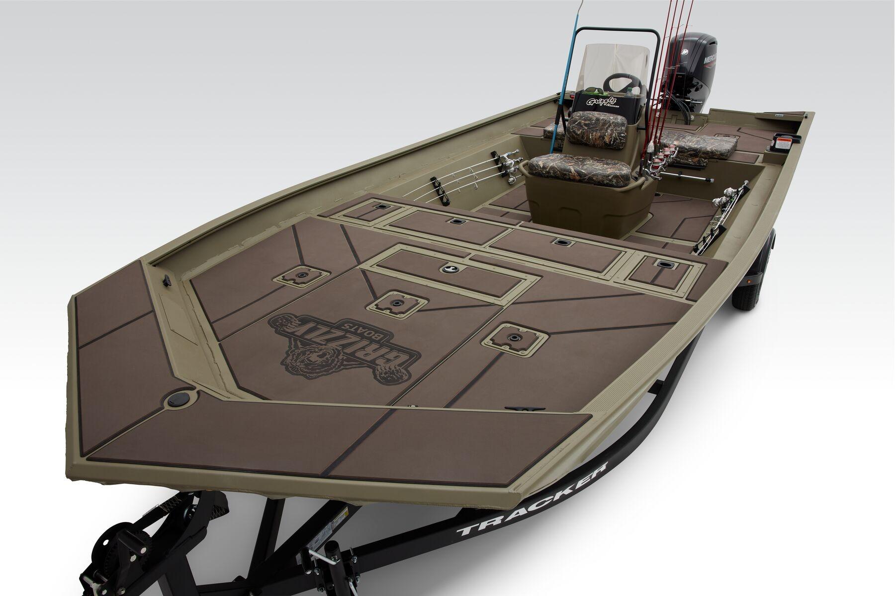 Prepare for an unparalleled bowfishing adventure with the TRACKER® GRIZZLY® 2072 CC Sportsman, a remarkable vessel designed to enhance your targeting accuracy and overall experience on the water. The elevated deck feature positions you at a higher vantage point, allowing for precise targeting with your bow and reducing arrow deflection. To further elevate your bowfishing game, we have equipped this revamped boat with ten super-bright LEDs, illuminating your quarry with an impressive 100,000 lumens both inside and outside the vessel. Experience enhanced user-friendliness with a leaning post and storage compartments, ensuring that every aspect of your bowfishing excursion is optimized for convenience and enjoyment. The 100% aluminum construction of the GRIZZLY 2072 CC Sportsman, featuring a .100 hull and .190 floor, guarantees long-term durability and reliability. The all-welded hull, stringer, transom, and decks contribute to the boat's robust structure, capable of withstanding years of use in various conditions. Backed by the reputable TRACKER PROMISE, which offers the best factory warranty in the domain of aluminum boats, the GRIZZLY 2072 CC Sportsman provides you with the assurance and peace of mind needed for your bowfishing expeditions. For those seeking to enhance the visual appeal and camouflage capabilities of their bowfishing vessel, optional TrueTimber camo patterns are available to personalize your TRACKER® GRIZZLY® 2072 CC Sportsman. These innovative camo designs not only add a touch of flair to your boat but also allow you to seamlessly blend into your surroundings, maximizing your hunting success on the water. Elevate your bowfishing experience to new heights with the unmatched features, durability, and warranty offered by the TRACKER GRIZZLY 2072 CC Sportsman.