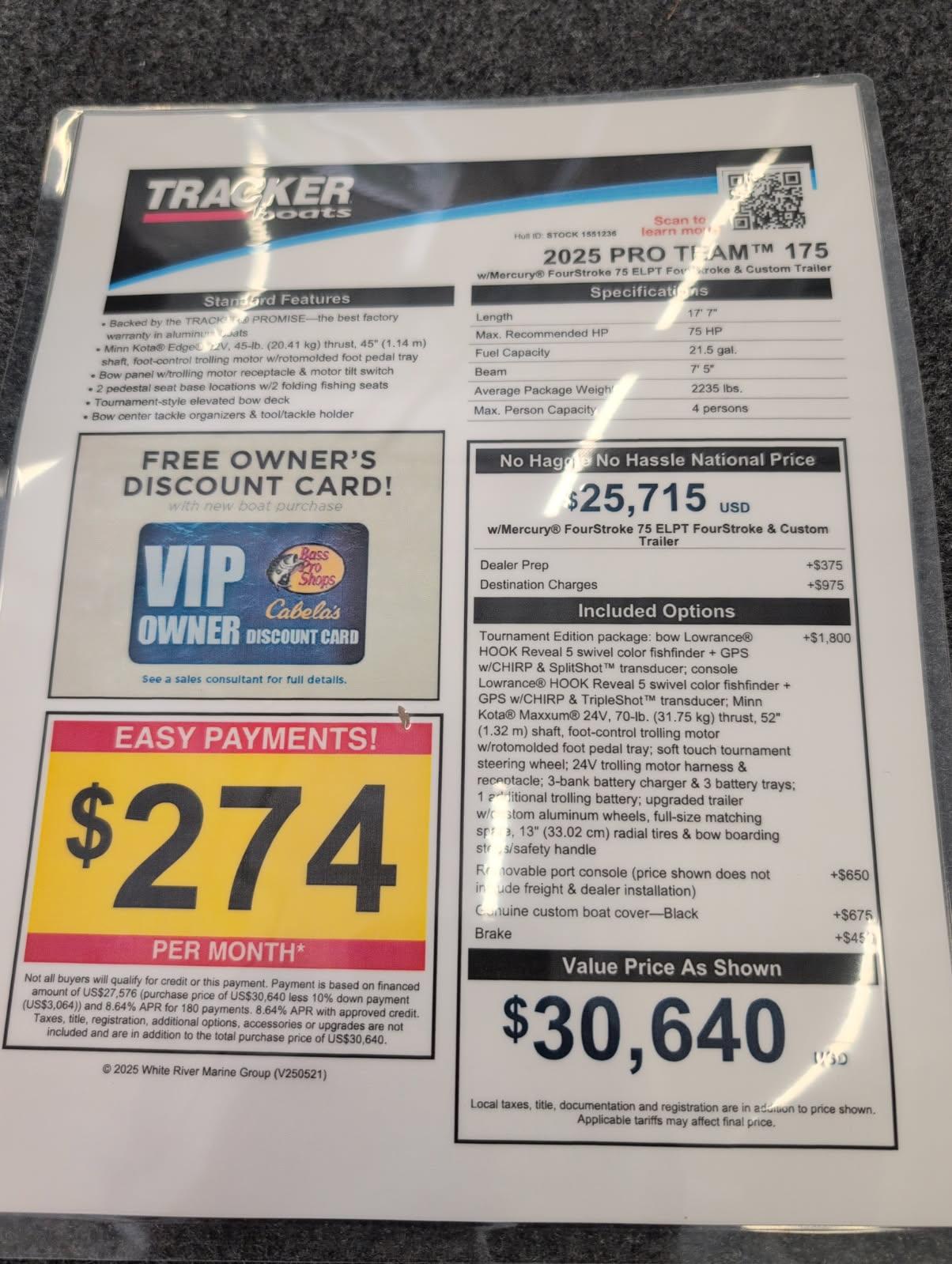 The TRACKER PRO TEAM 175® is one of the most value- and feature-packed boats in the TRACKER stable, and also one of our most popular models. All-welded construction offers superior strength that carries huge decks, abundant storage, and a 21-gallon aerated, divided, and timed livewell. Motivation comes by way of reliable, economical Mercury® power designed for years of exciting performance. The cosole features a TRACKER touchscreen display that keeps an eye on your outboard and more, a Lowrance Hook color fishfinder, and sturdy, responsive steering. With a proven legacy and untold scores of fish caught, the TRACKER PRO TEAM™ 175 delivers tournament-ready fishability and performance with unbeatable value.