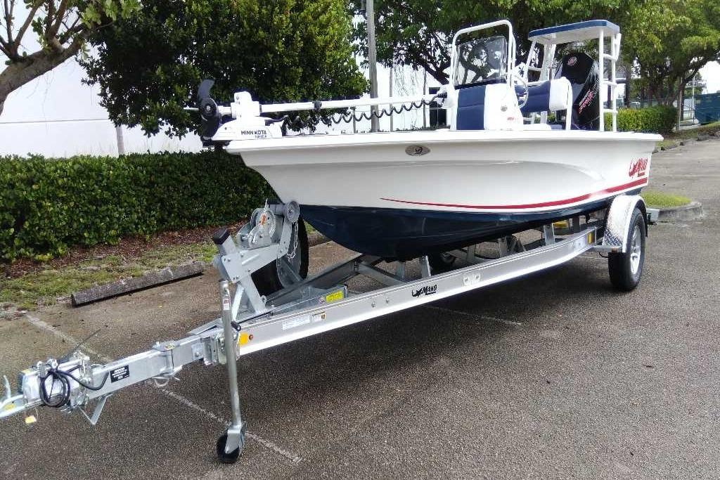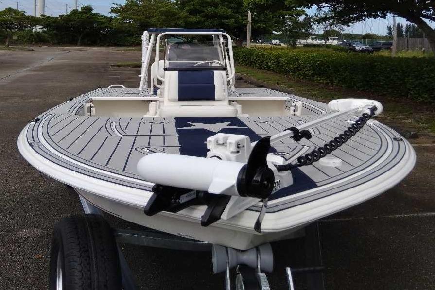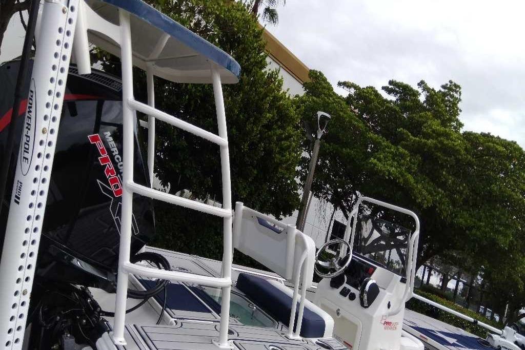 A GPS-enabled Minn Kota® Riptide trolling motor with I-Pilot® control keeps you “anchored” in position in current, wind, and waves while the 175HP Mercury® ProXS meshes with trim tabs to deliver sizzling performance and a smooth ride across chop. At the helm, a 7” Sharktooth™ digital gauge is standard and complements the Wet Sounds® four-speaker stereo. Rounding out this special edition is a custom patriotic color scheme and decking with a saltwater-ready trailer tailor-made for the hull that sits on it. Become the envy of the flats and terror of the fish in the 18 Pro Skiff Patriot Edition.