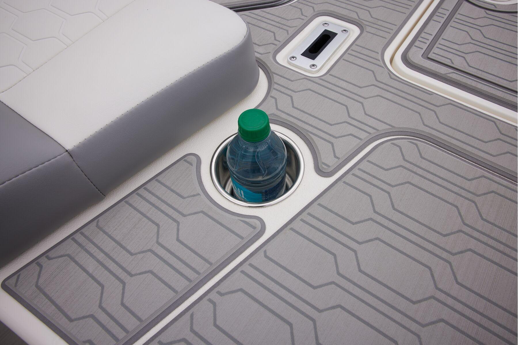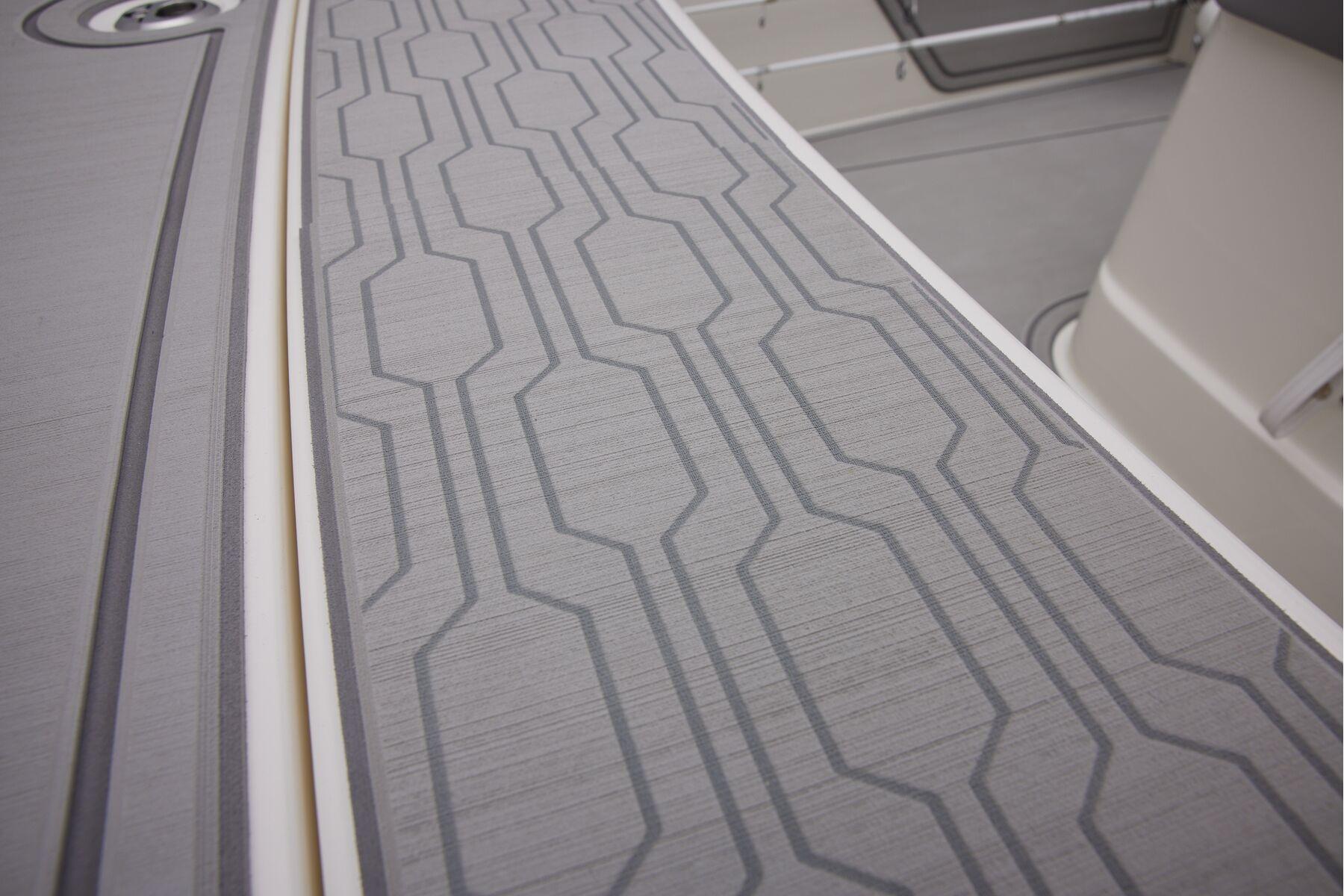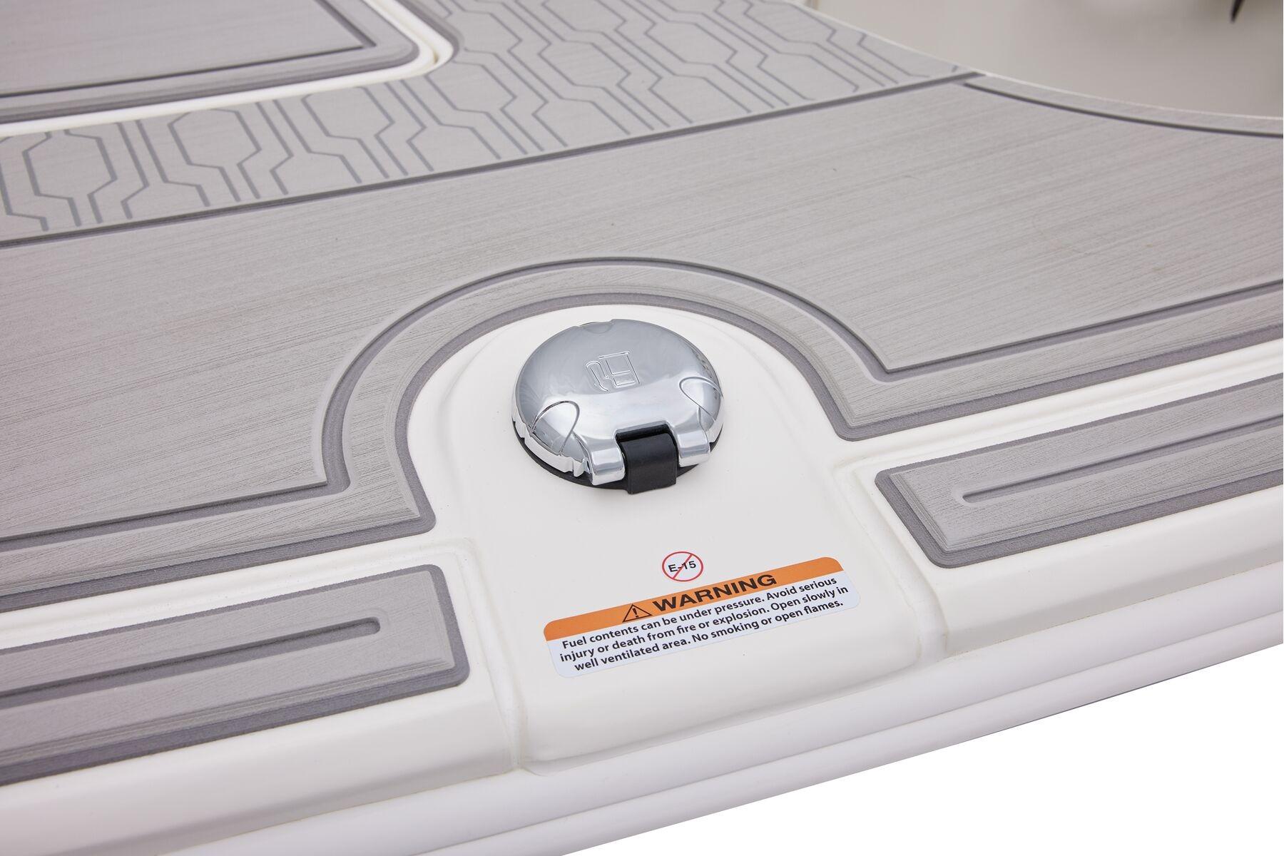 • 1-piece gelcoated fiberglass deck liner injected w/expanding closed-cell foam for flotation, added strength & a quiet ride