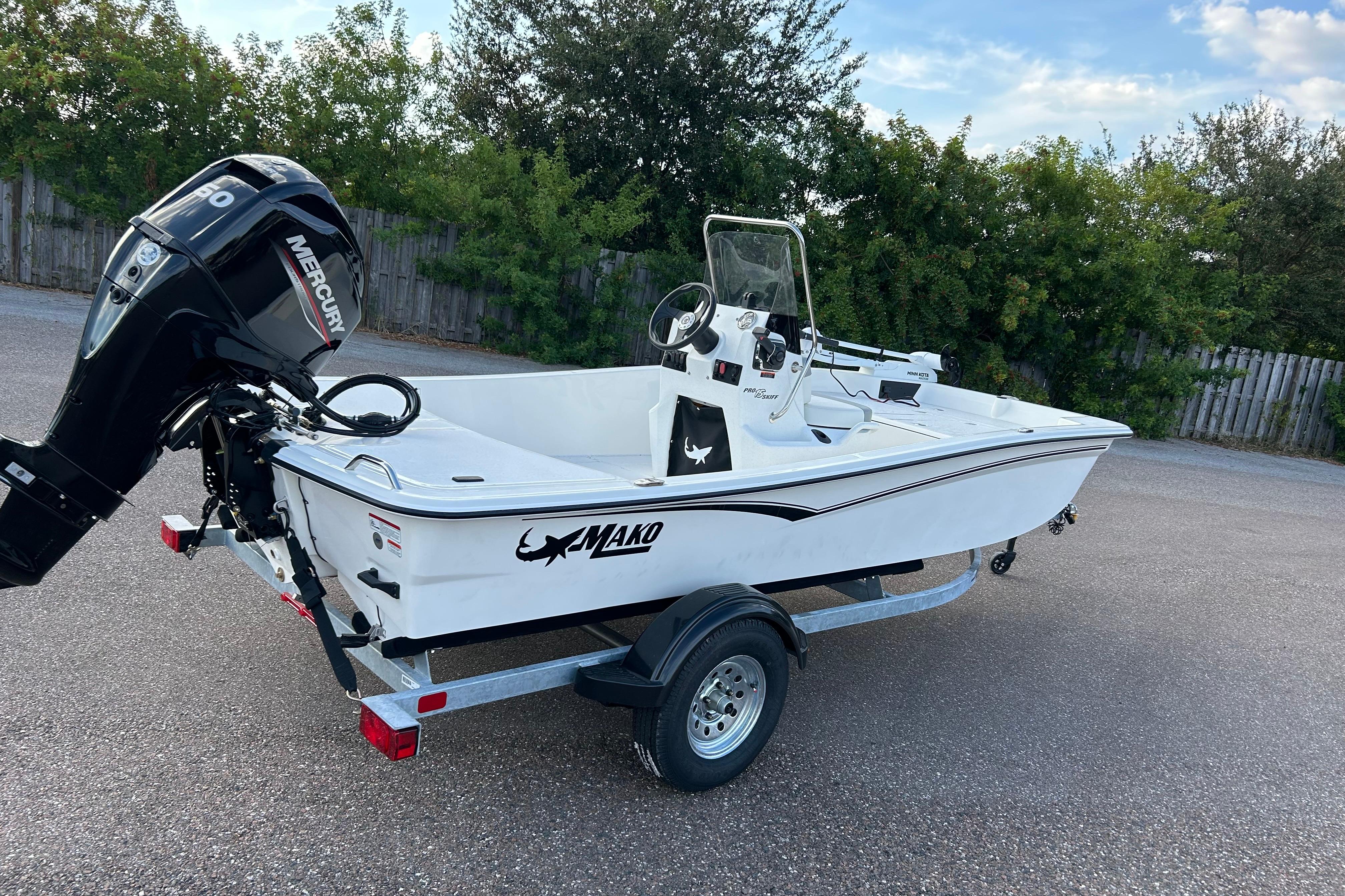 Color - White Lowrance® Eagle 5 w/SplitShot. Minn Kota® Riptide® 12V, 55-lb. thrust, 42" shaft (INCLUDES battery & dealer installation). Hydraulic steering. Stainless steel propeller. Spare tire. Mercury Smart Craft Connect Mobile.