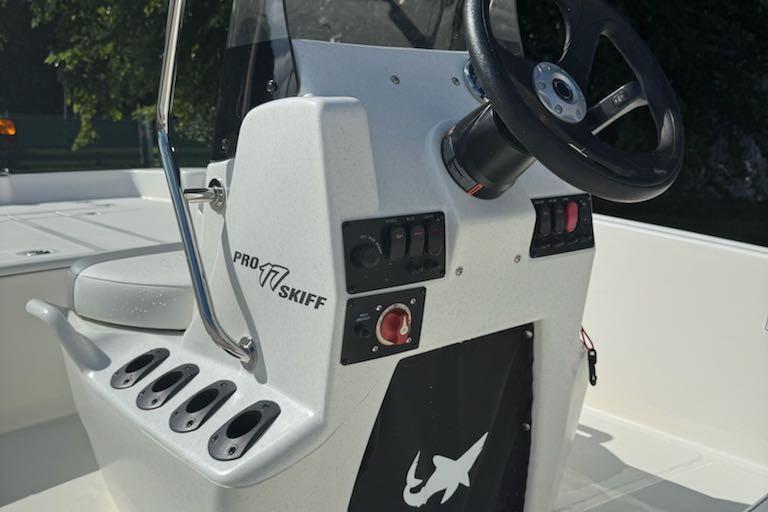 The Pro Skiff 17 CC is a hardcore fishing machine with refined manners for all-day comfort. Five rod holders, a bow anchor stow, huge lockable in-deck storage box, and twin baitwell/livewells let you carry everything you need for a day of casting or cruising. An optional rugged trolling motor and fishfinding electronics lead the way to the day’s catch, while the standard FourStroke Mercury® outboard delivers reliable power in all conditions. Rounding out this capable inshore performer is a saltwater-ready trailer that’s tailor-made for this hull that delivers safe and solid on-road performance mile after mile.