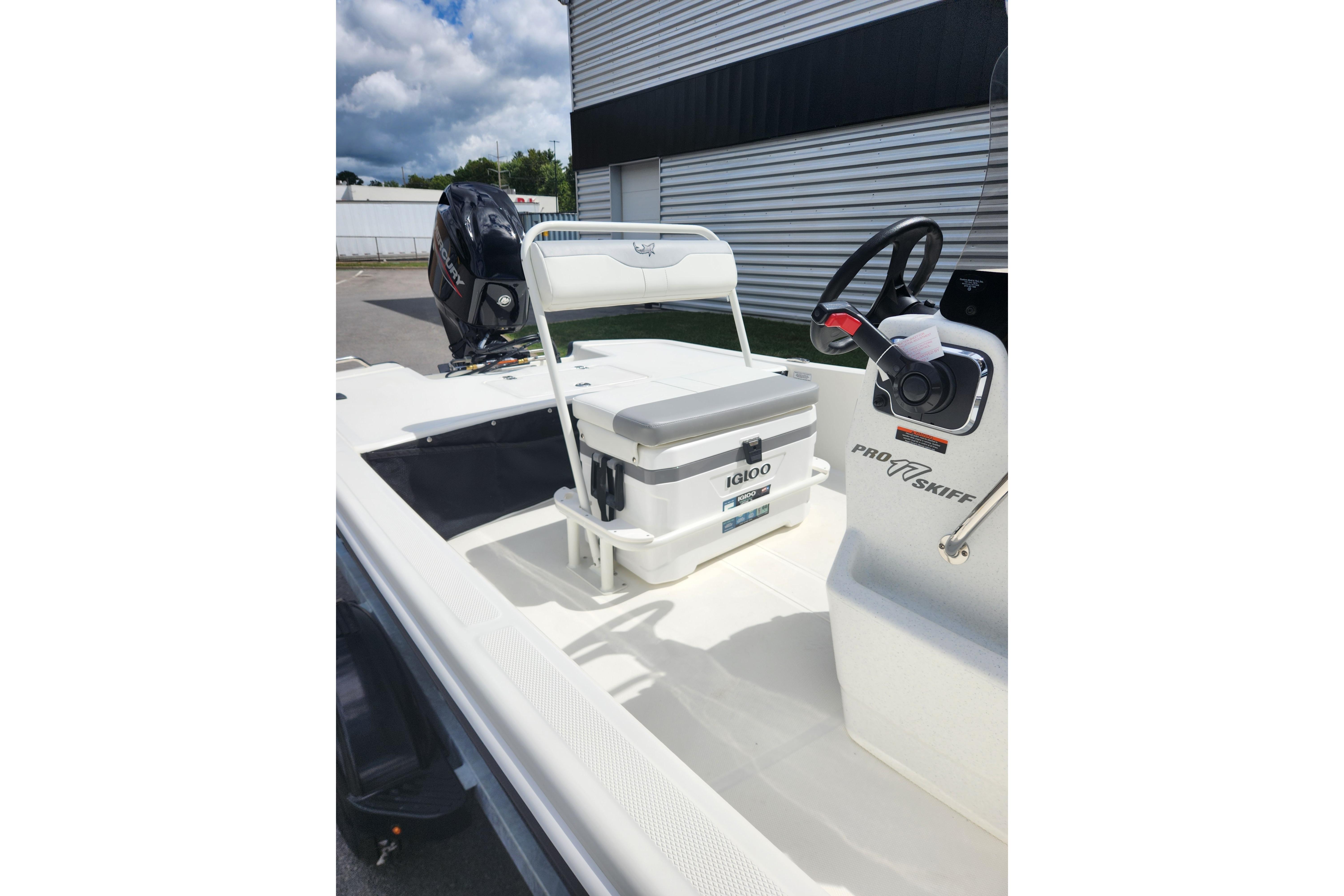 The Pro Skiff 17 CC is a hardcore fishing machine with refined manners for all-day comfort. Five rod holders, a bow anchor stow, huge lockable in-deck storage box, and twin baitwell/livewells let you carry everything you need for a day of casting or cruising. An optional rugged trolling motor and fishfinding electronics lead the way to the day’s catch, while the standard FourStroke Mercury® outboard delivers reliable power in all conditions. Rounding out this capable inshore performer is a saltwater-ready trailer that’s tailor-made for this hull that delivers safe and solid on-road performance mile after mile.