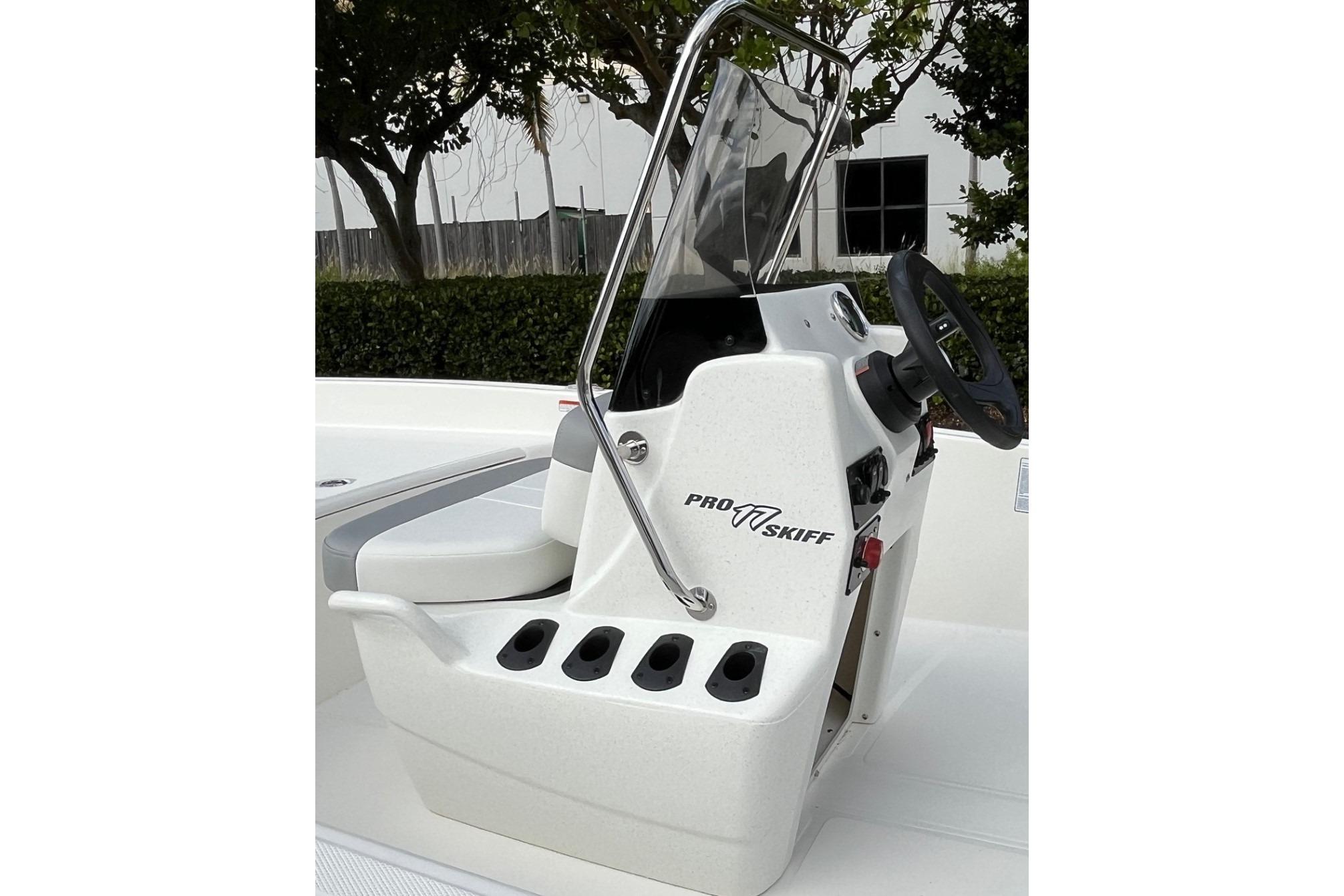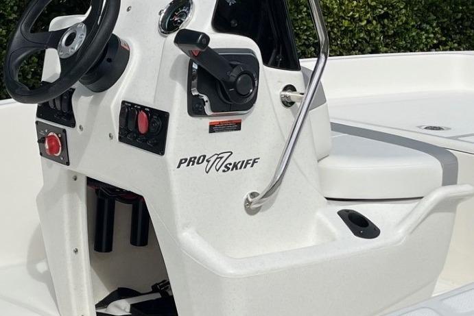 The Pro Skiff 17 CC is a hardcore fishing machine with refined manners for all-day comfort. Five rod holders, a bow anchor stow, huge lockable in-deck storage box, and twin baitwell/livewells let you carry everything you need for a day of casting or cruising. An optional rugged trolling motor and fishfinding electronics lead the way to the day’s catch, while the standard FourStroke Mercury® outboard delivers reliable power in all conditions. Rounding out this capable inshore performer is a saltwater-ready trailer that’s tailor-made for this hull that delivers safe and solid on-road performance mile after mile.