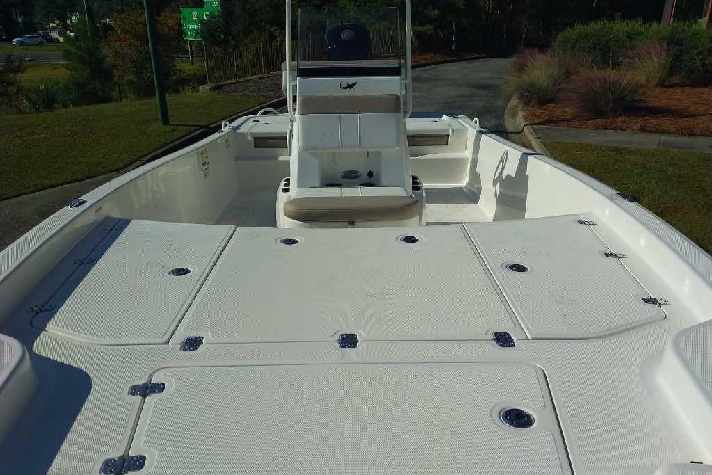 The biggest Pro Skiff in our lineup boasts a best-of-the best features set for all-out inshore and nearshore domination. A 150HP rating and 30-gallon fuel capacity give you extra range to go farther and hit more spots, while the finely tuned Advanced Invited V (AIV) hull delivers a smooth, dry ride and a superior draft. The massive front deck includes three lockable storage compartments equipped with gas-assist lift struts, stainless hardware, and a bow anchor locker/storage compartment.