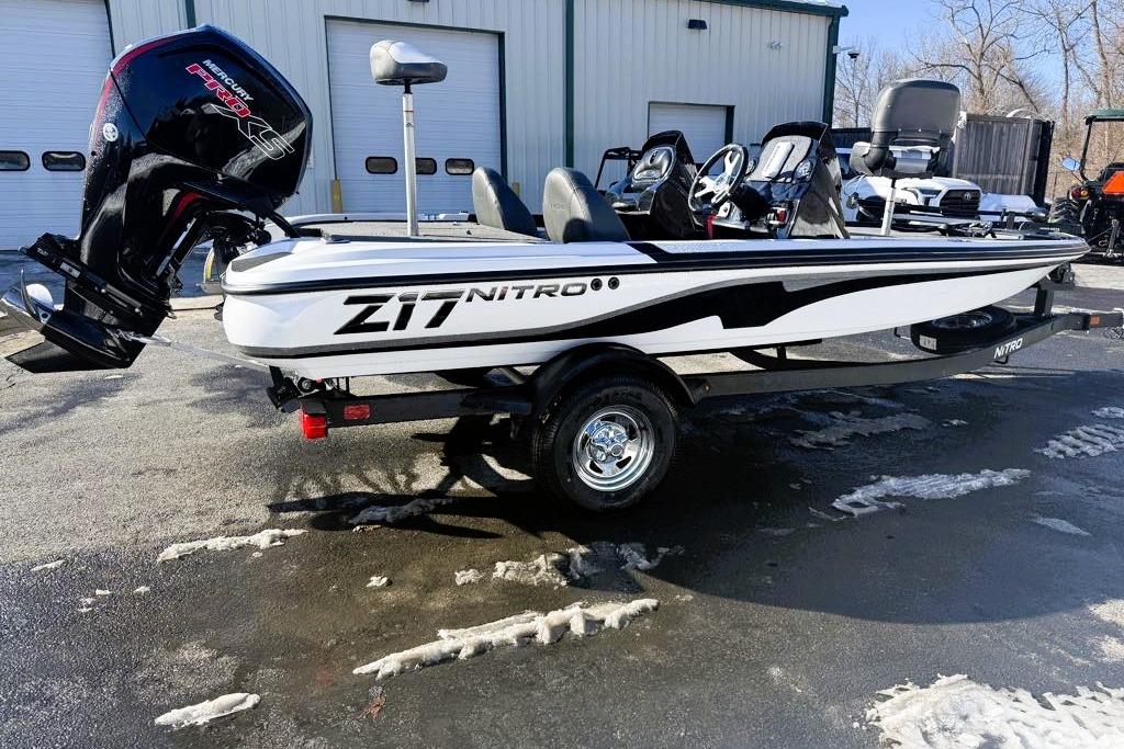 The NITRO® Z17 offers smooth, economical performance in a nimble size that's easy to tow, stow, and own. Reliable power from a FourStroke Mercury® outboard stands by to ramp up the fun with the jab of the throttle, while the NITRO® NVT™ hull offers quick planing and acceleration with on-rails handling at speed. The wide beam offers room for multiple anglers, stability in all conditions, and a world of storage beneath the decks. Lockable rod lockers carry sticks up to 7'6", while dedicated tackle stows in the rear deck keep boxes organized, dry, and readily accessible. The helm features a standard Lowrance® fishfinder, a full gauge set, and reliable switching for maximum convenience. Underneath the Z17 is a custom-fitted trailer made just for the hull it's carrying that promises years of smooth and hassle-free trailering. The Z17 is the perfect value- and feature-packed package that won't break the bank, but help you put checks in it.