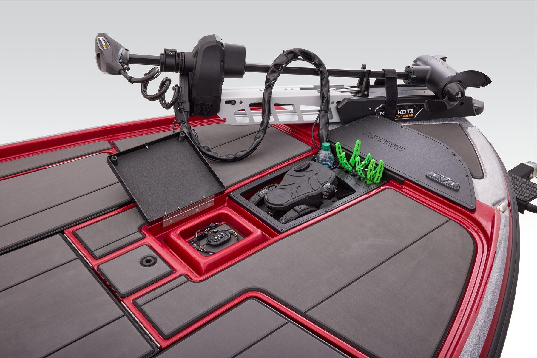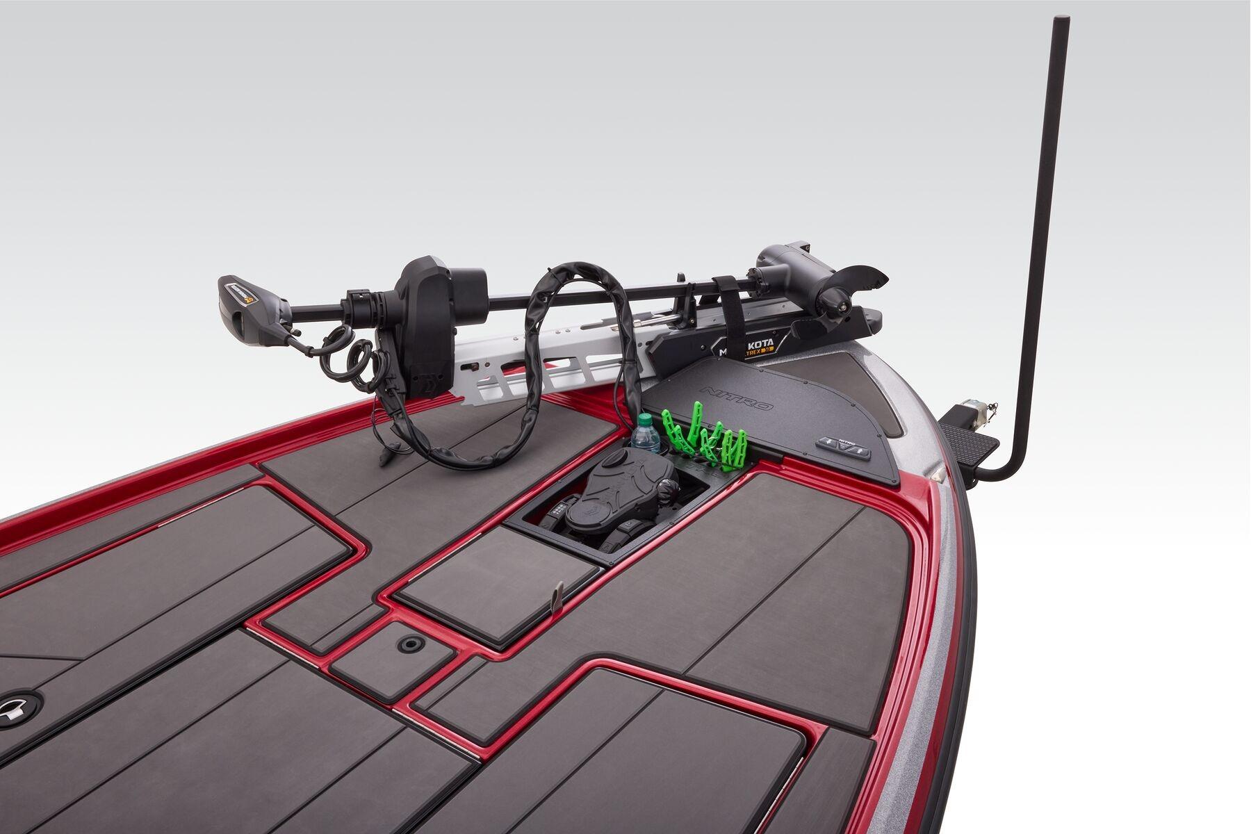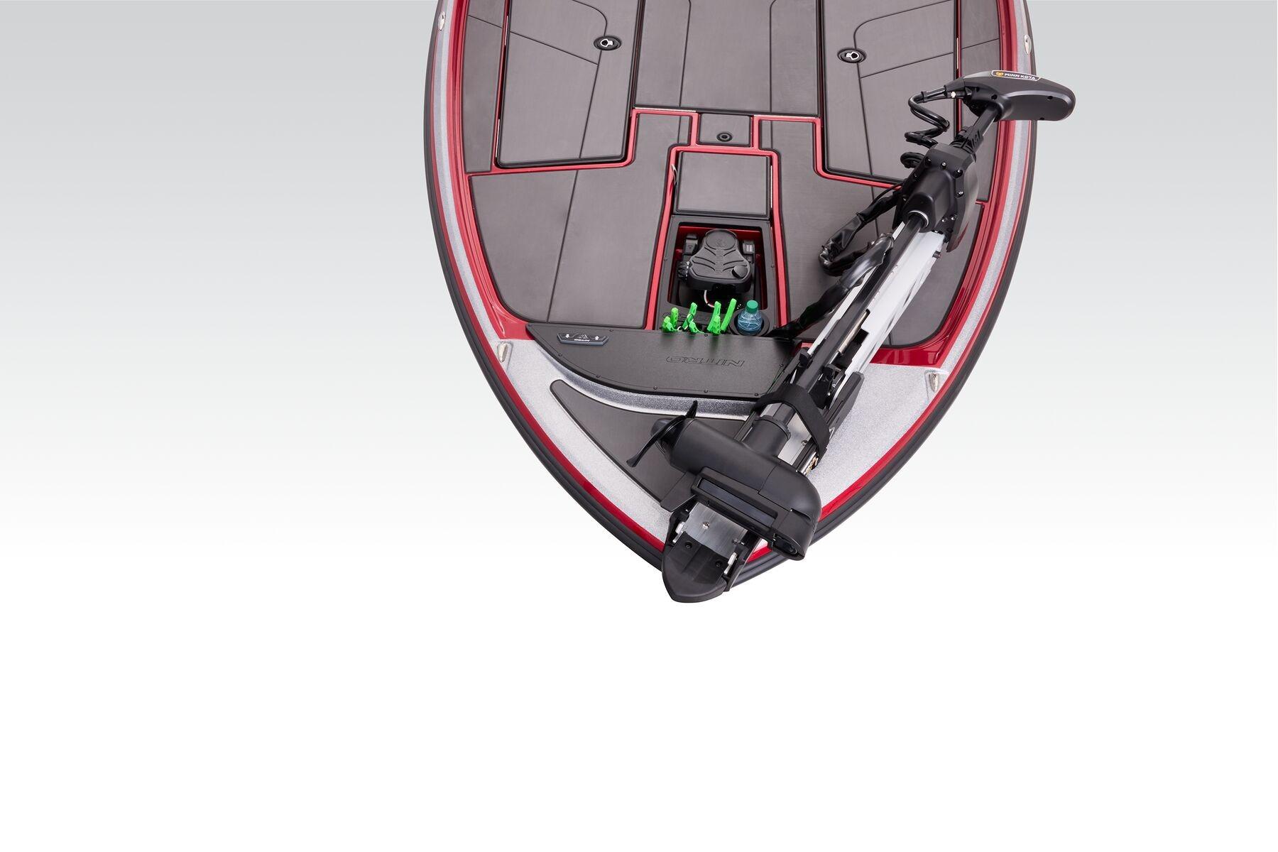• Angled bow panel w/trolling motor receptacle, anchor/light switch, trim switch & capability to flush mount most 12" (30.5 cm) fishfinders